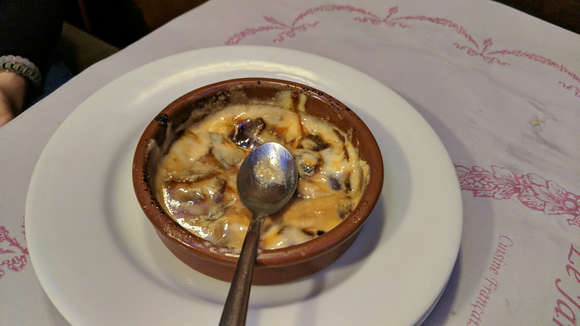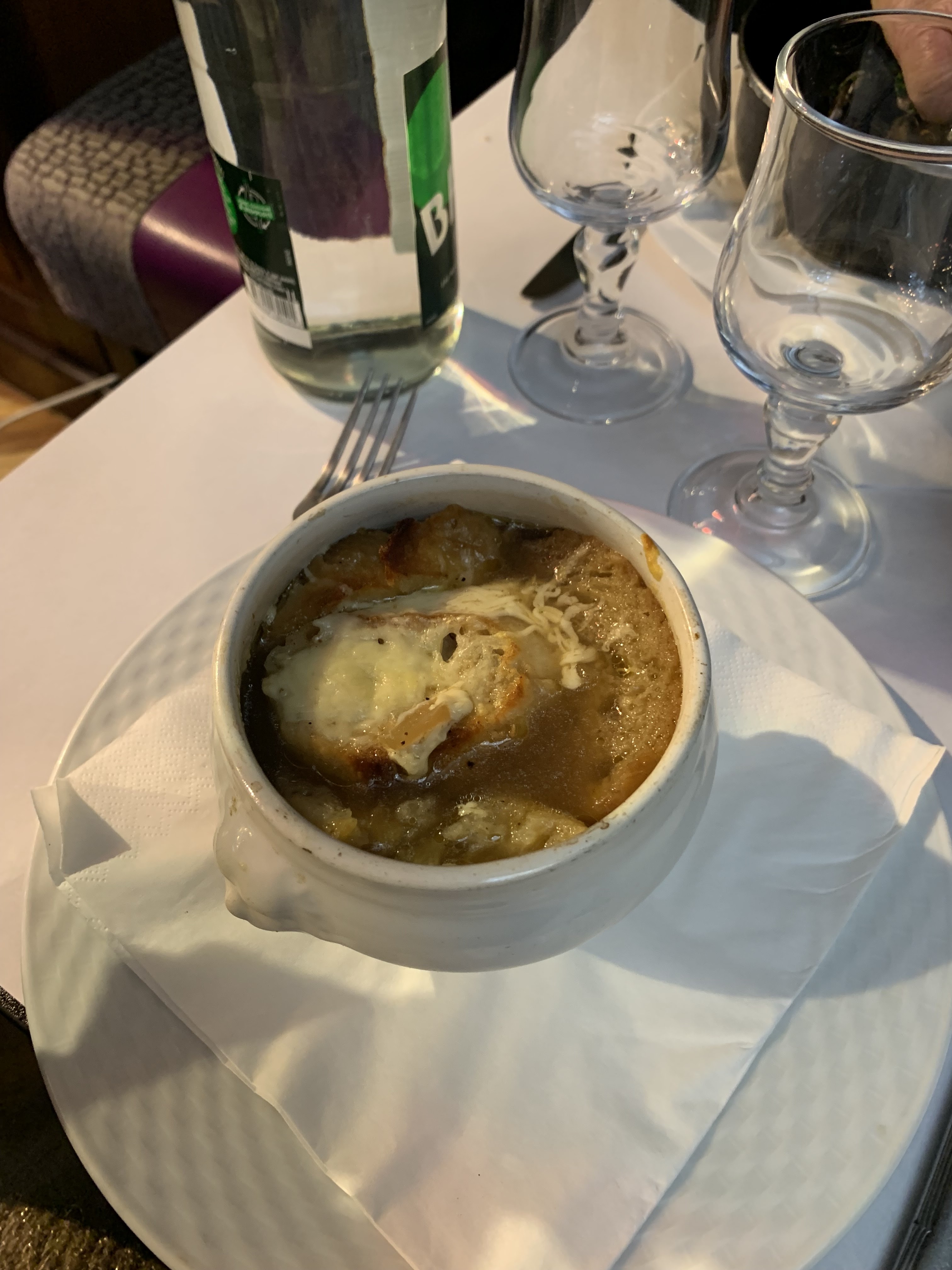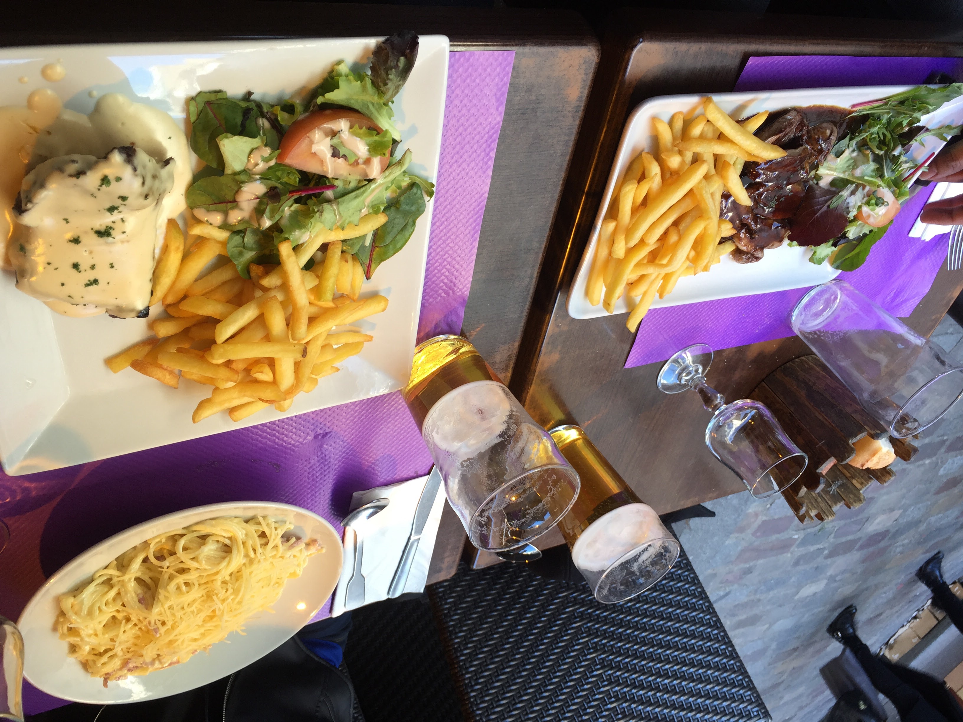 La soupe à l'oignon avait le goût de l'eau de vaisselle, le burger des enfants était brûlé, les moules étaient trop cuites dans une saumure piquante, le steak était comme un morceau de cuir de chaussure non salé avec plus de cartilage que la viande, et la fondue était du vomi reconstitué… mais les pommes de terre bouillies étaient parfaites…. Et le pain n'était pas trop rassis. Le pire repas de Paris.