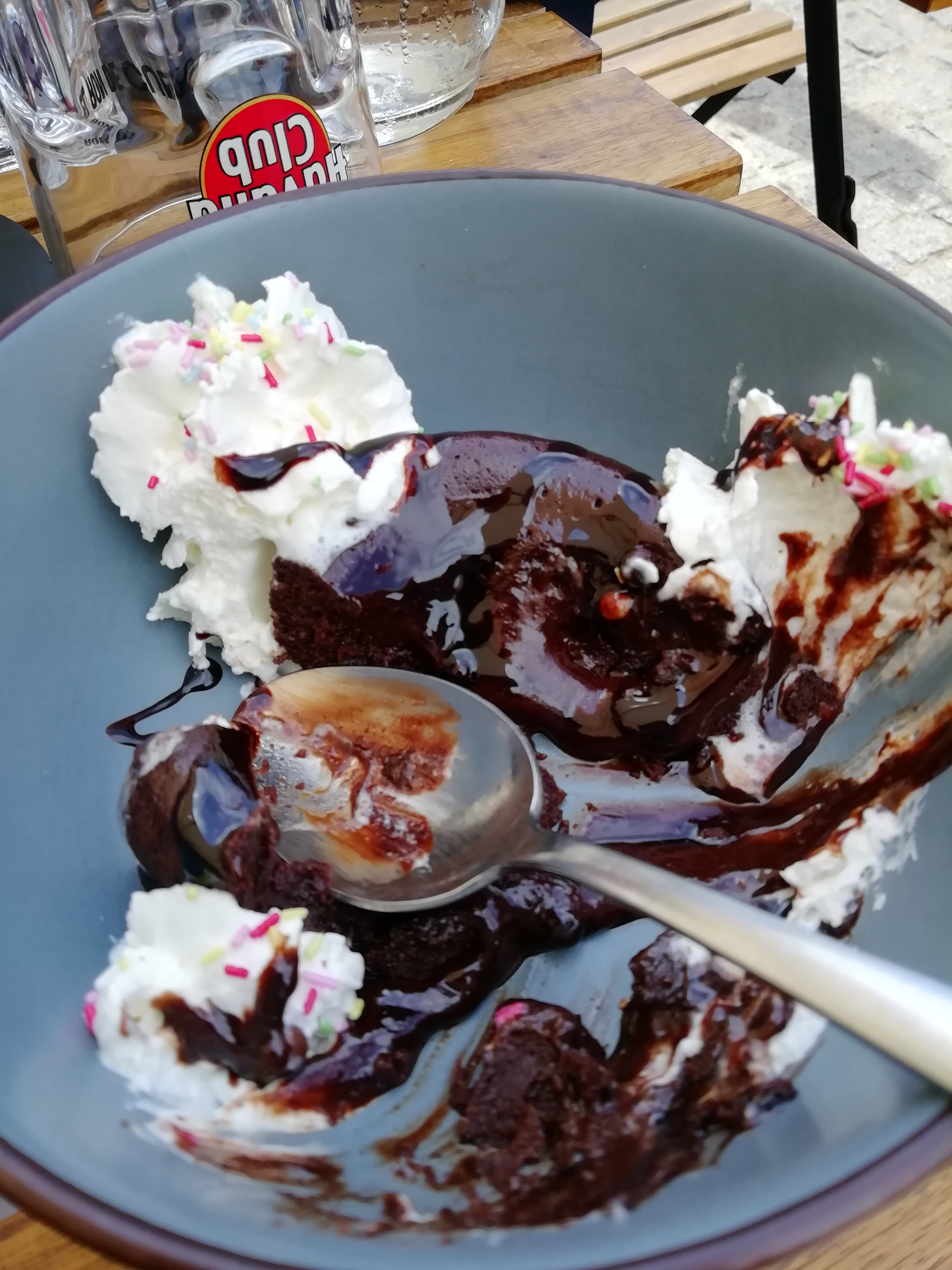 Le croque monsieur était froid au milieu mais la partie chaude était bonne. (La deuxième photo montre toutes les parties froides que j'ai dû laisser de côté) J'ai senti les parties froides et elles étaient glacées, comme s'ils venaient d'avoir un tas de croque monsieurs assis dans le congélateur pour être réchauffés. L'ambiance était correcte (nous nous sommes assis dans le jardin à l'arrière) mais ils diffusaient de la musique forte juste à côté de notre table. Dans l'ensemble, c'était assez décevant et je suis sûr qu'il existe d'autres endroits à Carcassonne qui vous offriraient une meilleure expérience.