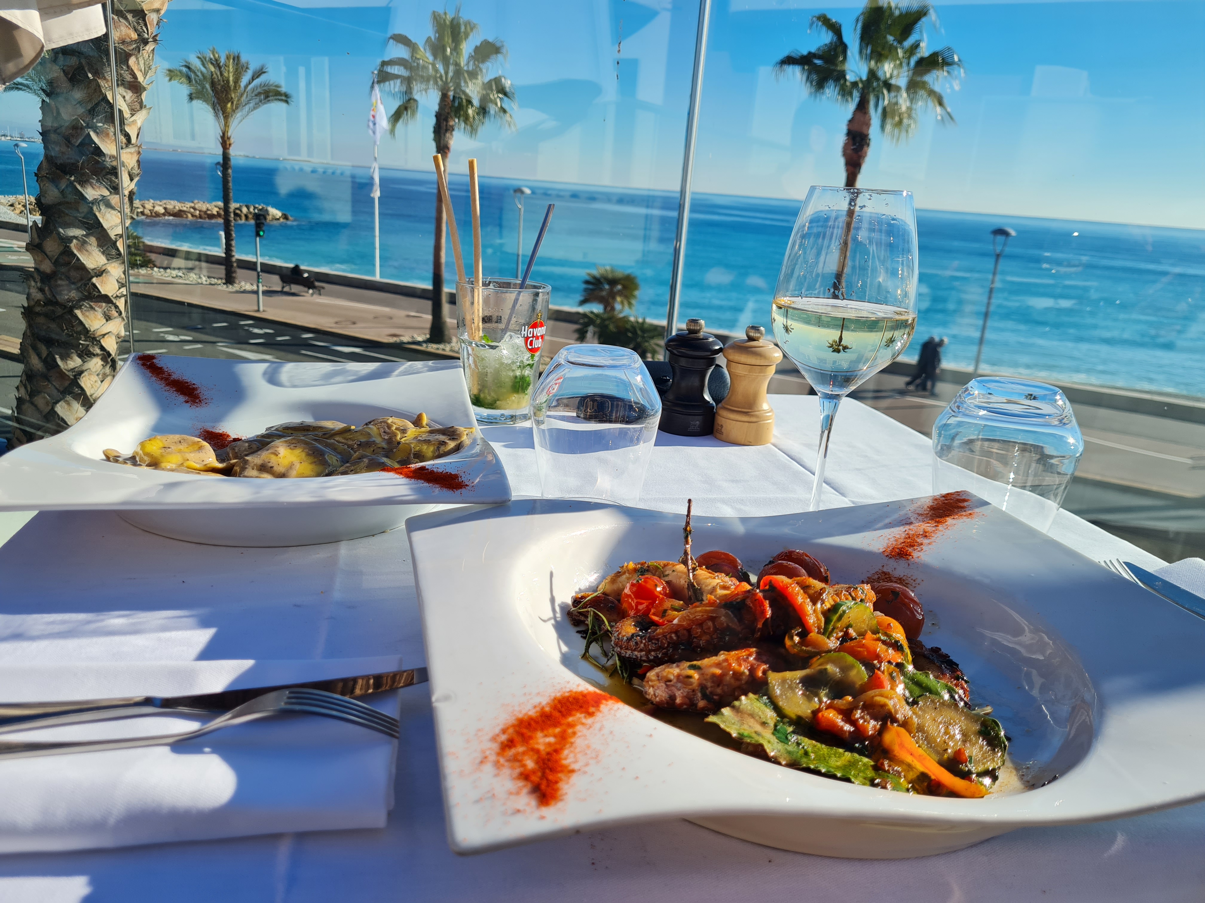Le cadre est très chouette avec une terrasse en hauteur qui domine la mer et permet de ne pas voir la circulation sur le boulevard de la mer juste dessous. Tables avec nappe et pas de serviette en papier on est dans un décor un peu classe et la cuisine est vraiment bonne. En prime un soleil quasi de plomb fin janvier.