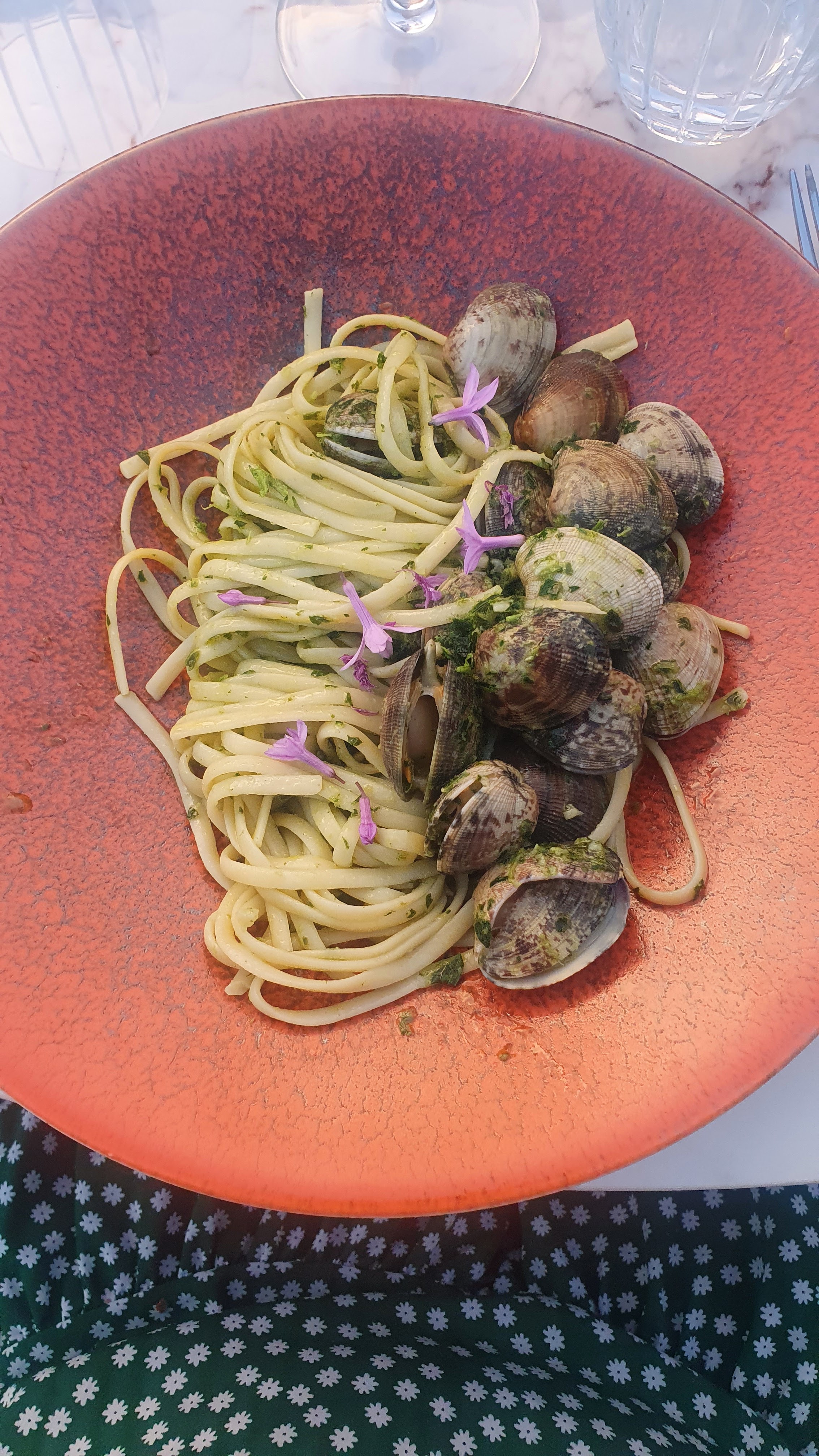 Linguini aux palourdes tellement cuits qu’on a mangé des chips de palourdes. Salade au thon cru avec du thon petit navire premier prix. Poitrine de cochon passable. Bref nullissime.