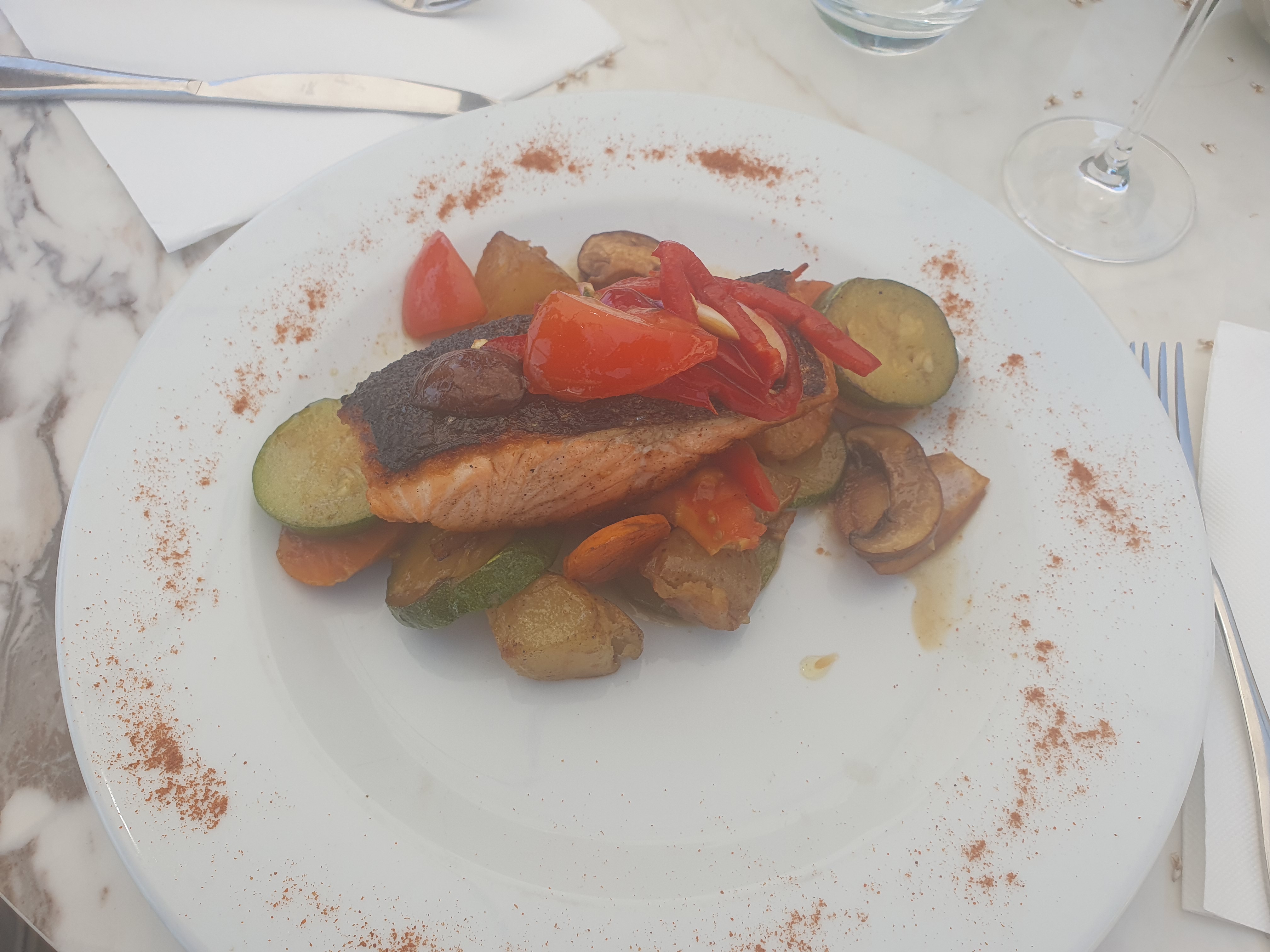 J ai choisi ce restaurant pour sa terrasse avec vue sur mer, terrasse fermée ? Pourtant un beau soleil..... pas de menu végétarien ! Dommage pour un gastro. Vous avez perdu 6 couverts, plus 4 pour l avenir. A éviter.