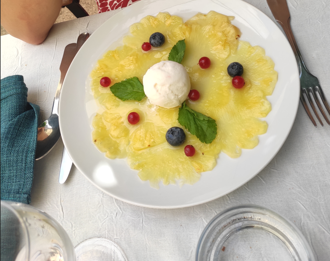 Nous avions réservé une Bouride , ce fut excellent . Le dessert carpaccio d’ananas au rhum arrangé termina cette soirée sur une terrasse au calme. Le personnel est agréable et accueillant.