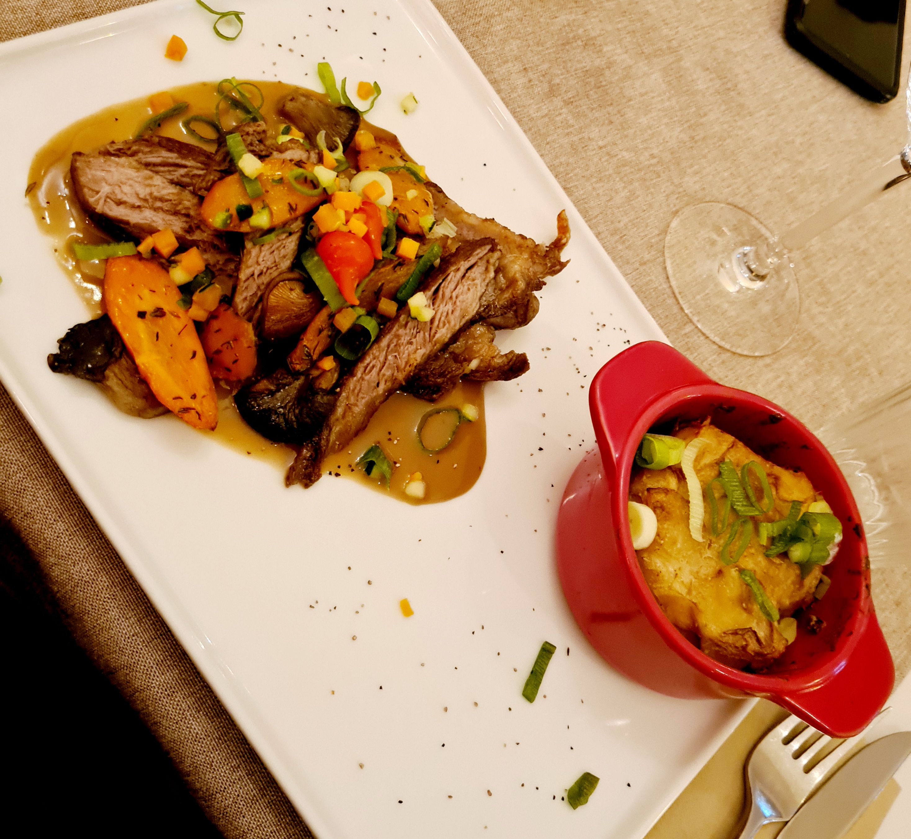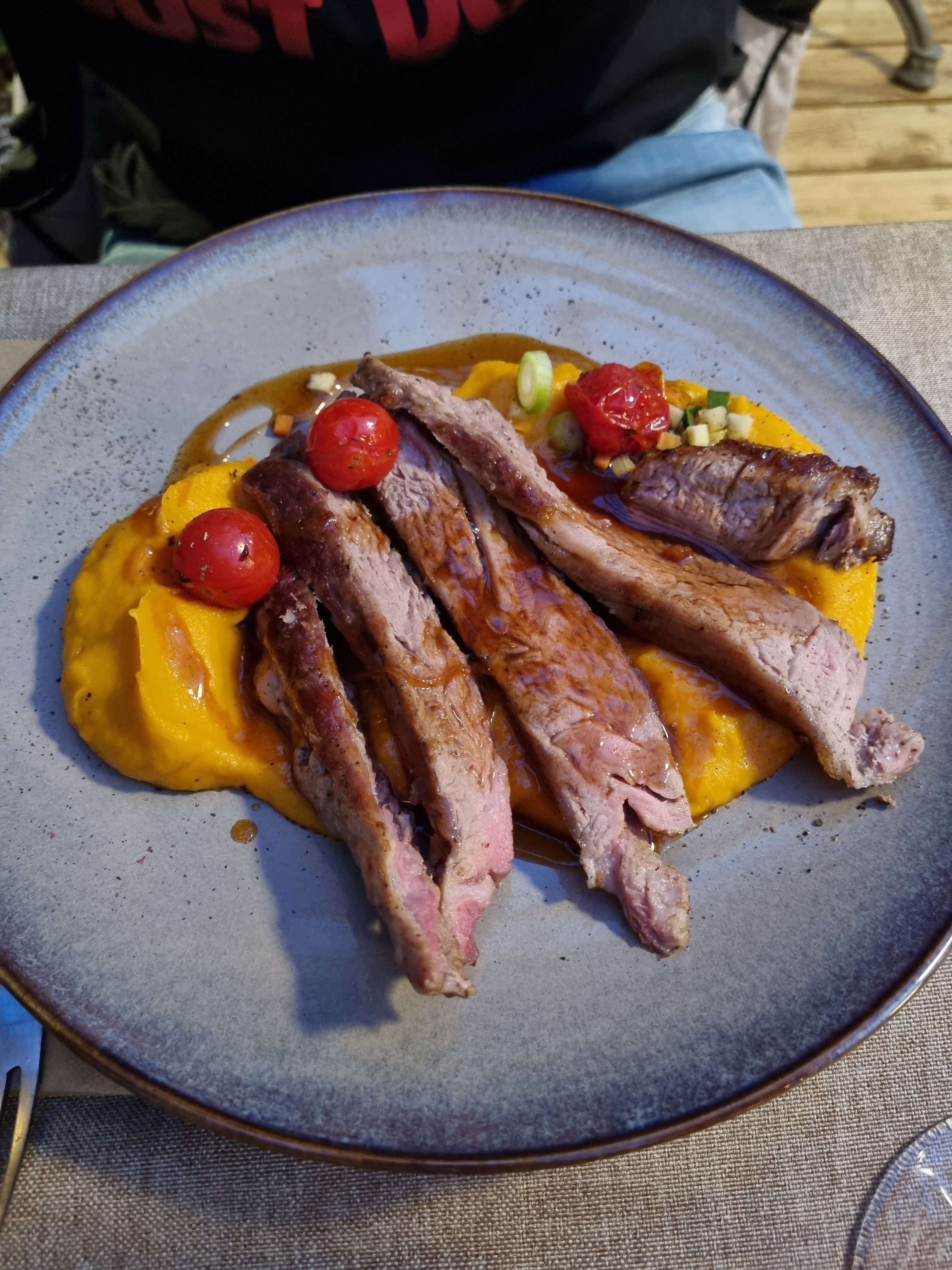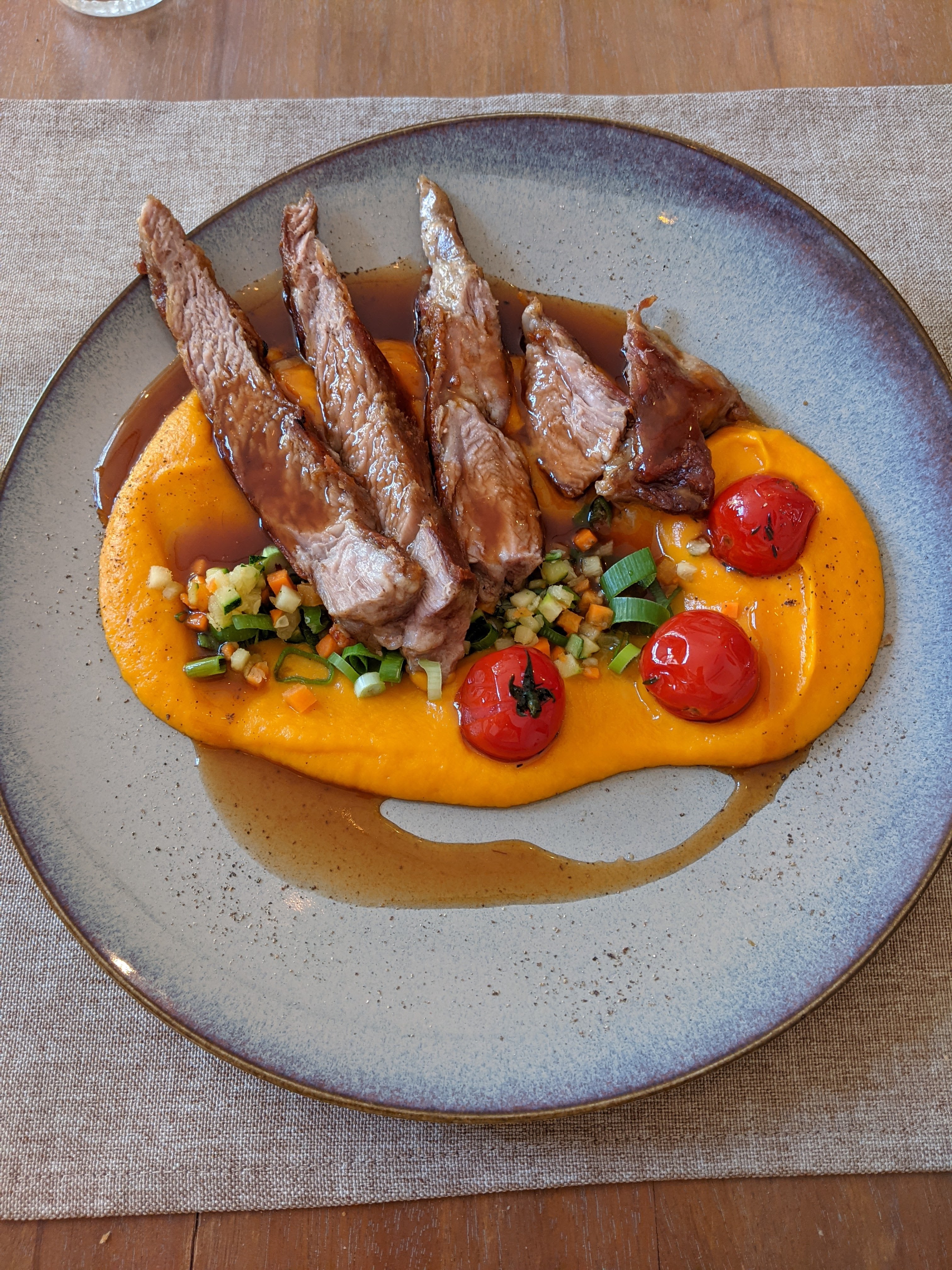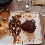Cuisson parfaite du bœuf, tendre et croûte croustillante à l'extérieur. Bon goût de beurre pour la purée de pomme de terre, servie avec un peu de parmesan. L'ensemble marche très bien. Assez cher 25.50 pour un plat mais cadre agréable donnant sur une terrasse et un jardin.