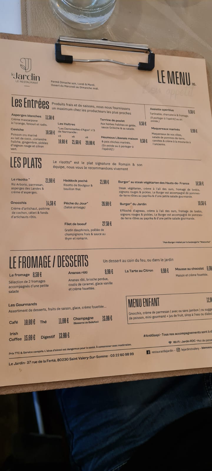 Superbe découverte que le resto « le jardin » à St Valéry sur somme Accueil et service top tout au long du repas, hyper efficace Tempo des plats nickel Quand aux plats : tout fut super bien réalisé Ni trop ni trop peu, un vrai plaisir Cette simple mais efficace Une adresse où aller les yeux fermés et revenir