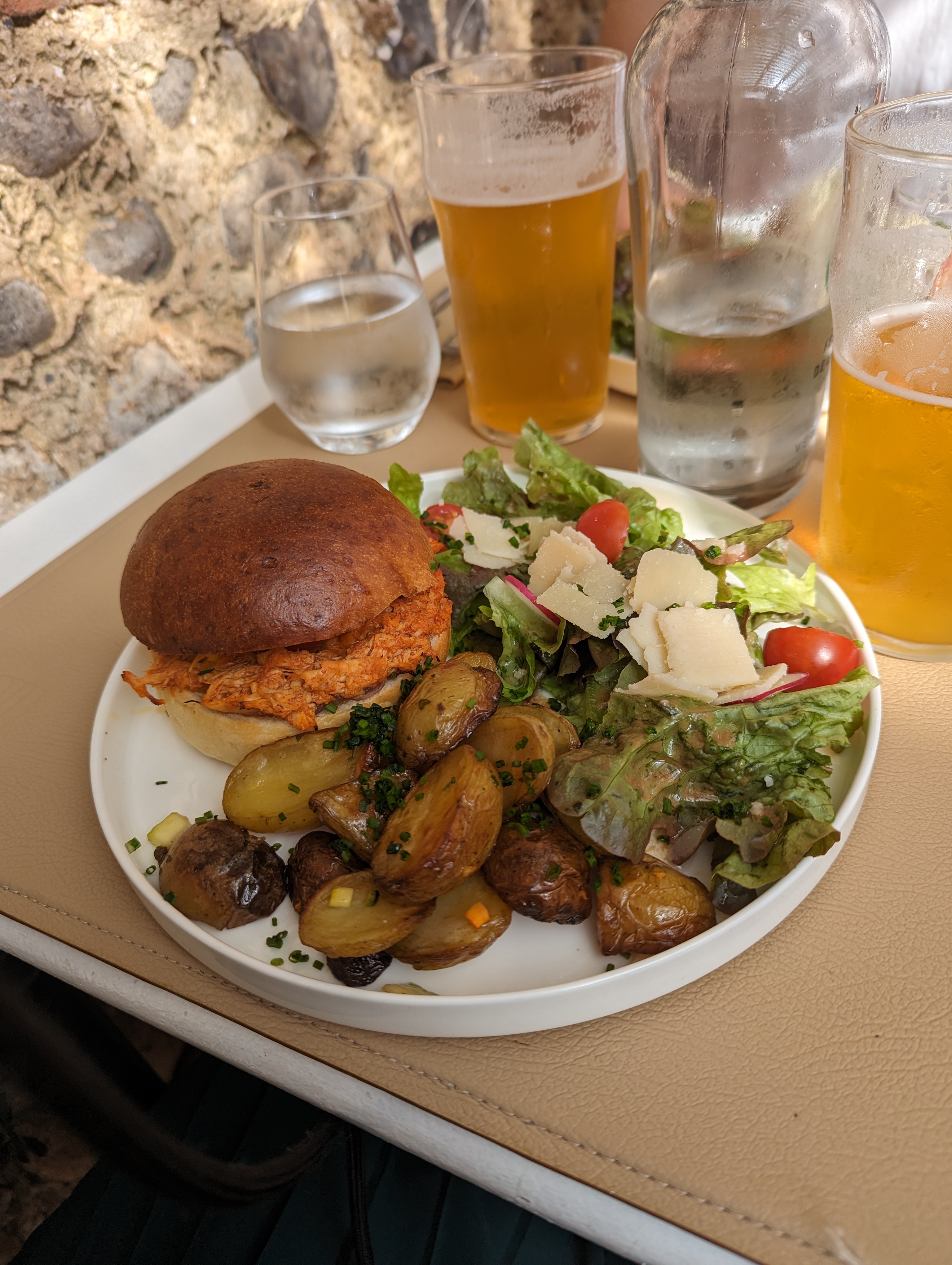 Excellent repas avec le burger à l'effiloché de bœuf et cheesecake / thé gourmand en dessert. Dommage que les assiettes soient si peu garnies, il faut prendre entrée + plat + dessert pour bien manger mais aucun menu n'est proposé donc prévoir le budget. Service soigné. Demandez une table dans la véranda couverte pour avoir la vue sur le joli jardin.
