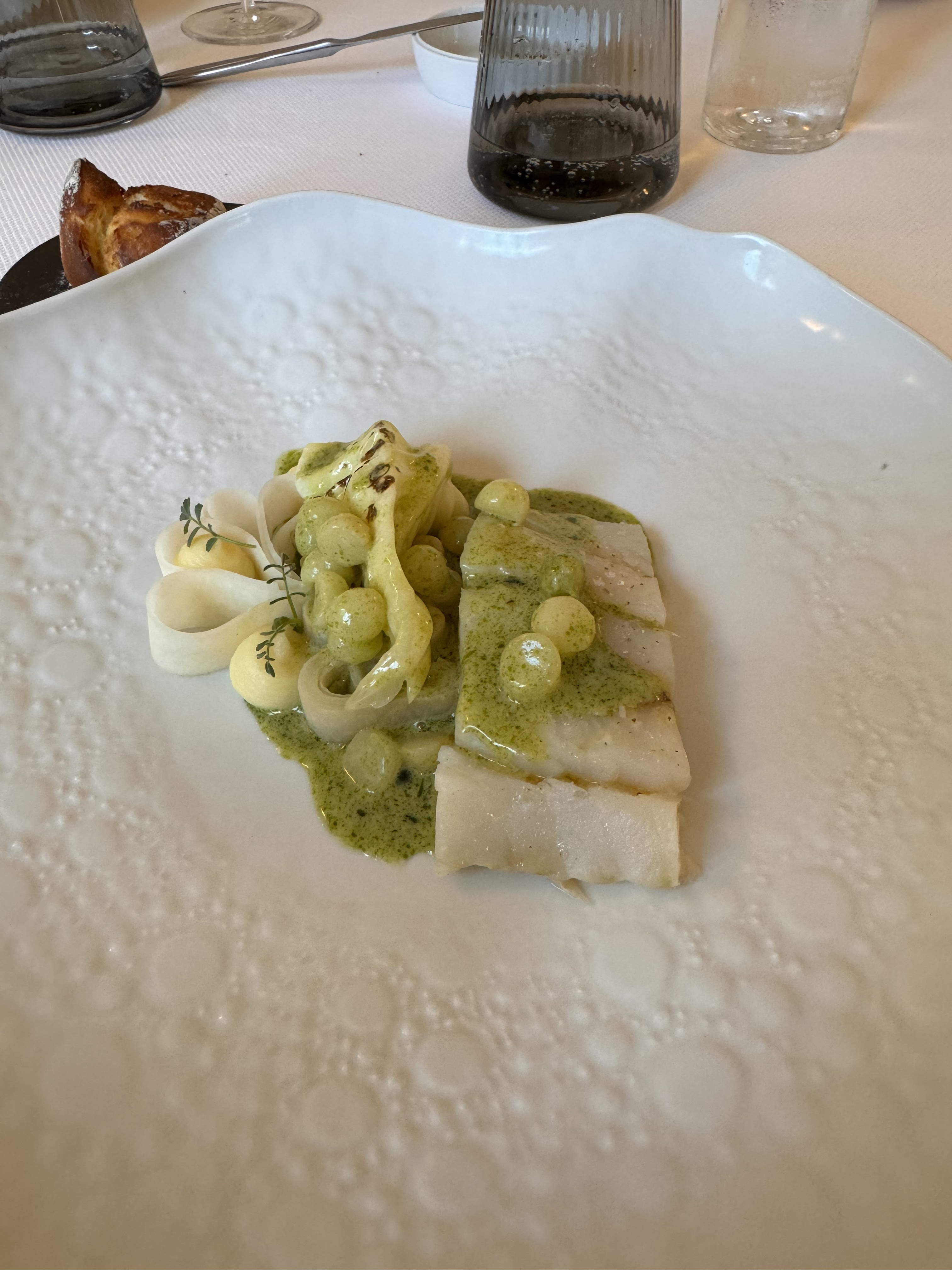 Cuisine très bonne et imaginative, mais l'attente entre les plats est interminable arrivé à 12h30 pour partir à 16h30 plus de 4 heures, cela commence à faire long. Cela peut s'expliquer par le fait que seul un serveur était présent avec 2 jeunes probablement en formation. Pour un restaurant qui propose un menu à presque 70€ le service doit réussir à égaler la perfection des plats servis.