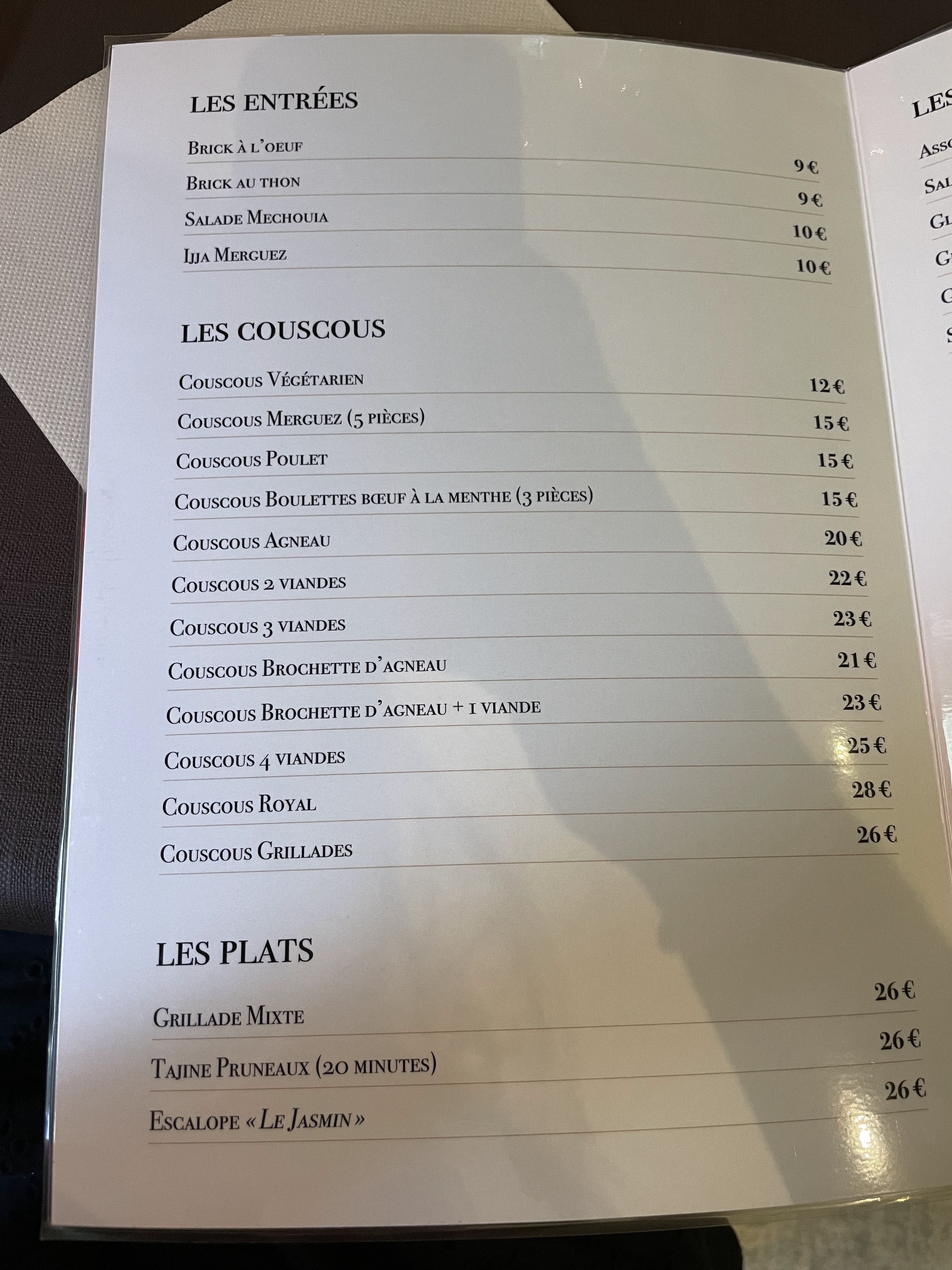 Très très bonne expérience dans ce petit restaurant! Les serveurs (et ou propriétaires ?) sont très accueillants et chaleureux, ils font en sorte qu’on ne manque de rien! Le service a été très rapide. Nous avons évidemment pris un couscous chacun, et ce fut excellent, les viandes sont particulièrement bonnes! (Je mets malgré tout 4 étoiles car je reste fidèle au couscous marocain de mon grand père ) Cependant je conseille fortement cet établissement ! Merci beaucoup à toute l’équipe du Jasmin.