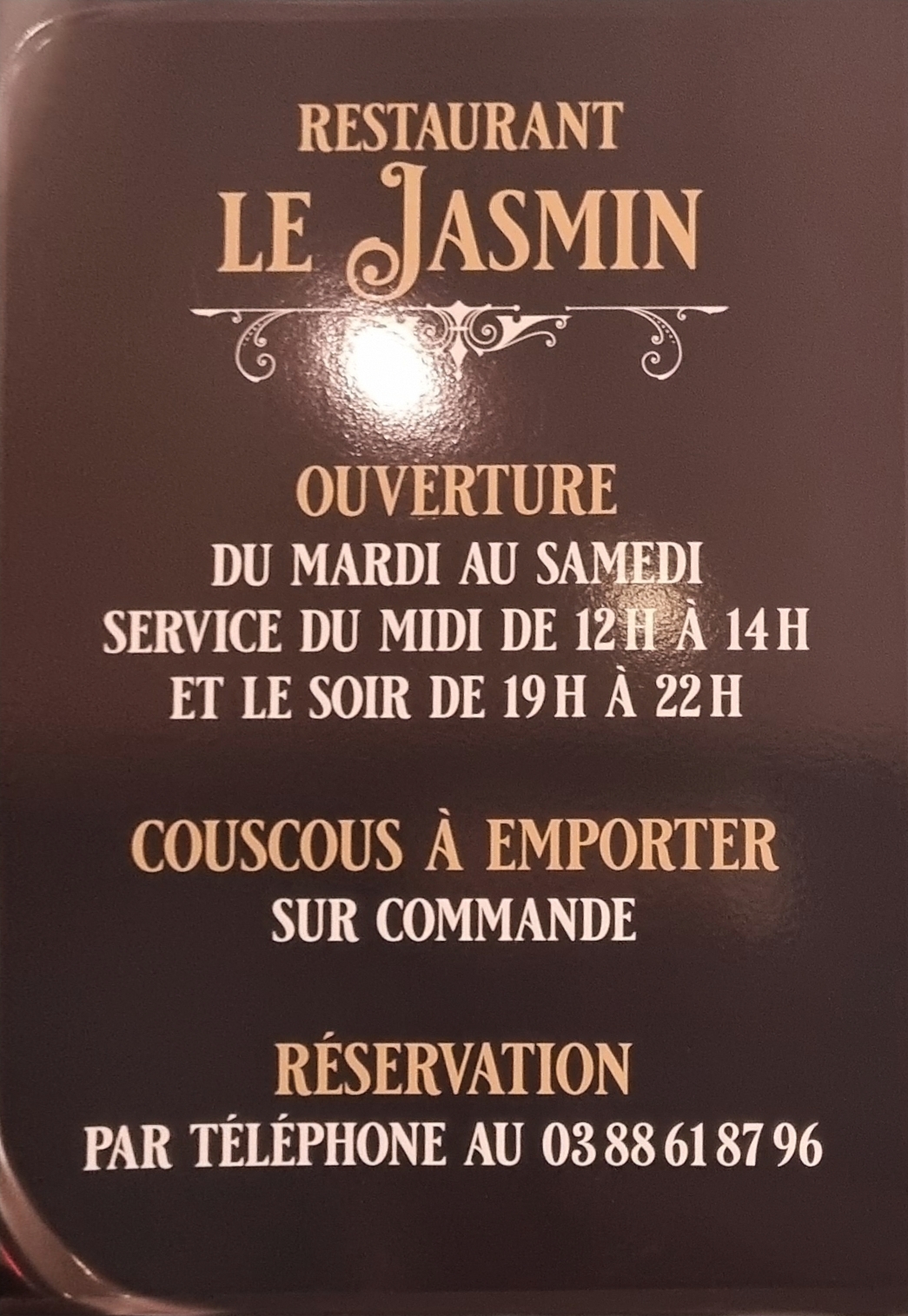 TOUJOURS UN VRAI PLAISIR DE MANGER UN EXCELLENT COUSCOUS ET LES PROPRIETAIRES SONT D UNE GENTILLESSE COMME A LA MAISON ET SURTOUT D UNE GENEROSITE RIEN A VOIR AVEC LES RESTAURATEURS ALSACIEN VOUS POUVEZ VENIR DEPUIS 20 ANNEES MEME PAS UN CAFE OFFERT ALORS QUE LE RESTAURANT LE JASMIN ON NE PEUT QUE REVENIR IL PROPOSE TOUJOURS DU SUPPLEMENT ET SANS PAYER ET TOUJOURS LE THE A LA MENTHE A LA FIN DU REPAS OFFERT ALLEZ Y VOUS NE SERAIT PAS DECU RESERVEZ A L AVANCE CAR LE RESTAURANT EST VITE COMPLET