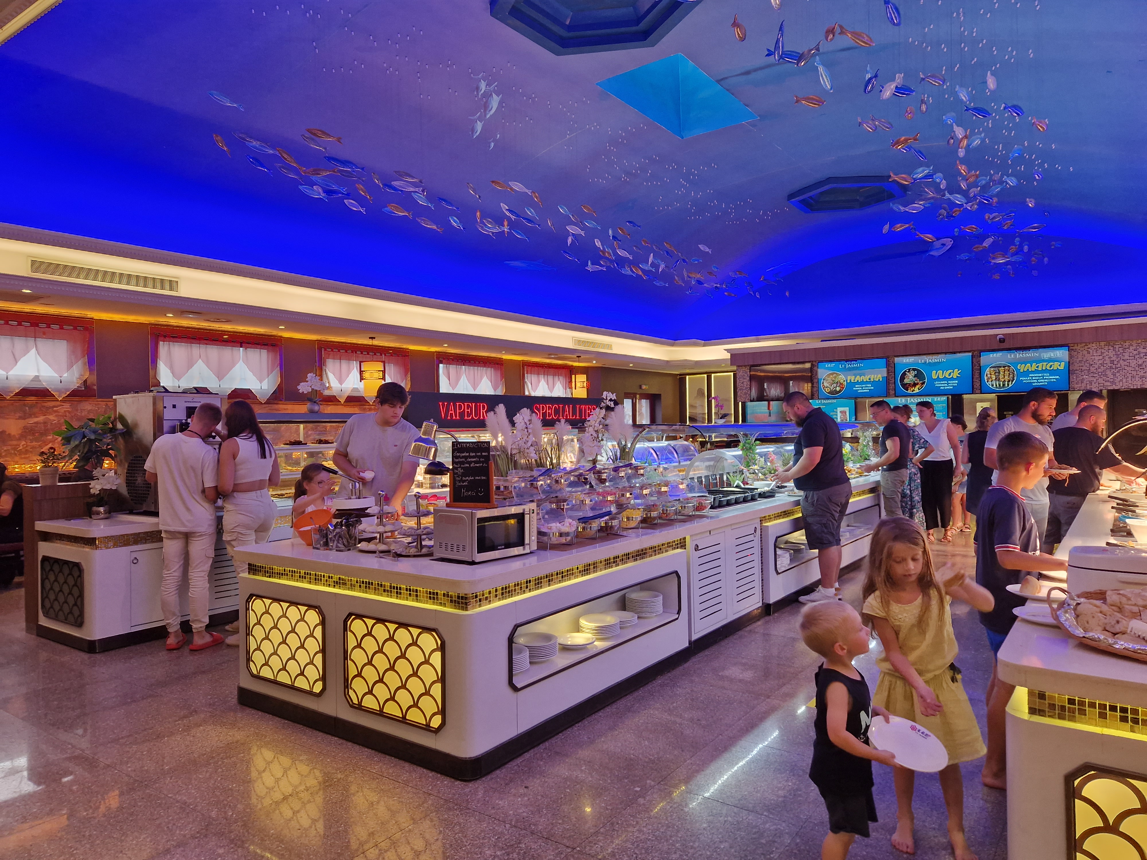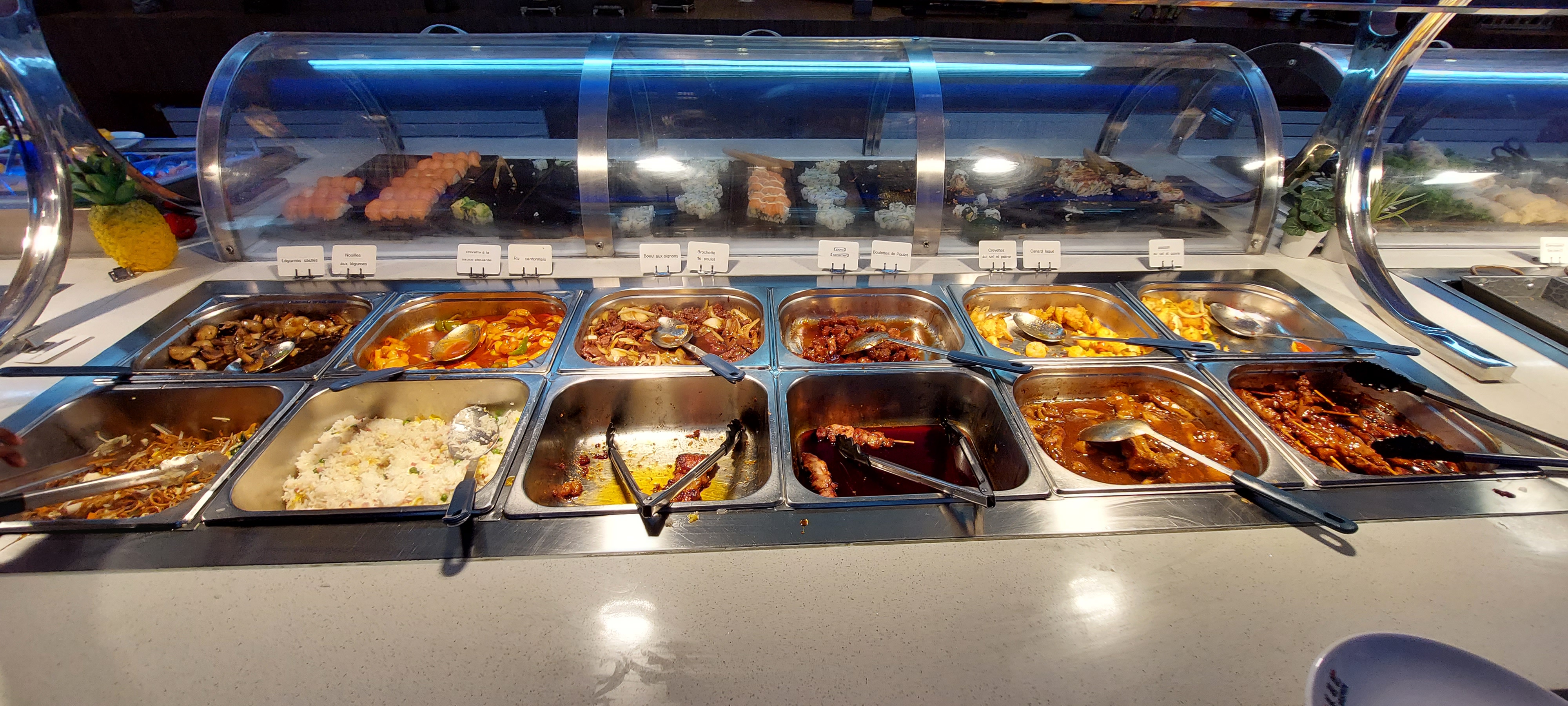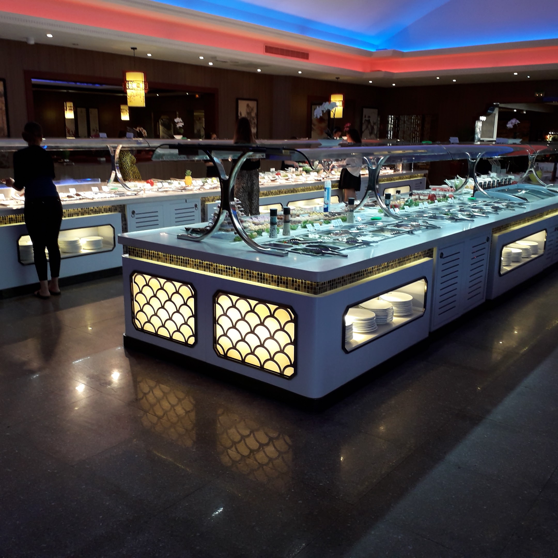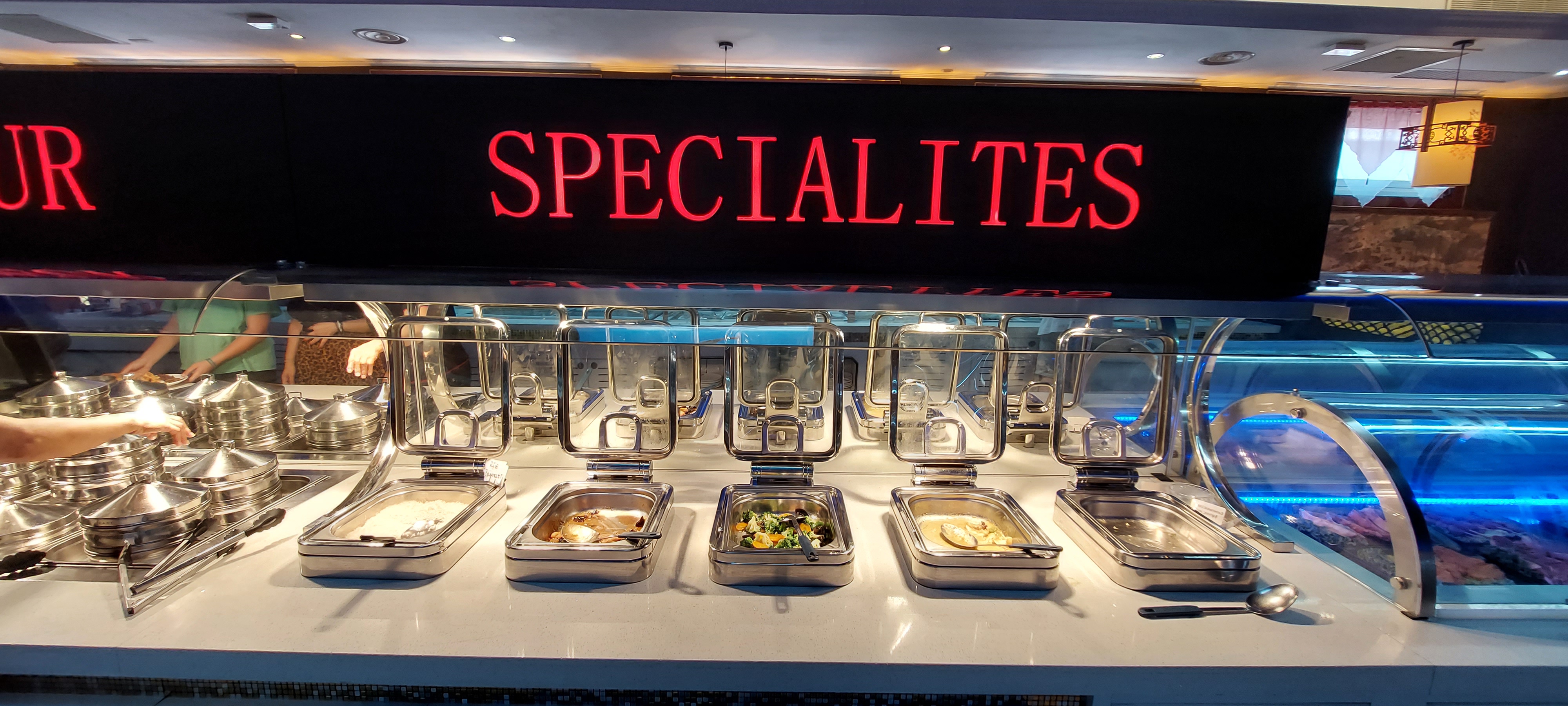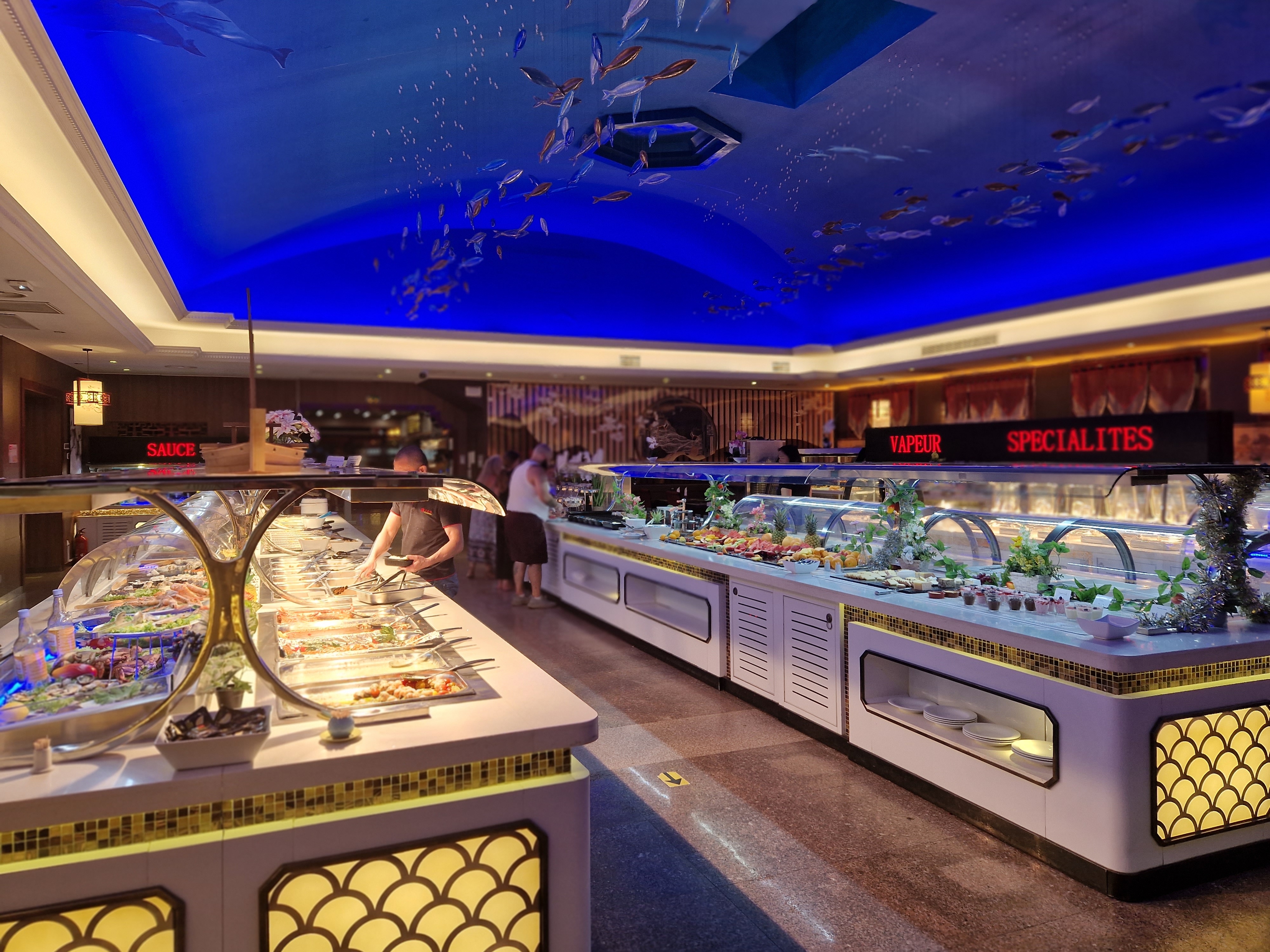 Buffets bien achalandés, beaucoup de choix et pour tous les goûts ! Wok, plancha etc... De charmants petits chats robots qui vous servent les boissons (les enfants adorent 😅)