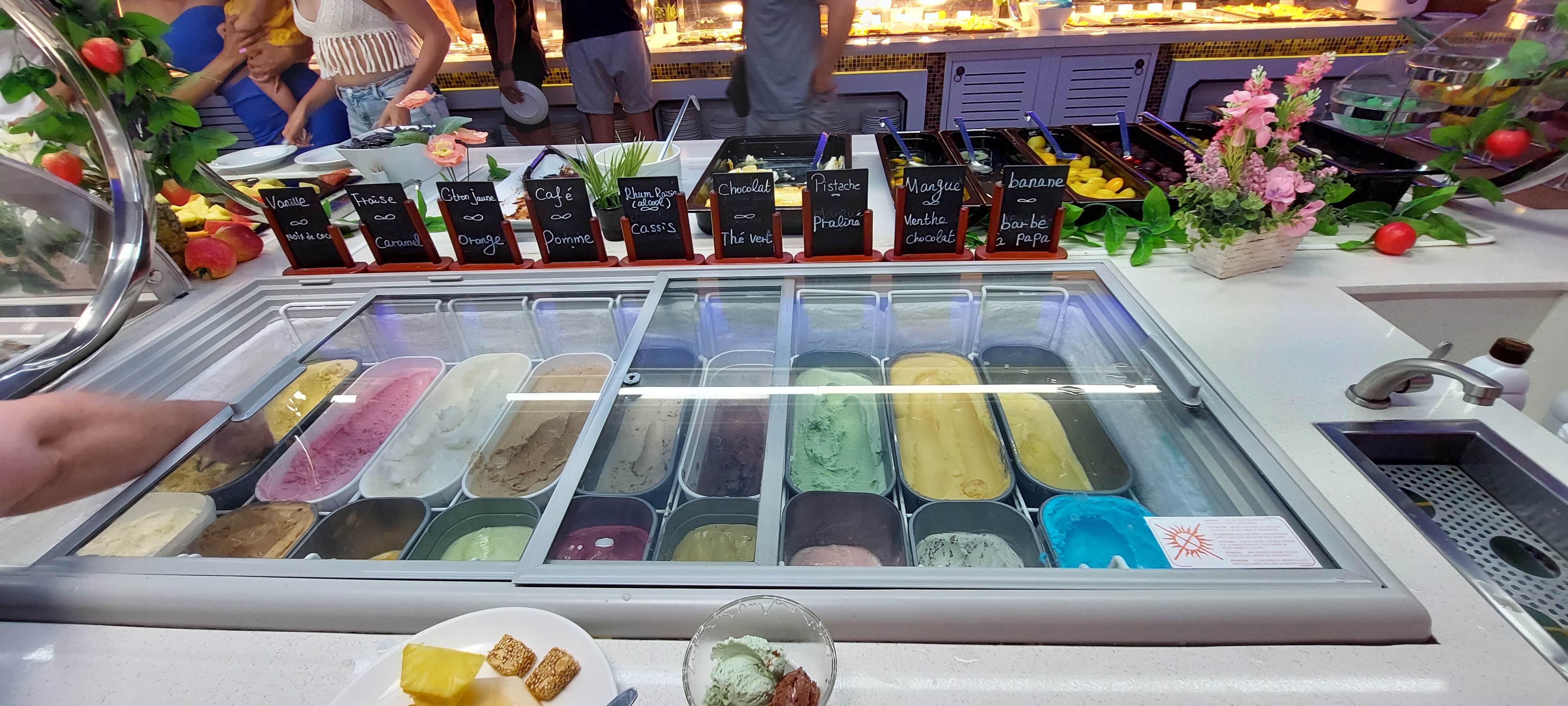 Grand choix de plats de l'entrée au desserts. Un espace wok, une machine à chantilly et chocolat chaud, une machine glace à italienne. Pour les gourmands choix importants de bonbons.