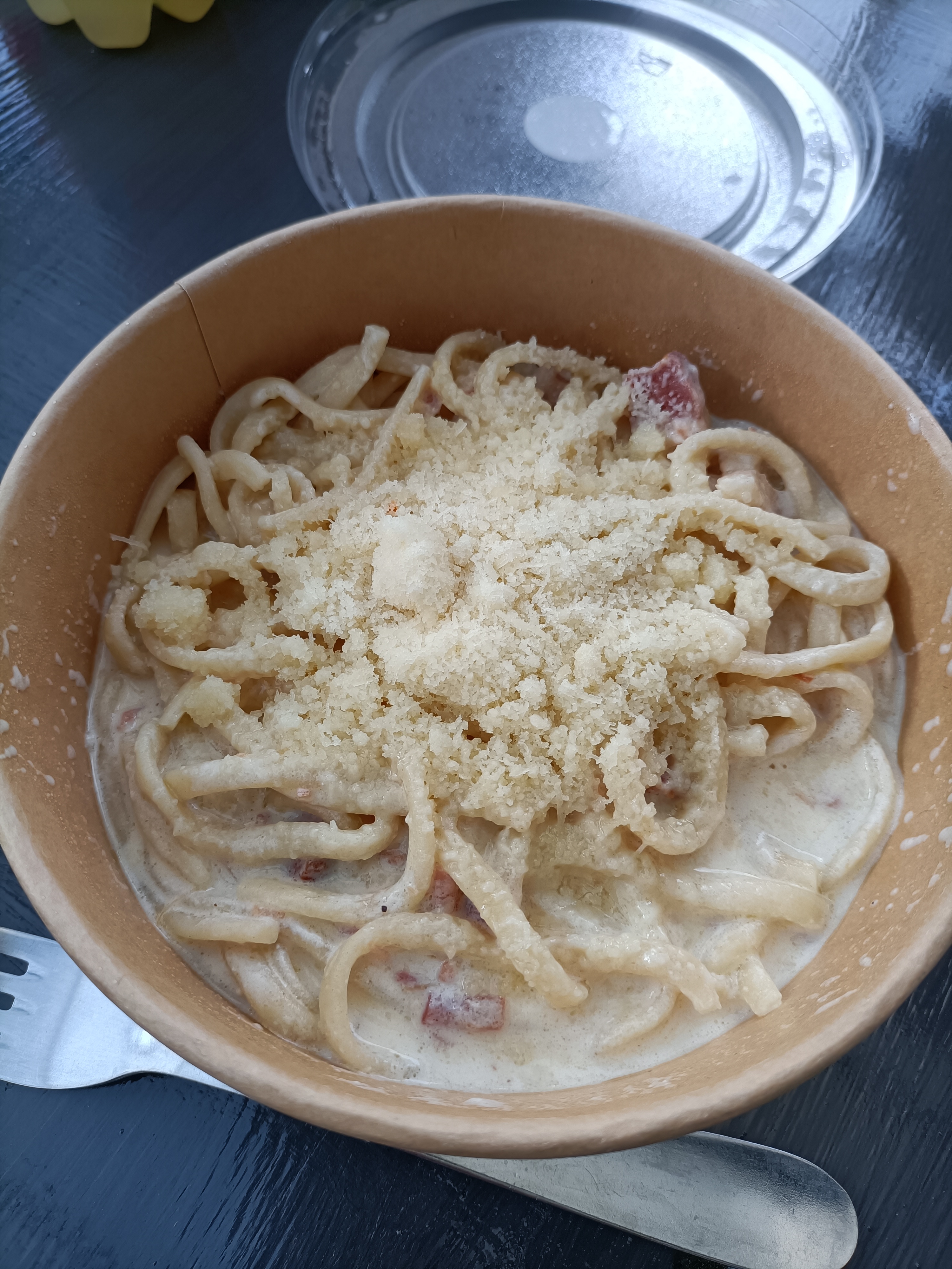 Les pâtes sont trop bonnes. Barquette bien remplie, on peut faire deux repas tellement c'est copieux. Moi j'ai pris au Pesto un régal. Je recommande vivement 👍😋