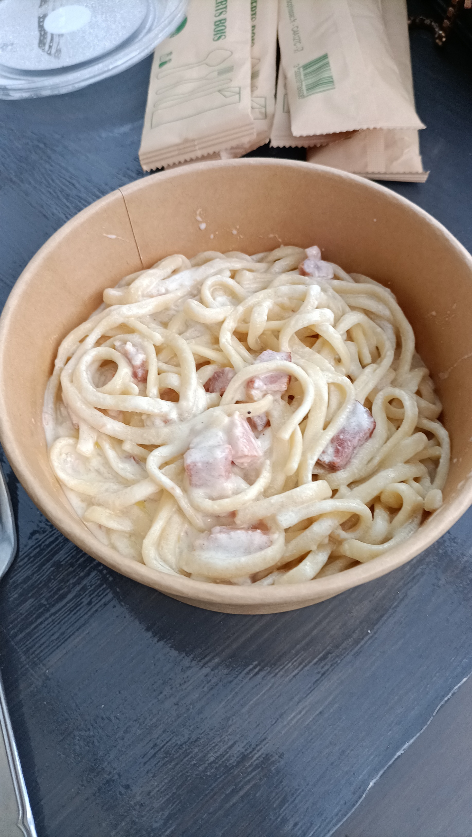 Vendeur souriant, tout est fait maison avec des produits locaux. Nous avons commandé des pâtes carbonara et des pâtes bolognaises. C'était très bon, au goût on reconnaît le fait maison. Même chose pour les desserts (tiramisu aux spéculos et aux fraises et une mousse au chocolat), super bon, fait maison et sans sucres ajoutés.