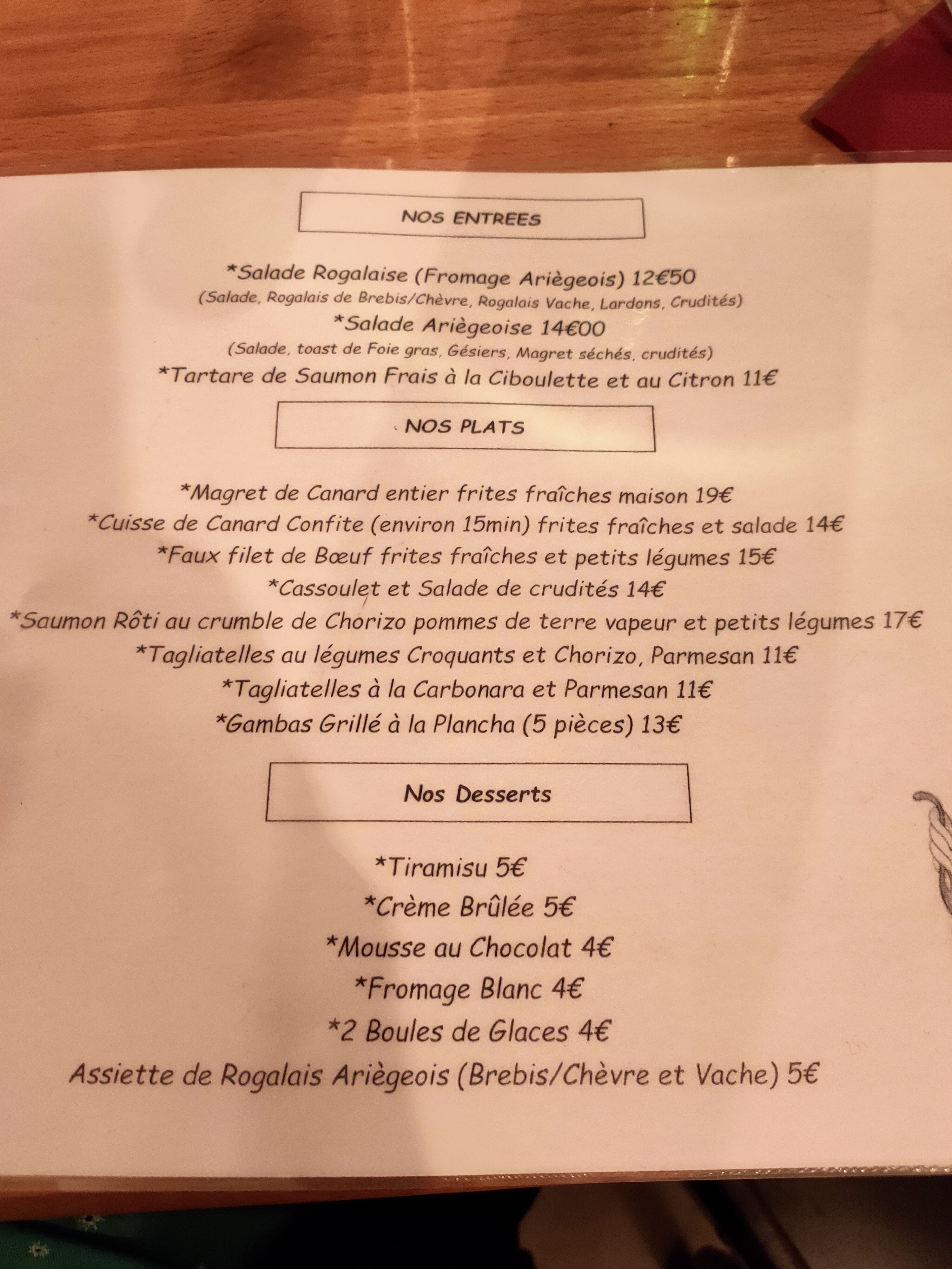 Très bon restaurant à prix raisonnable.les produits sont de très bonne qualité. Menu à 18 euros un samedi de juillet avec une excellente sallade ariegeoise avec très bon foix gras maison gesiers et magtret excelents. Cassoulet et confit digne de la region. Adresse a recommander