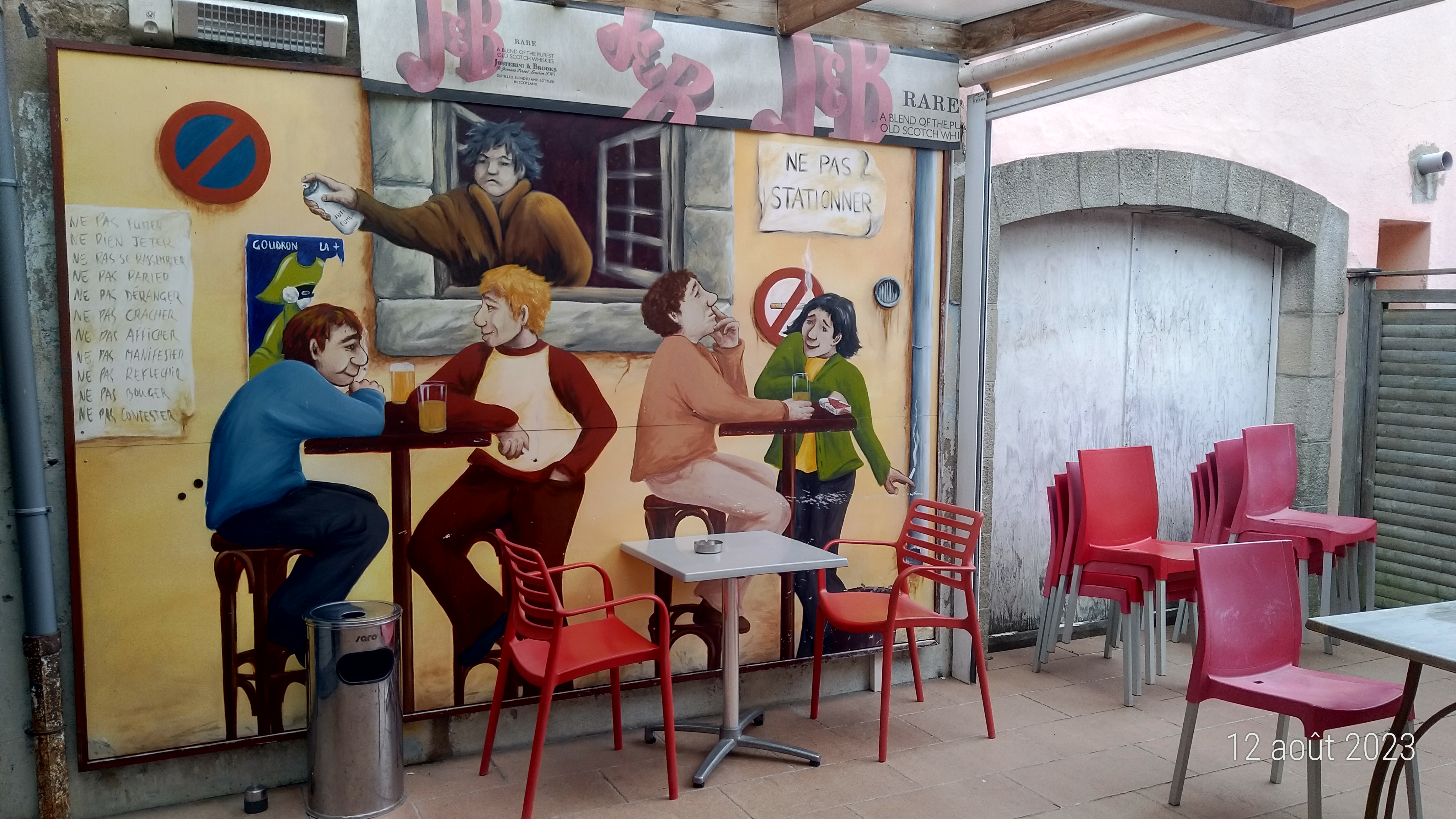 Impression spectaculaire du lieu, regarder de la tête au pied comme une bête curieuse, commande d'un diabolo fraise à 2euros20, surplus pour la livraison en terrasse je pense? (A Gourin, vous accrocher vos chiens avec des saucisses) Retour a l'intérieur pour régler ma consommation rebelote la bête curieuse revient, une petite calculette pour le barman, (charmant tout de même) ne serait pas du luxe pour rendre la monnaie. Ah la jeunesse!!! le calcul rapide avec virgule j'admets pas évident du tout. Après une petite visite rapide du centre de Gourin, une vive envie de rentrée chez moi a Rennes...