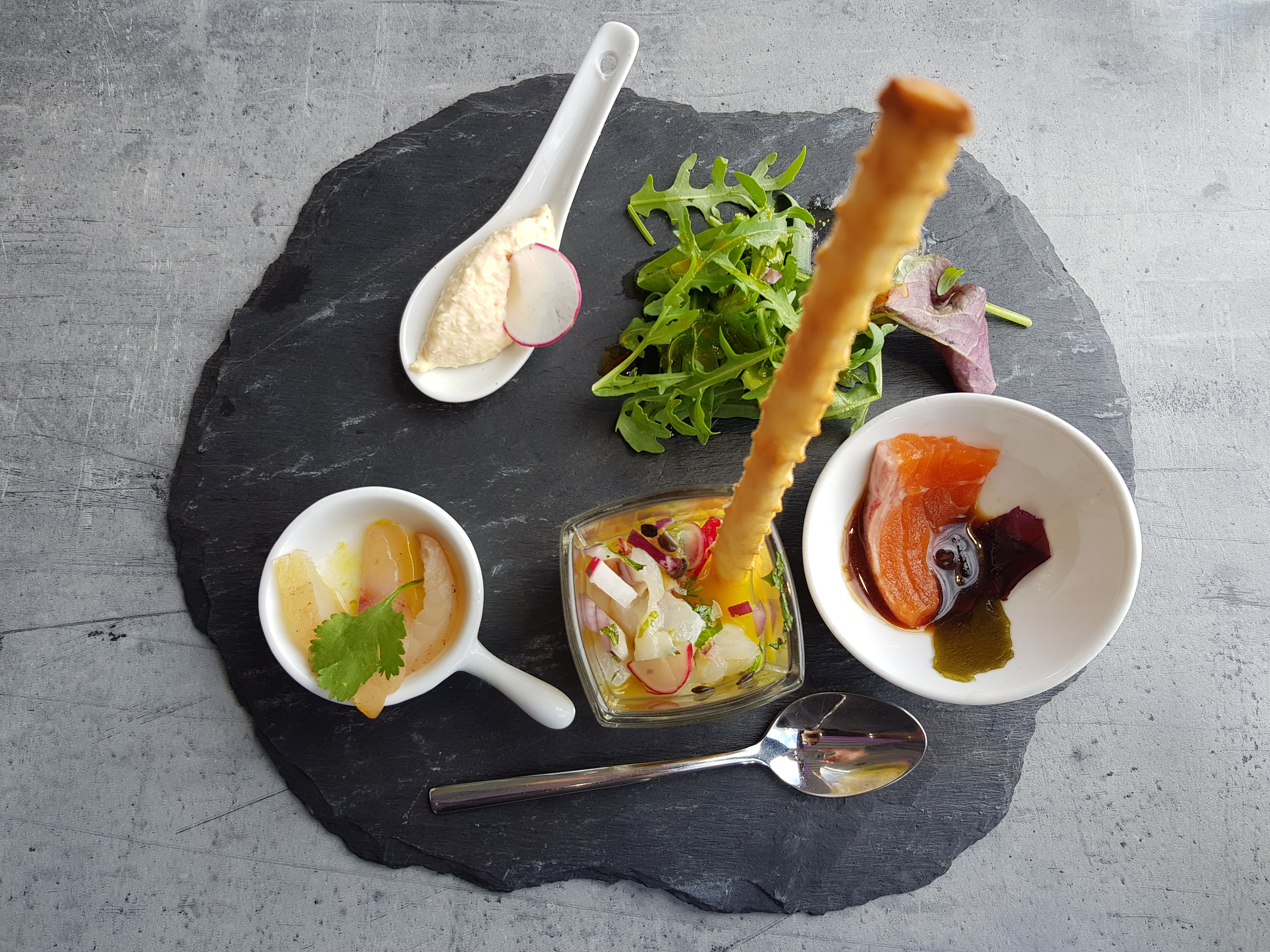 Assiette du fumoir maison délicieuse, filets de perches meunière goûteuses par contre celles à la provençale manquaient d'ail et de persil...un joli trompe l'oeil avec les galets de Sechex mais on cherche le goût des noisettes du Piémont...