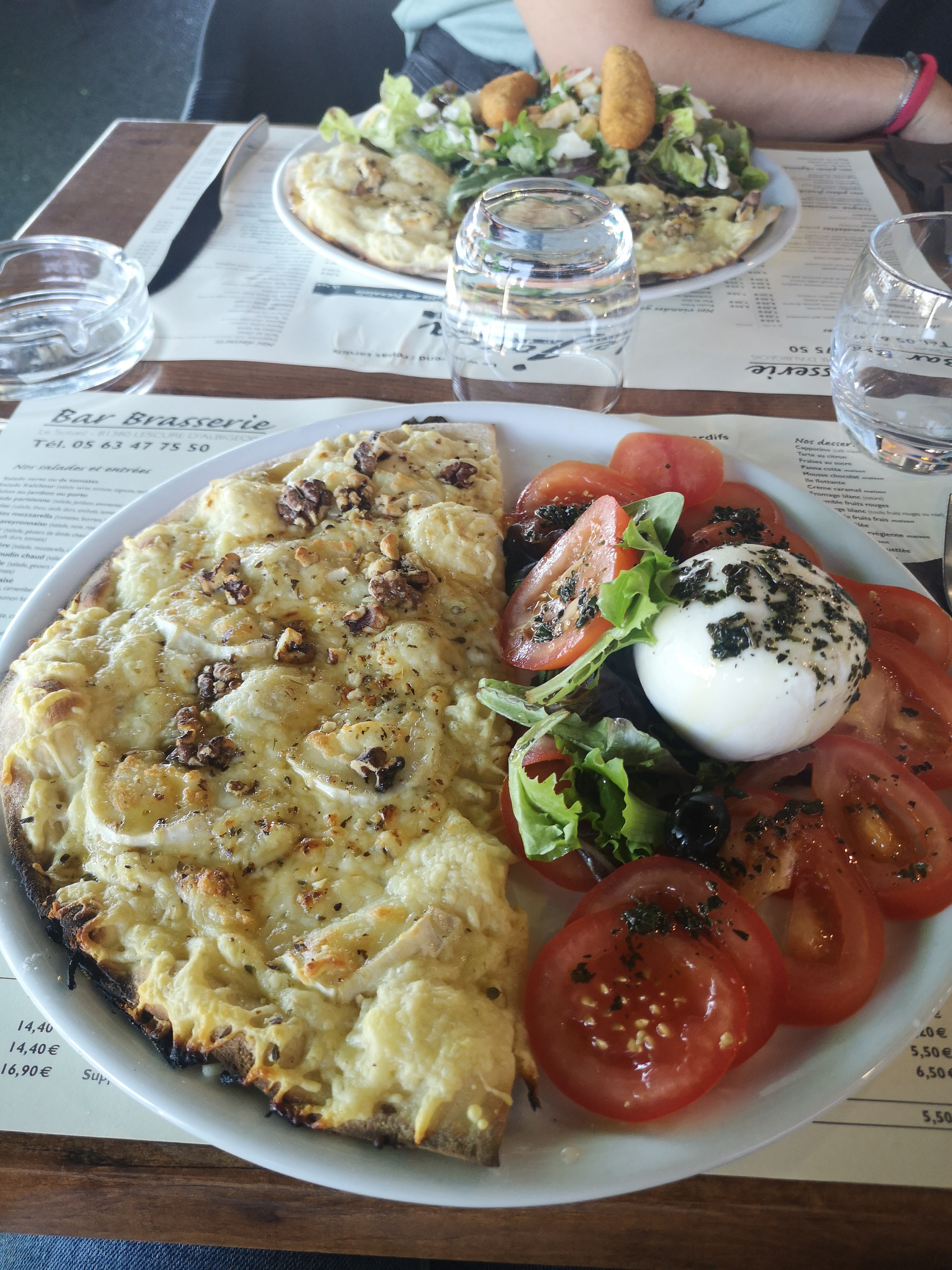Excellent en tout point ! Rapport qualité prix remarquable, avec par exemple des assiettes avec moitié de pizza et salades type ariégeoise copieuses. (Photo en exemple) Pizzas excellentes cuite par le pizzaiolo du restaurant. La cuisine est visible en fond de salle, derrière une grande baie vitrée ce qui est un gage de qualité, rien n'est caché et tout est vraiment très propre. Le patron et les serveurs sont tous très accueillants et sympathiques.