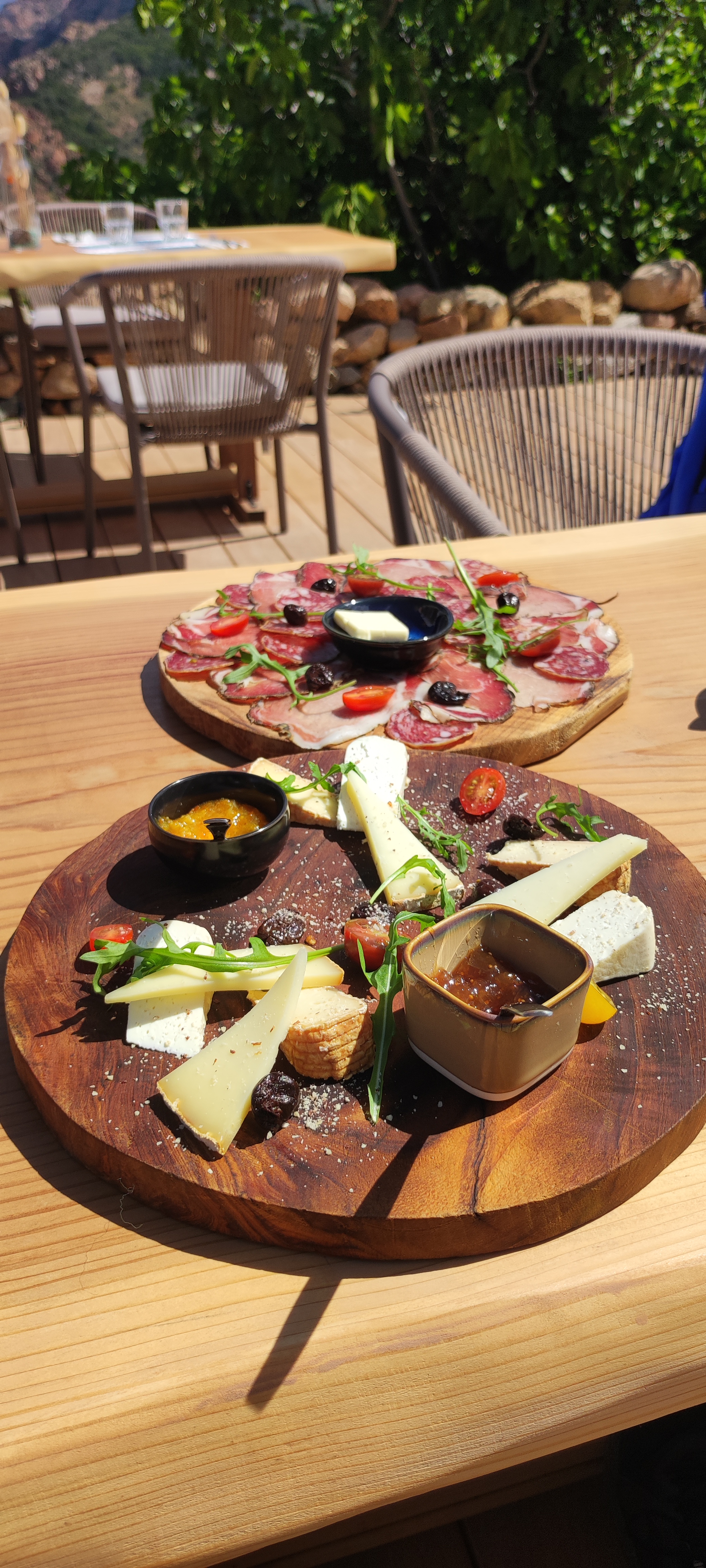 Terrasse magnifique avec une vue incroyable, vraiment un lieu magique. Très romantique ! Accueil aux petits soins. Planches de fromage ou charcuterie corse simple mais avec des produits savoureux et de qualité. A ne pas manquer !