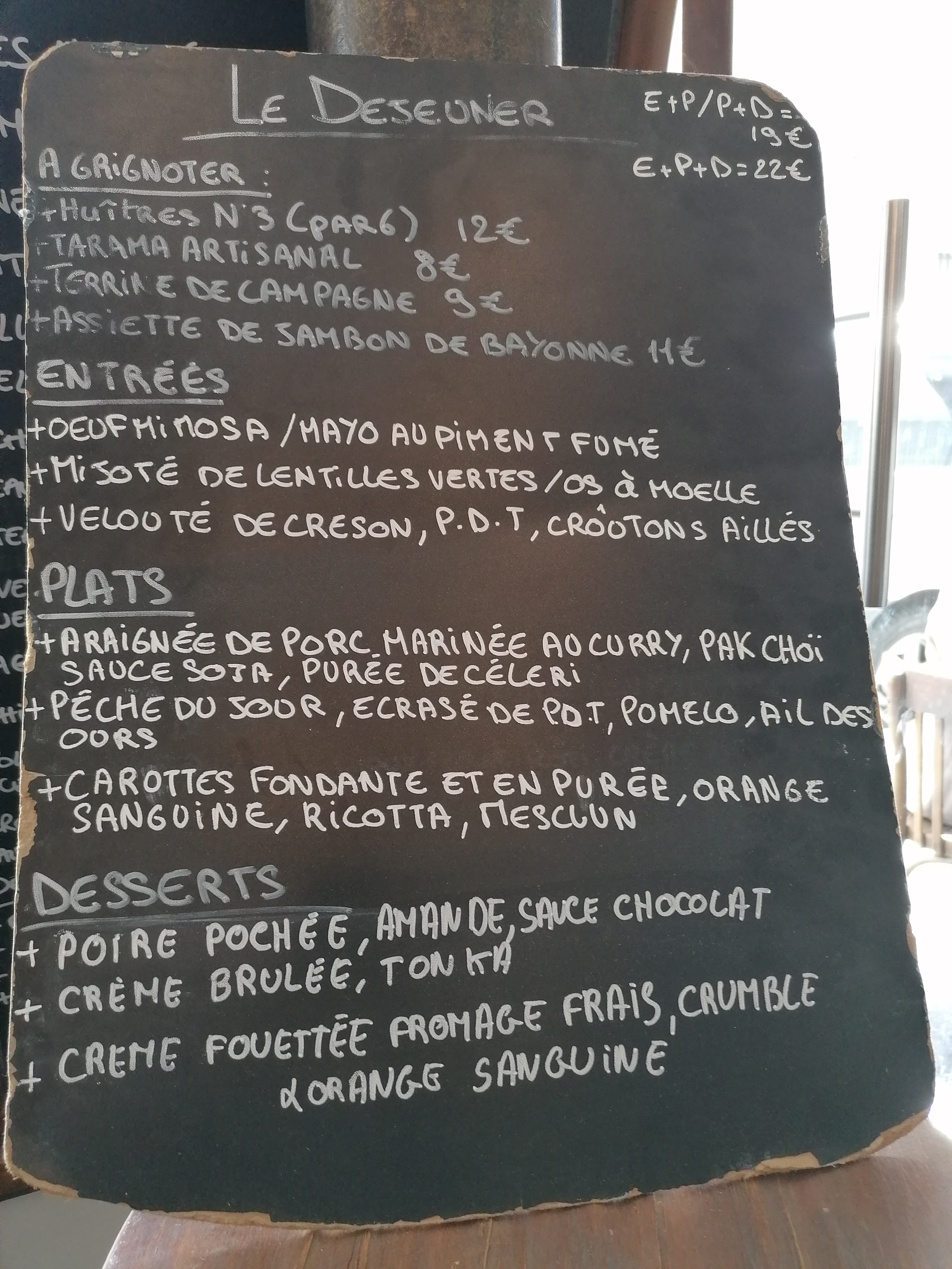 Très bon repas, le midi comme le soir, Le midi une formule serrée : 2 entrées et 2 plats à 14,90€ le menu entrée plat. Compter 18€ avec le dessert. Pour le soir, le chef propose des tapas variés, beaucoup de poissons, un dessert à l’ananas avec de la meringue italienne délicieux. L’assiette est entre 6 et 10€. Il faut 3-4 assiettes pour être repu. Le restaurant étant petit, il vaut mieux réserver !