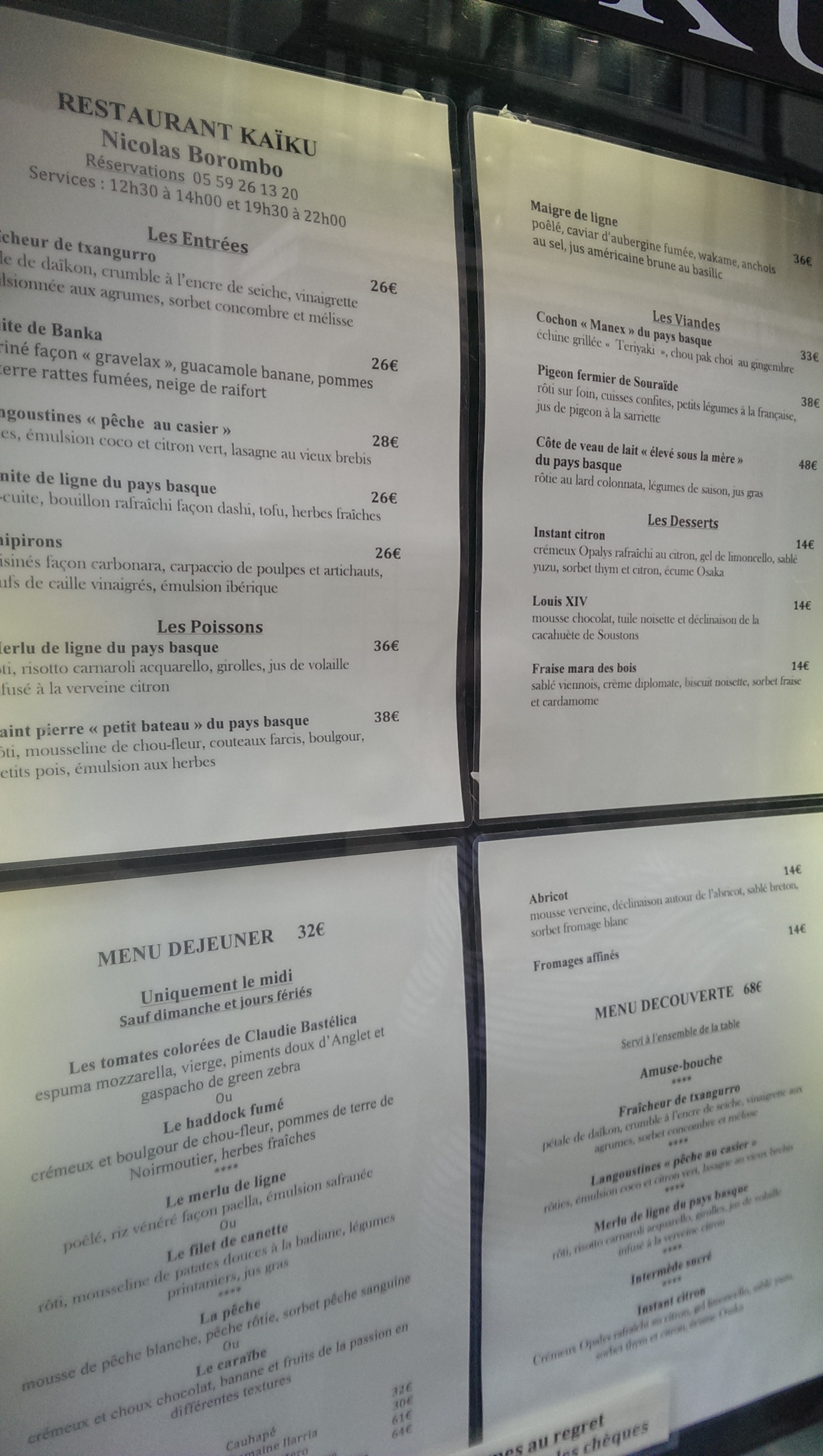 16/20 Le Kaïku, ce sont des paradoxes réussis ; la décoration simple mais raffinée, le cadre moderne et chaleureux dans cette bâtisse du XVIème pourtant historiquement austère et surtout, la cuisine de Nicolas Borombo qui mêle ses inspirations gastronomiques diverses et métissées aux produits frais du marché local. Le service est discret, efficace et bienveillant - comme les Basques ;) - et l'étoile au Michelin tout à fait méritée.