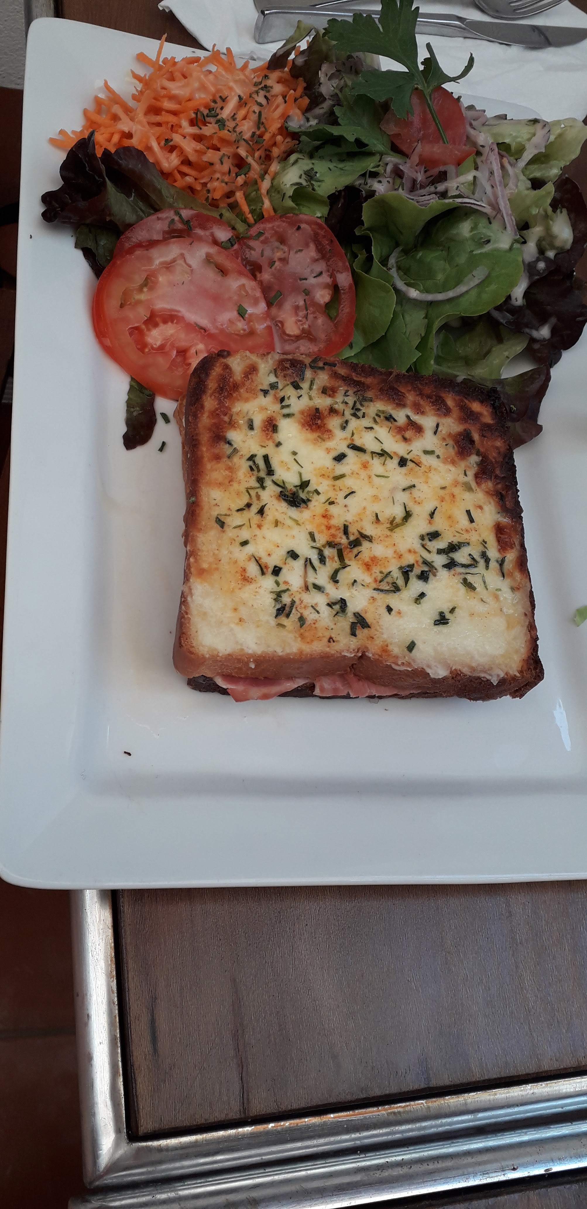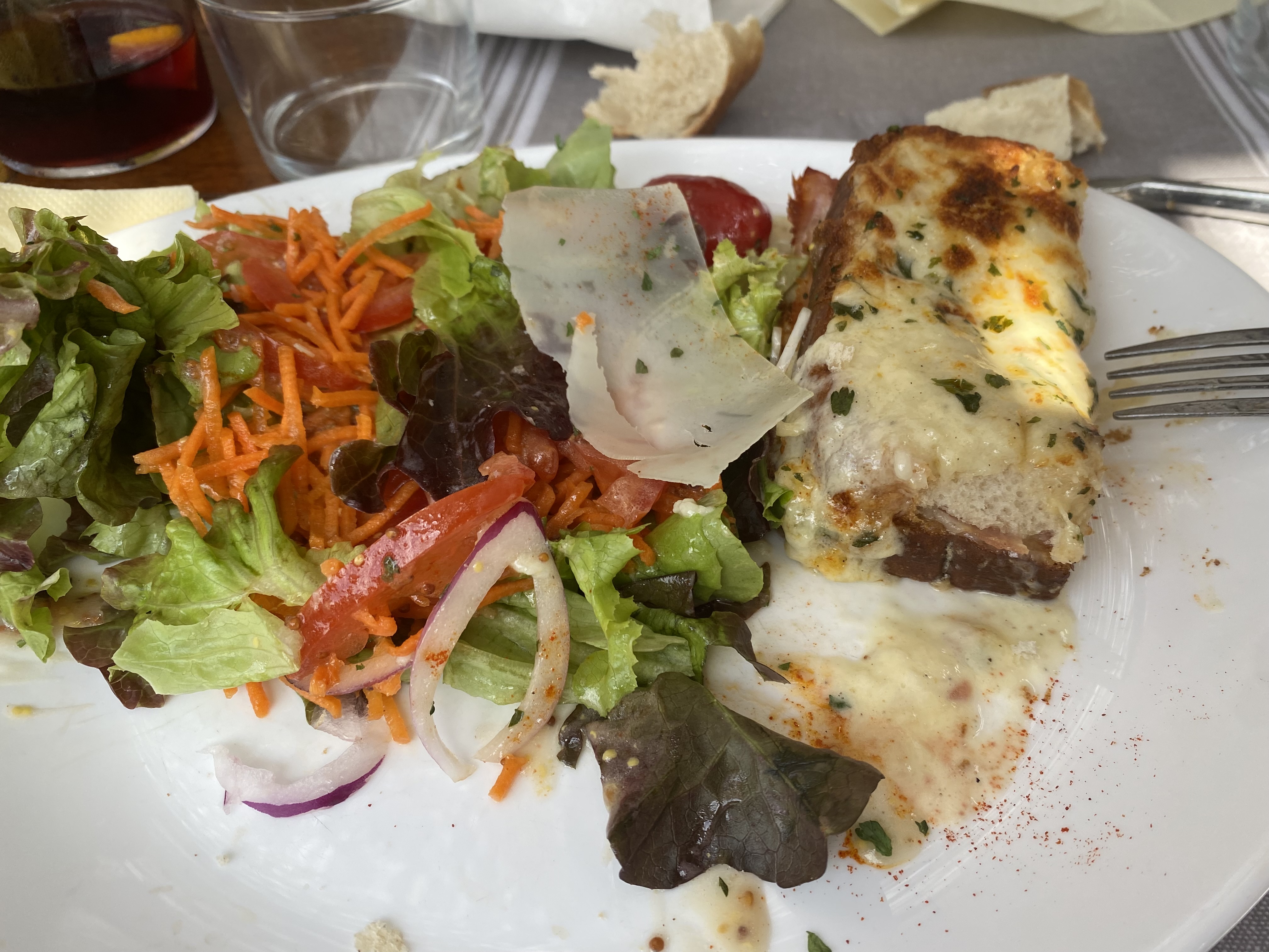 Si vous cherchez un bon endroit pour déjeuner pour votre dernier repas en France avant le Camino, c'est peut-être celui-là. Un premier plat de salami séché local, suivi d'un vrai croque monsieur fait à la main est quelque chose de spécial. La tarte tatin était impressionnante (belle croûte et caramel, pas trop sucrée).