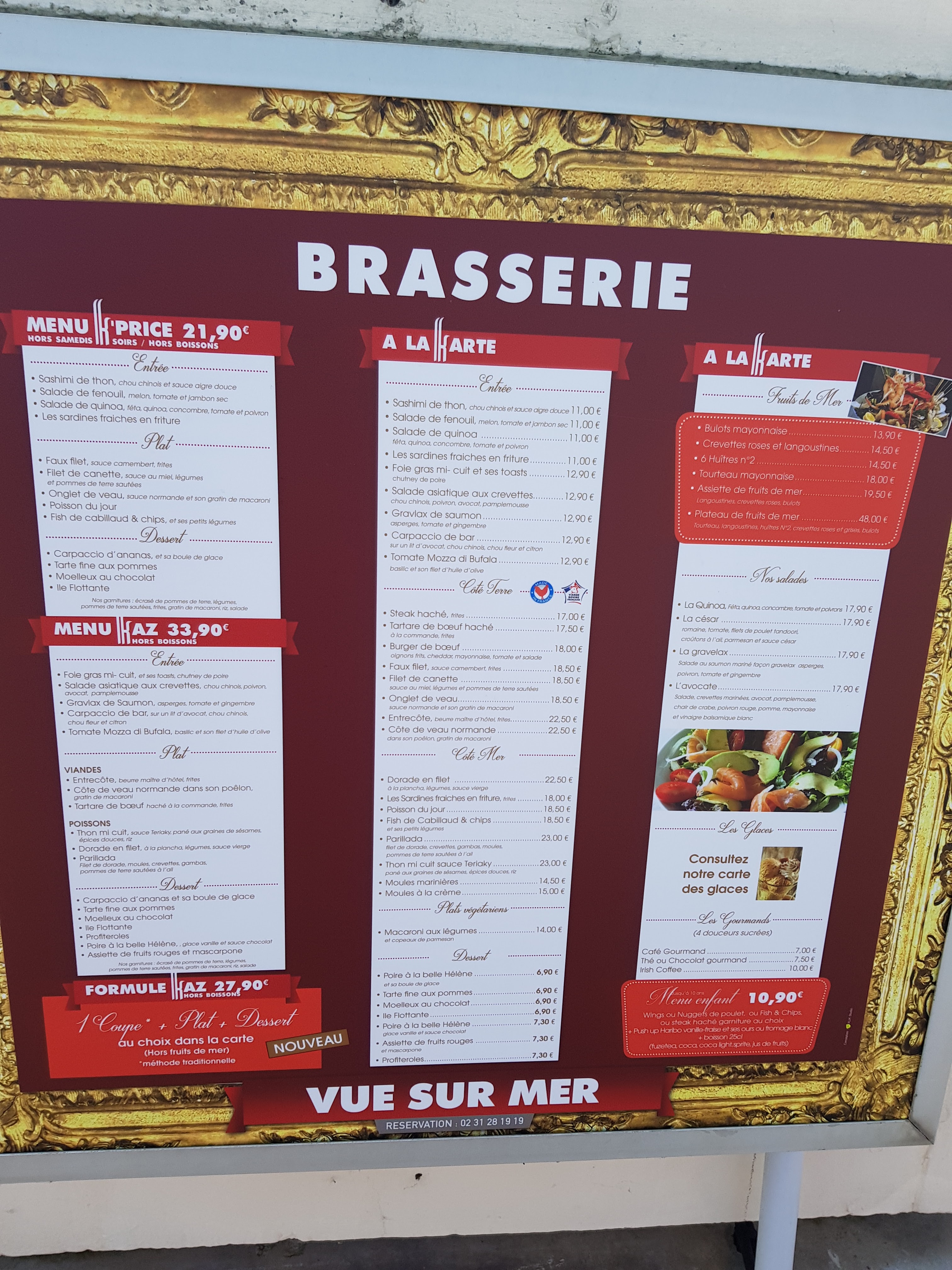 Vue sur mer , ambiance feutrée, le choix sur carte limité mais mets excellents, les desserts sont à retenir entre autre le Paris Brest : un régal ! Prix raisonnables pr la prestation .