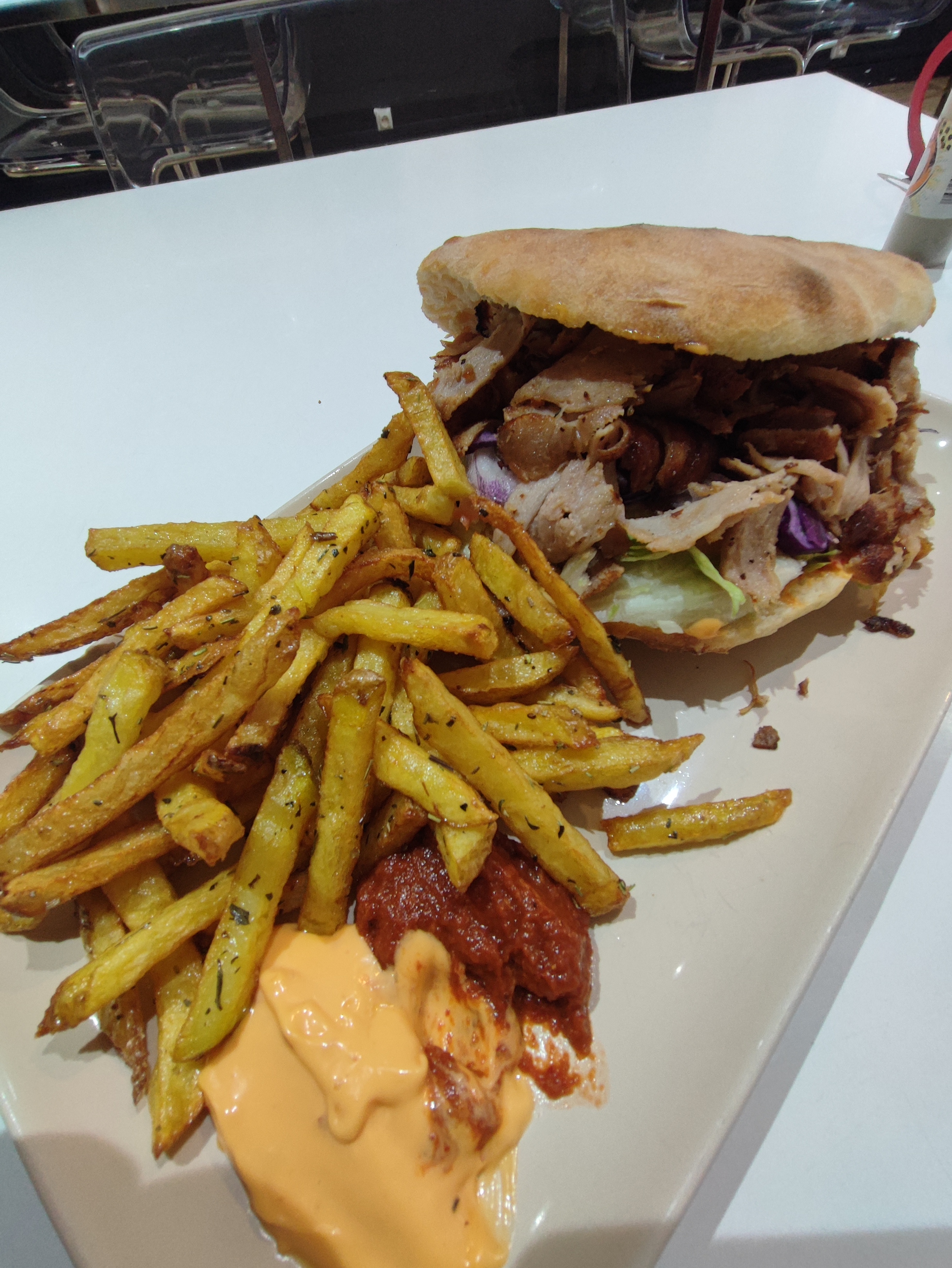 Personnel accueillant et agréable, prise de la commande et service rapide. Le pain est excellent et la viande bien grillé et goûteuse rien à dire c'est un régale, les frites sont aussi une tuerie Je recommande fortement un des meilleur kebab ici