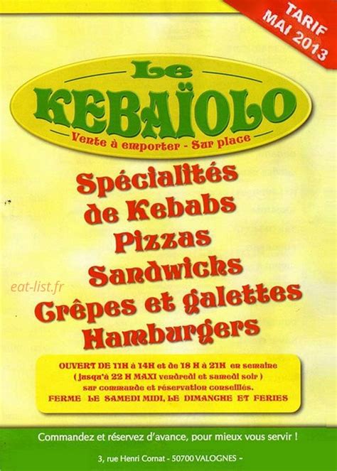 Voici toutes les informations sur le Restaurant LE KEBAIOLO qui ce trouve au RESTAURANT PIZZERIA KEBAB LE KEBAIOLO, 3 Rue Henri Cornat, 50700 Valognes (50). Sur cette fiche vous trouverez les photos, l'adresse, les horaires d'ouverture, le numero de téléphone et les avis clients.Vous pouvez églement rédiger un avis si vous le souhaitez en bas de page.
