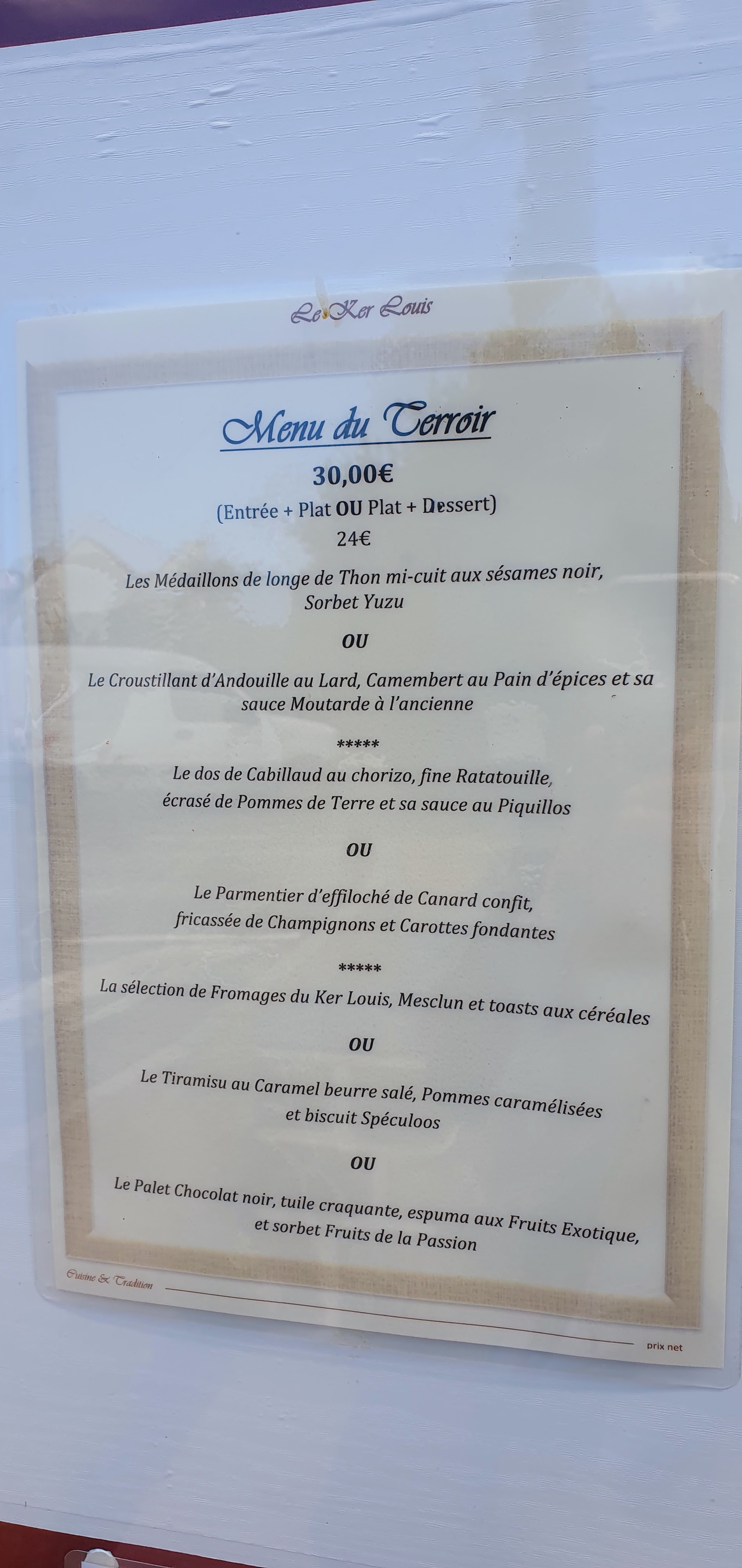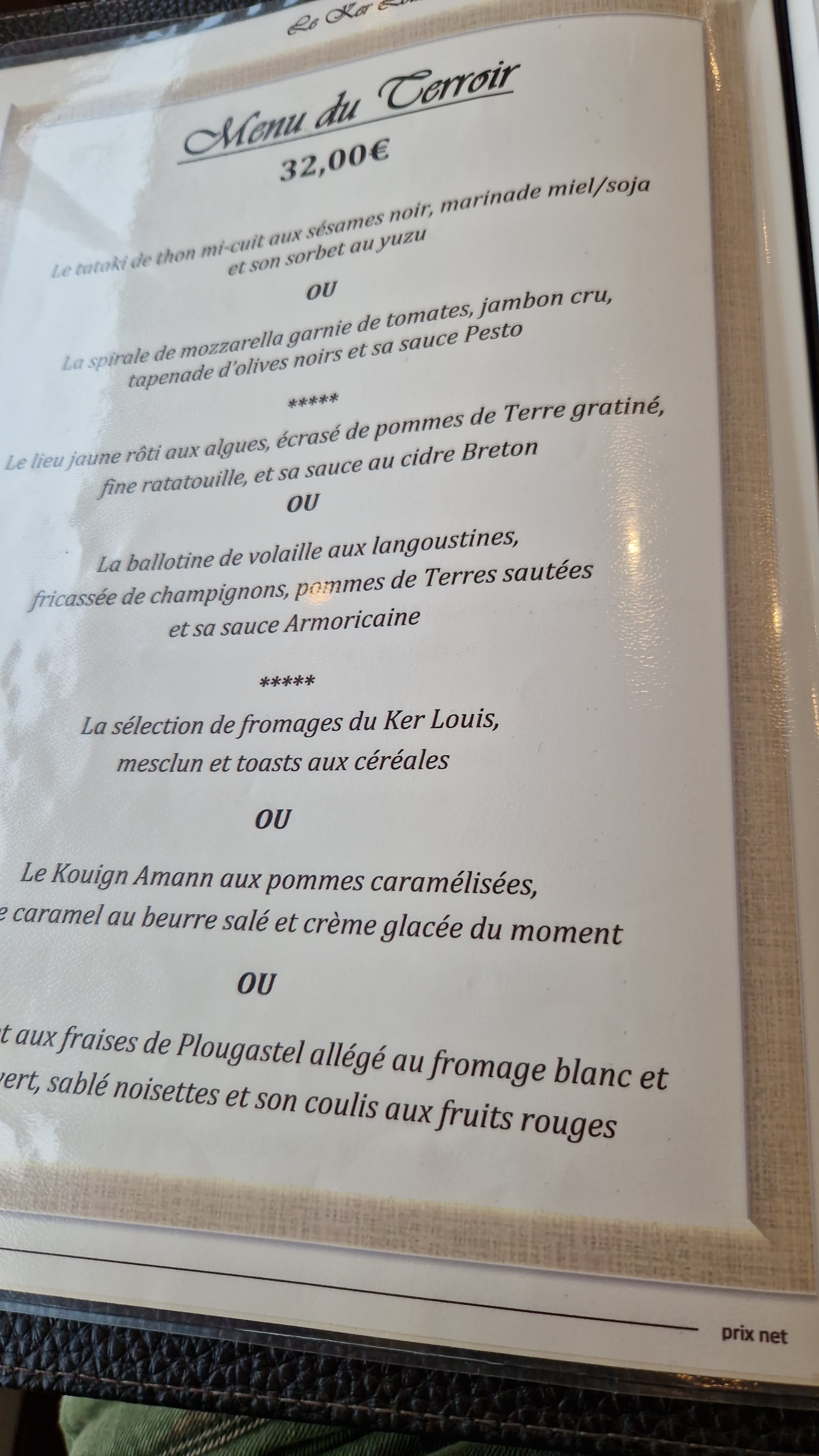 Un repas composé de mets délicieux préparés et servi avec soin. Une vraie découverte, demain on y retourne. Il faut saluer le travail en cuisine ainsi que le service. Chapeau l'équipe du Ker Louis.