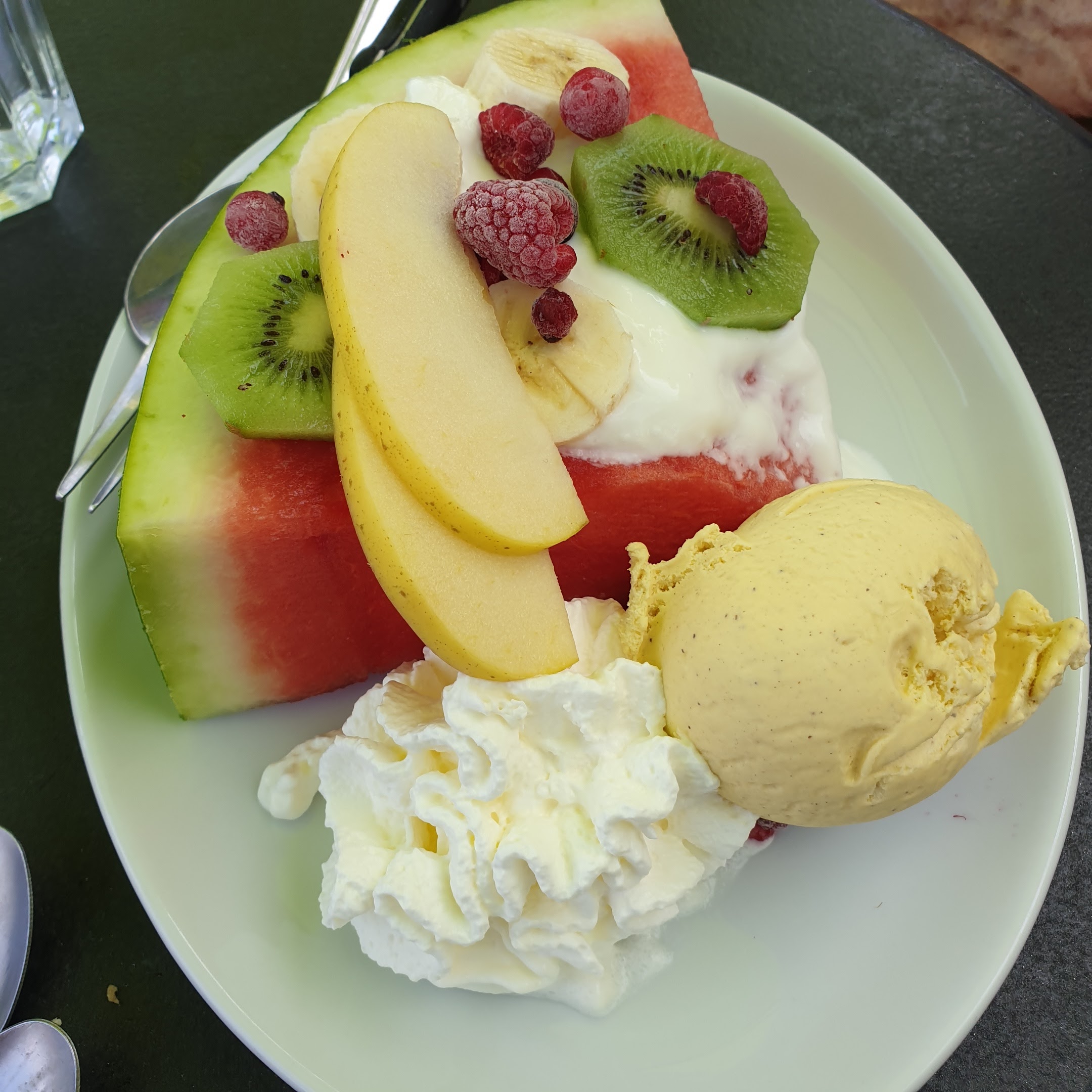 Cadre magnifique. Par contre jus de fruit servi au verre ???? Pas de bouteille ouverte devant le client ? ??? La marge doit être bonne. .. Pas de note ( facture ) ?? C'est dommage