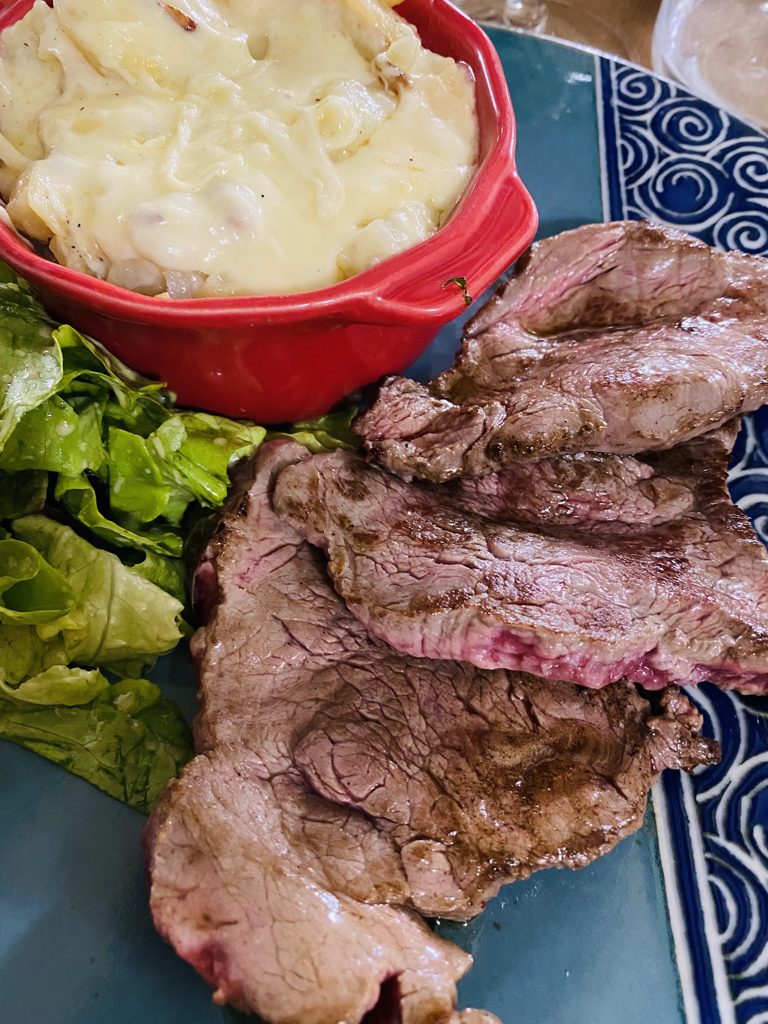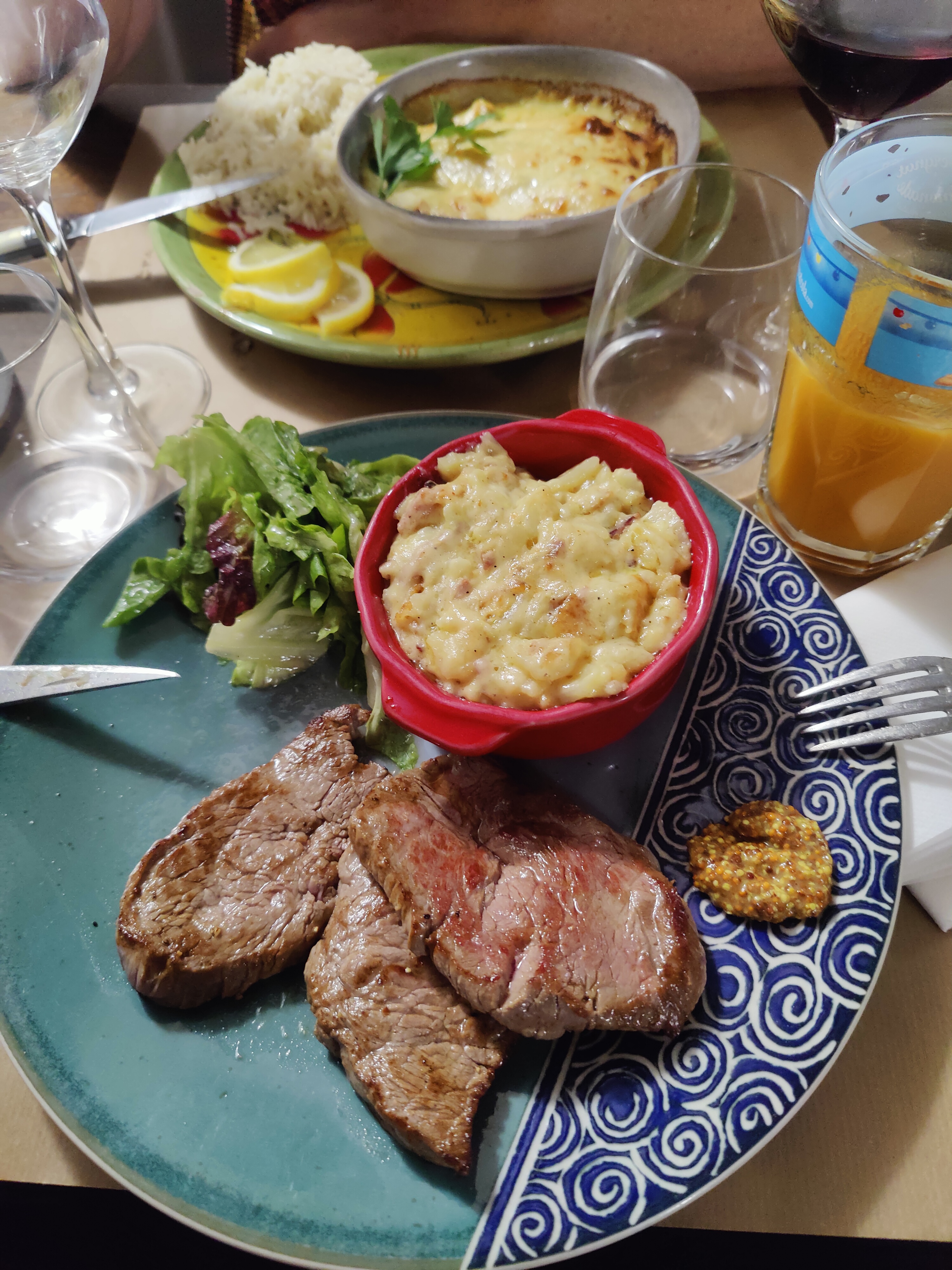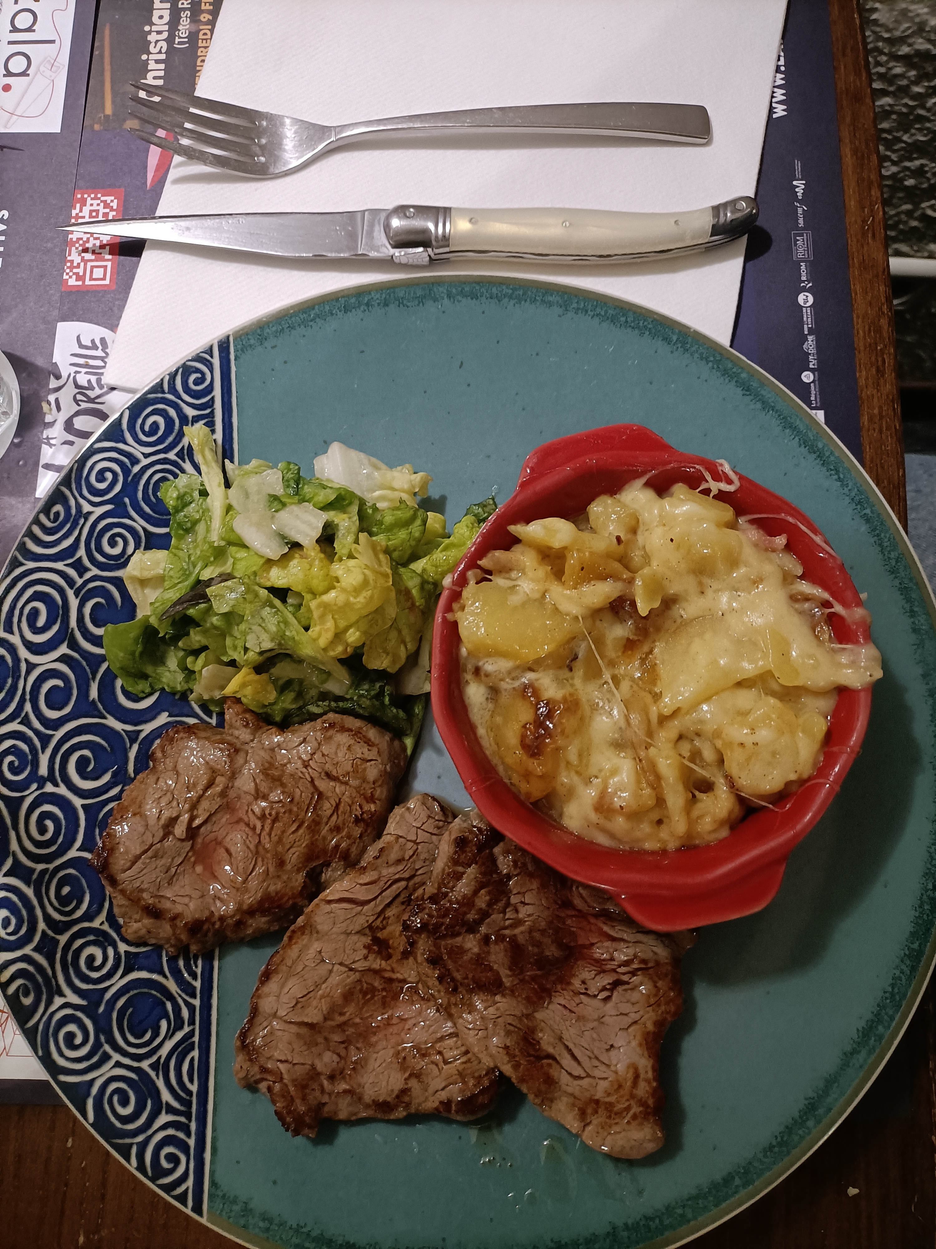 Accueil chaleureux et cuisine délicieuse, les entrées en particulier ont fait l'unanimité à table. Je recommande la salade de chèvre chaud et le pied de porc fris, un délice ! En dessert, coup de coeur pour la crème brûlée à l'orange ! Les plats sont bien suffisants en quantité (boeuf et truffade sur la photo).