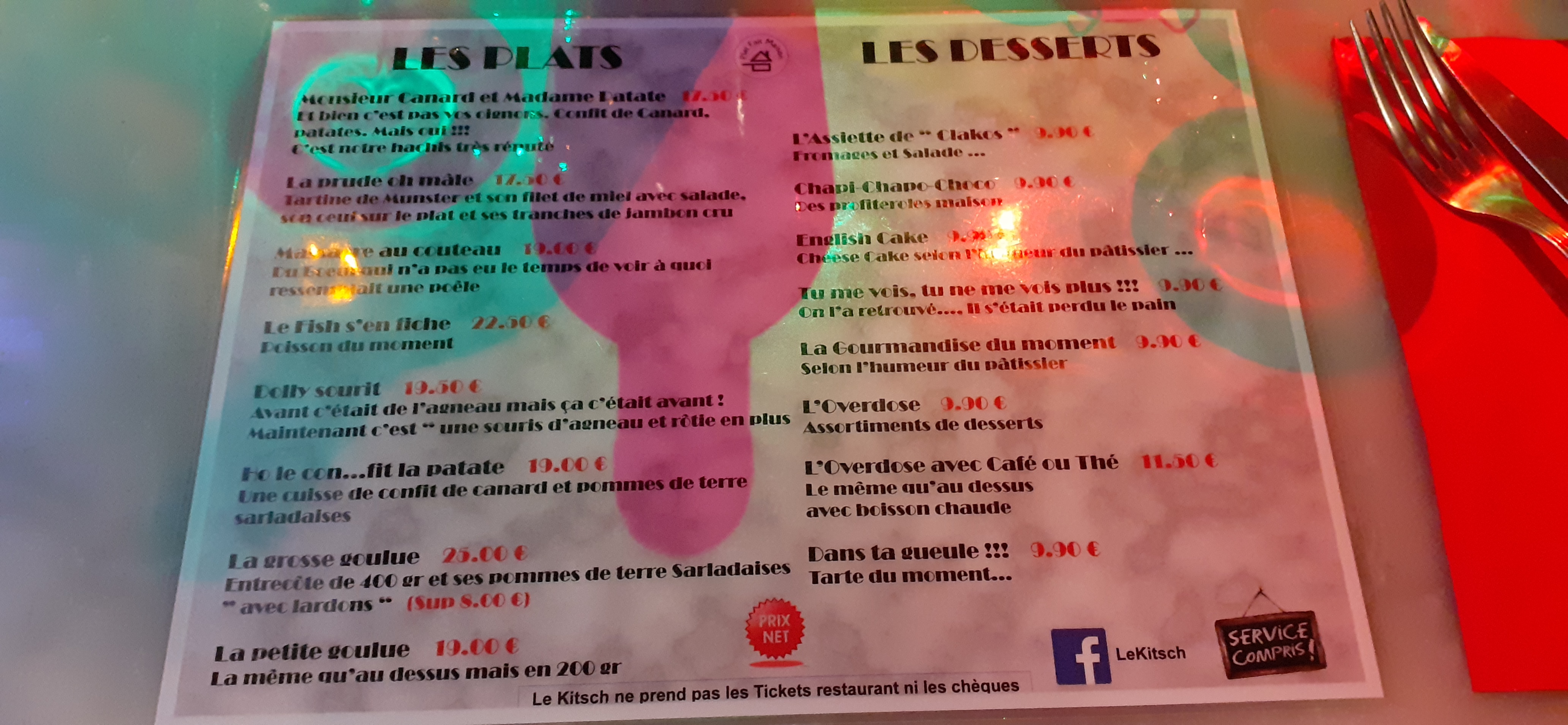 je recherche toujours un restaurant original pour mes copines Parisiennes...une adresse incontournable. Ce qui se passe au KITSCH reste au KITSCH LOL.. Restaurant atypique, très bon, a venir découvrir. Merci à toute l'équipe, mes copines sont reparties avec un bon souvenir et des éclats de rires.