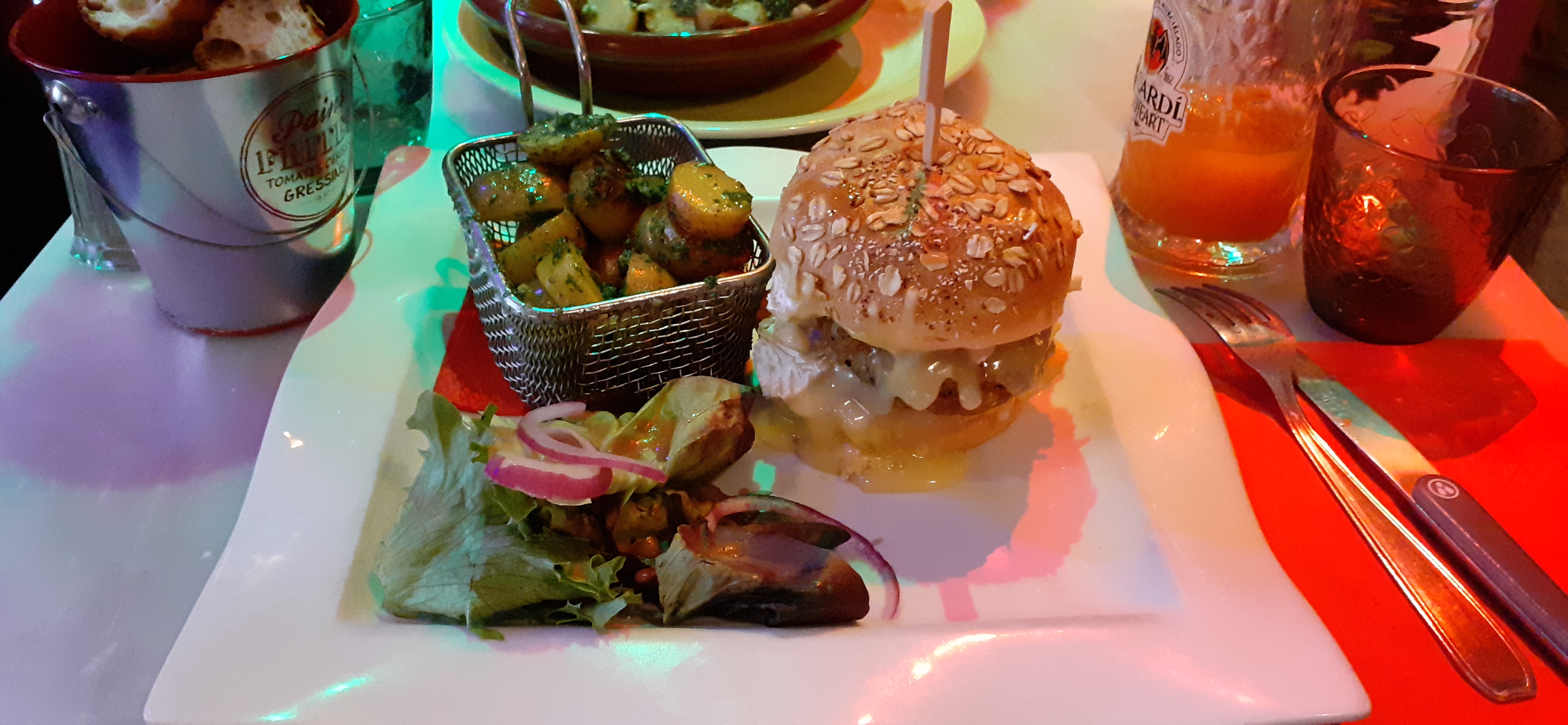 Installé en courant d’air et mal assis sur une table haute bricolée avec des assises de tracteur (c’est rigolo mais pas confortable) on découvre une carte avec des jus de fruits à 7€ (!!), des cocktails à 12€, j’arrondis, et des burgers à 20 balles ! le café gourmand à 14€… Quand même ! le poisson du moment 25€ … ouch ça pique. Pas de menu enfant, dommage, surtout vu le prix des jus de fruit et des desserts. Bon la déco est sympa, l’accueil aussi, tout est fait maison certes, mais faut pas pousser mémé dans les orties… 7 balles le jus de fruit, et lui il est pas maison !! Un endroit convivial… mais avec des prix qui cassent l’ambiance.