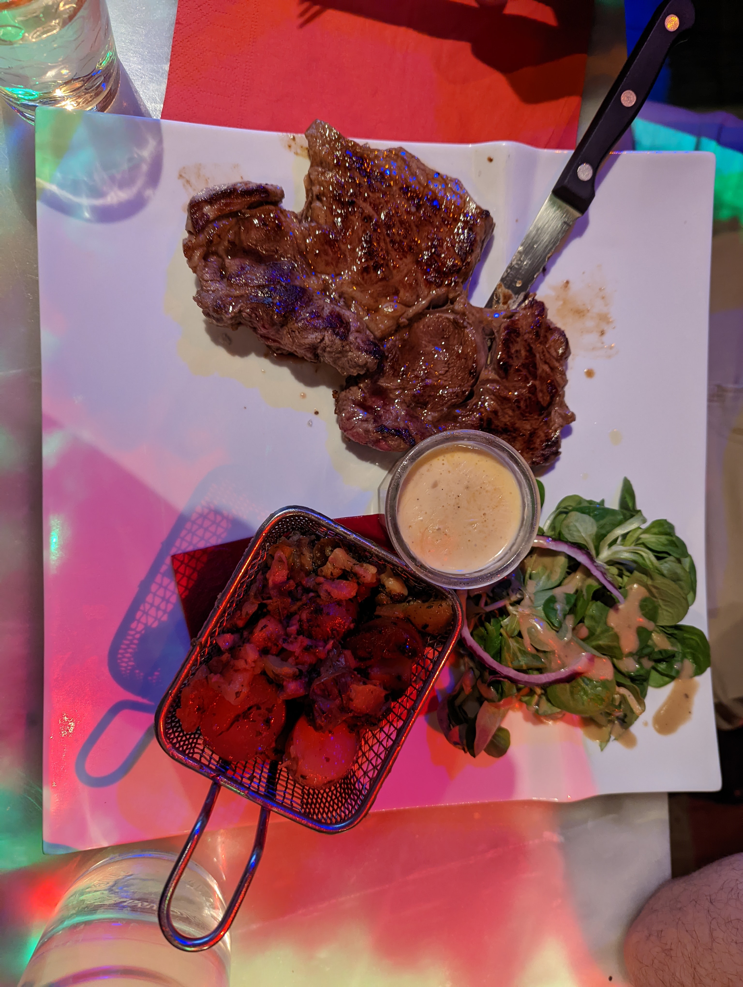 Cocktail excellent ! (pina colada et cosmo, je n’avais jamais eu un aussi bon cocktail depuis mon retour d’Amérique latine), et tellement bien chargé niveau alcool. Concernant le repas, c’était délicieux, copieux et bien assaisonné. La viande est tendre, personnel accueillant et souriant, et bonne ambiance calfeutrée et conviviale.