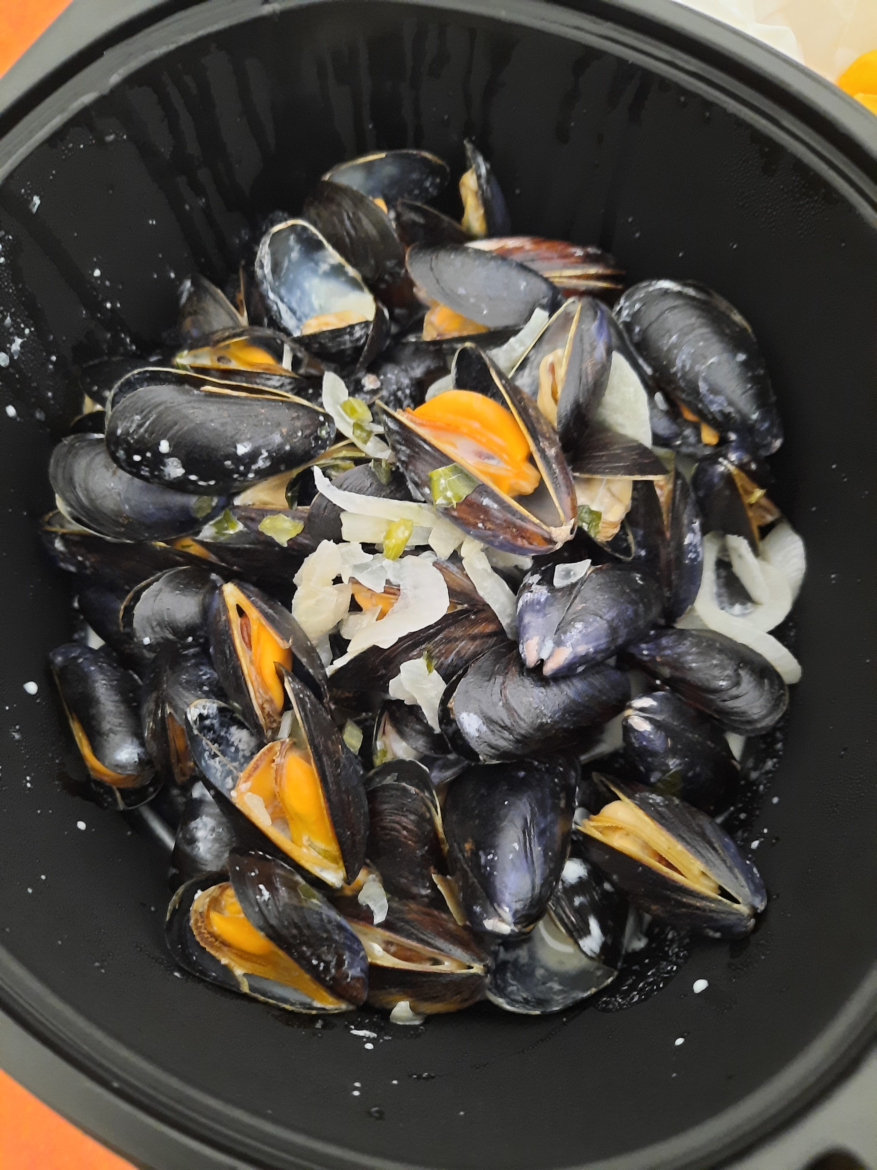 Délicieuses moules avec frites pour le déjeuner, fortement recommandées
