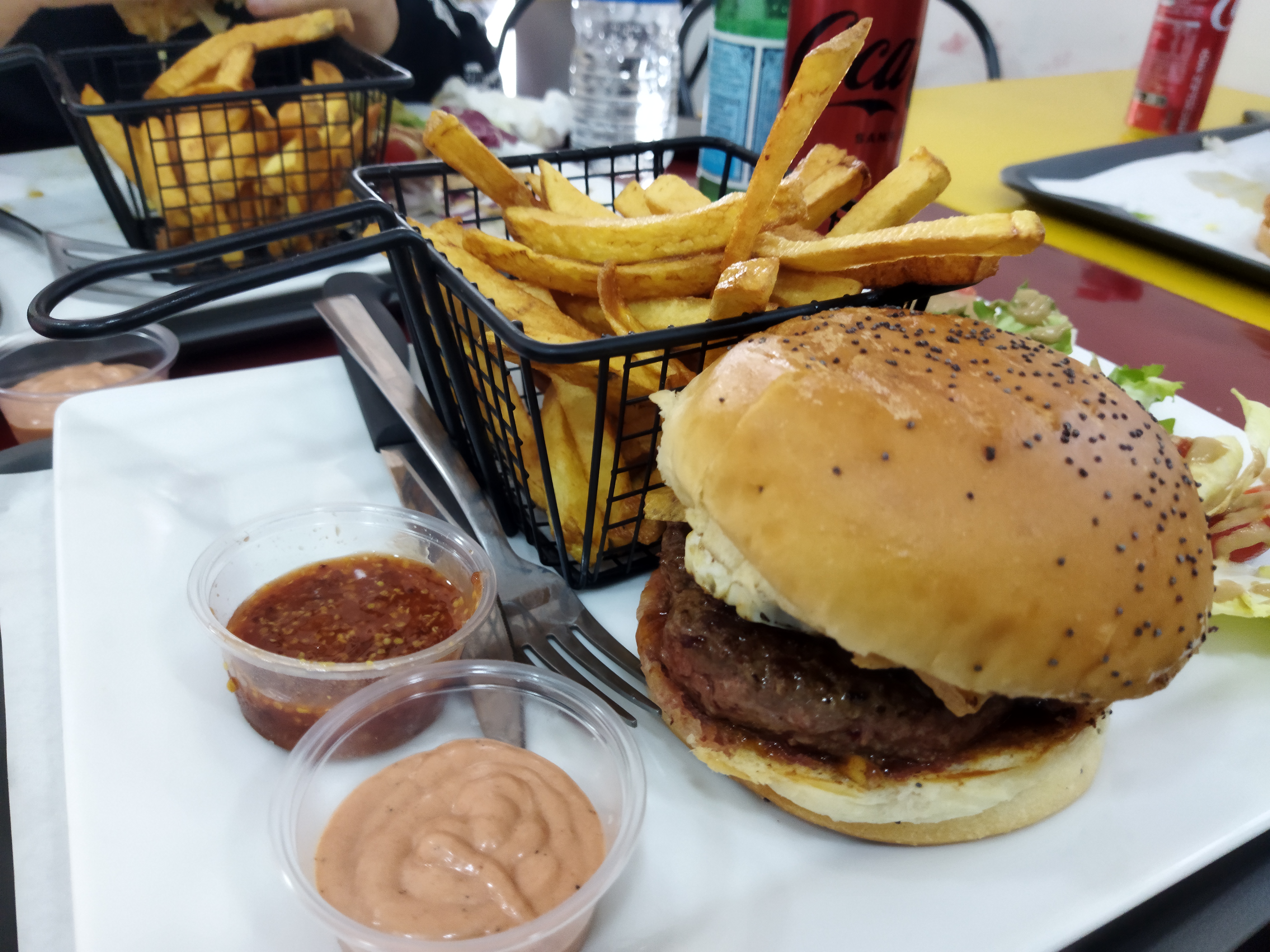 Restaurant neuf car cela se voit avec le scotch sur les aérations protéger pour la peinture fraîche. la personne à l’accueil très aimable et très charmante,courtoise. Le hic ne maîtrise sa connaissance de carte et produit. Le pain est bon la viande est bonne mais le burgers est mal garnis, j ai cru manger un burger avec le pain viande et sauce uniquement. Les frites ne sont pas faite maison mais plutôt des produits achetés chez Metro. Je n’ai pas touché à mes frites car trop huileuse et molle. Le plus triste m c’est qu’il y avait uniquement une personne pour gérer l’accueil et les burgers et les commandes emporter. Une personne qui touche les caisses le téléphone les meubles comptoir et qu’il fasse aussi les burgers derrière … un doute sur l’hygiène et le respect des normes HACCP. Cela a causé beaucoup d’attente et un stress à la personne a l’accueil donc une mauvaise expérience pour nous. Infos +: Impossible de payer en carte ticket restaurant.( dommage) Le fondateur doit revoir leur organisation , Ce restaurant peut faire beaucoup mieux mais je pense qu il n’y a pas de réel restaurateur au commande mais plutôt des jeunes investisseur. Deux étoile en étant très objectif. Vous souhaitant bonne chance.
