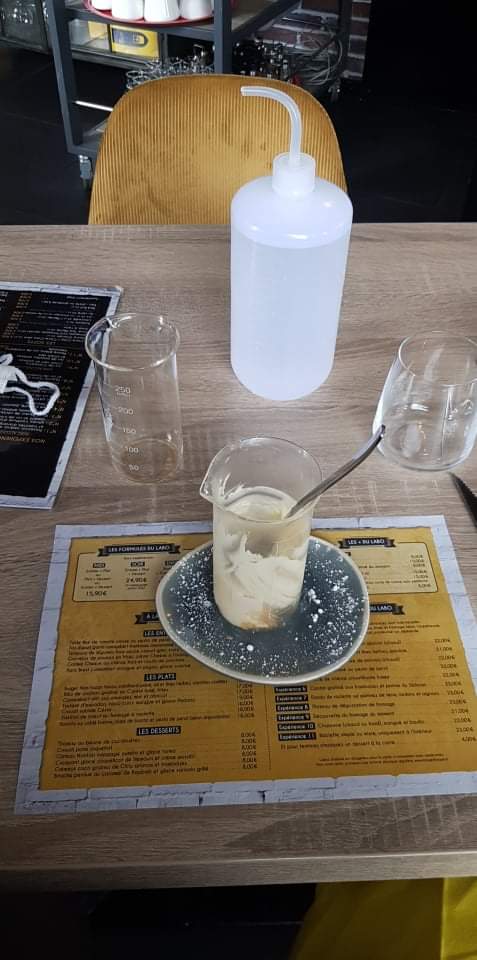 Idée très originale de nous plonger dans l'univers du laborantin. Le coup d'œil est réussi. Malheureusement je n'ai pas apprécié les saveurs (cheescake roquefort et éclair fraises). Bonne chance tout de même auxjeunes restaurateurs qui osent.