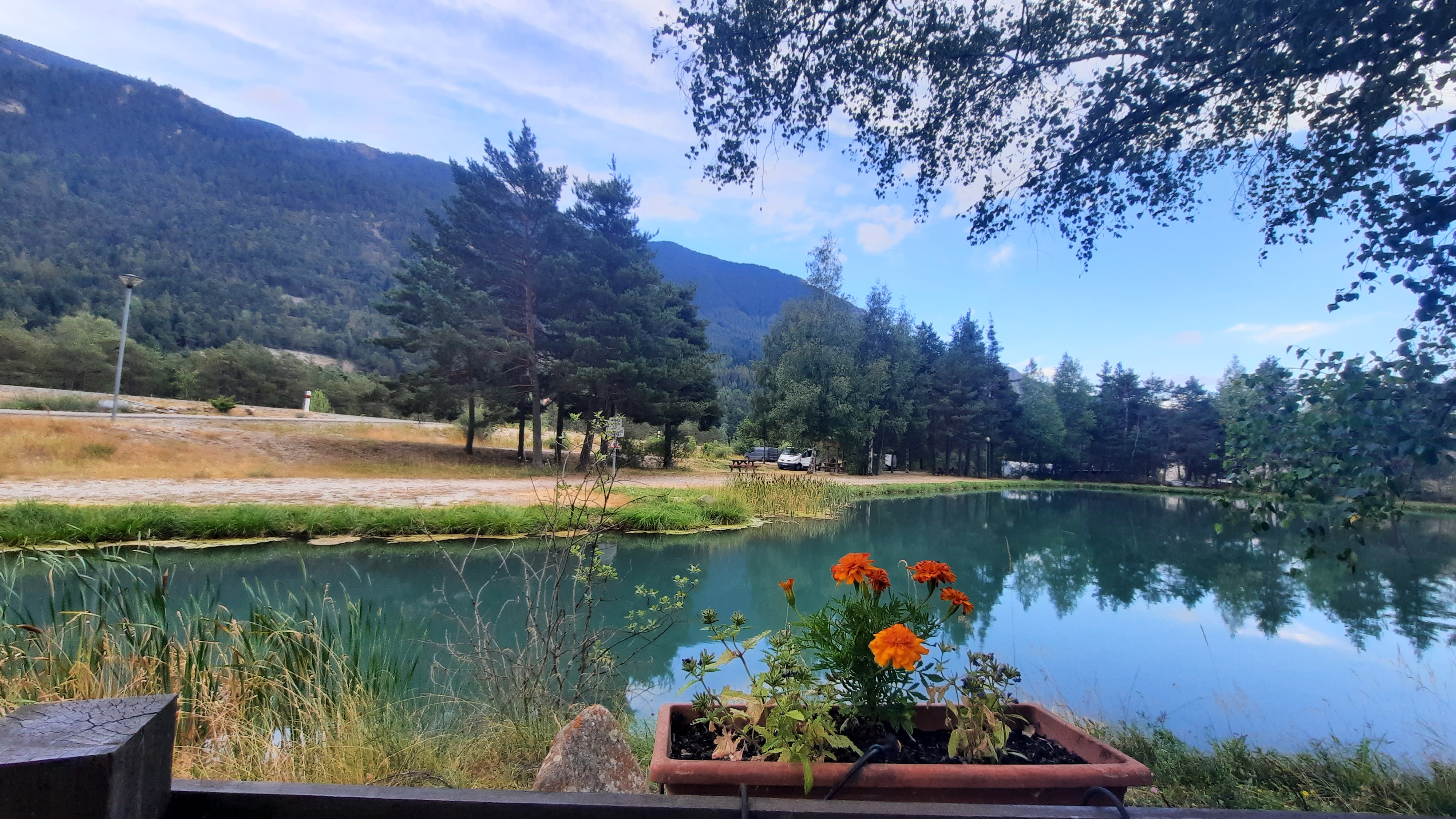 Au bord de l'étang, sous les arbres, un endroit Agréable pour passer un moment a table. La vue sur les montagnes est reposante. Penser a réserver.
