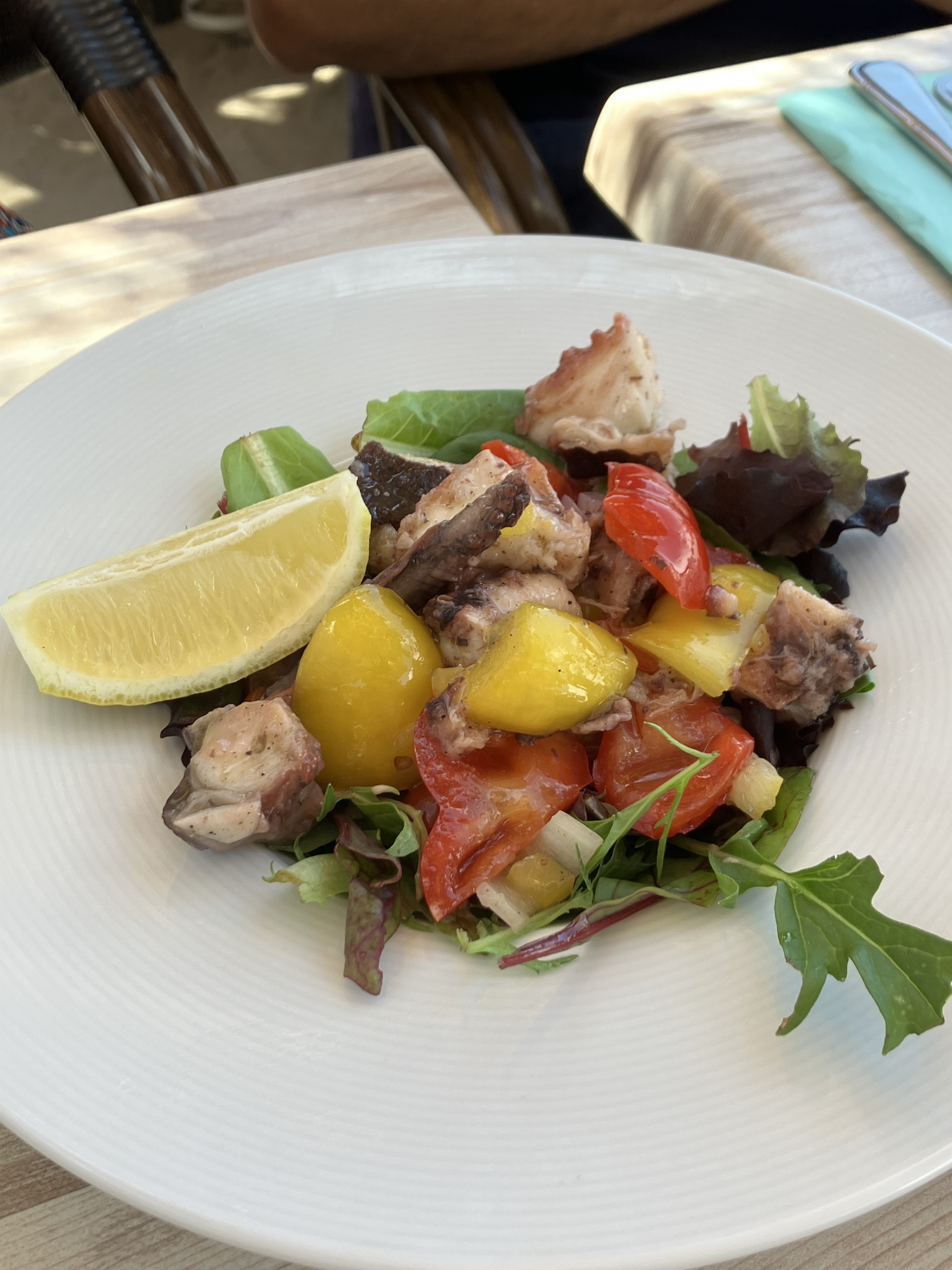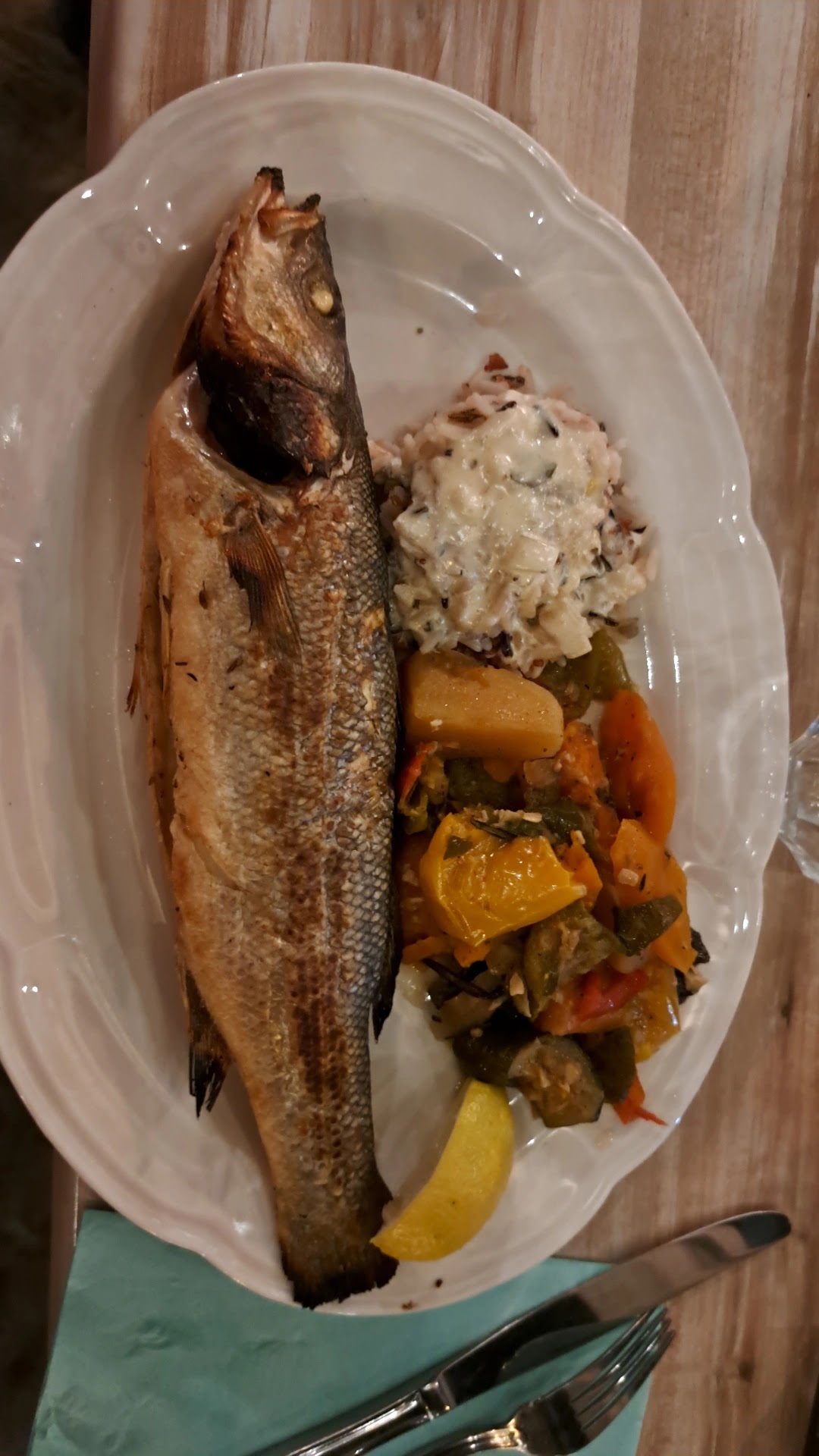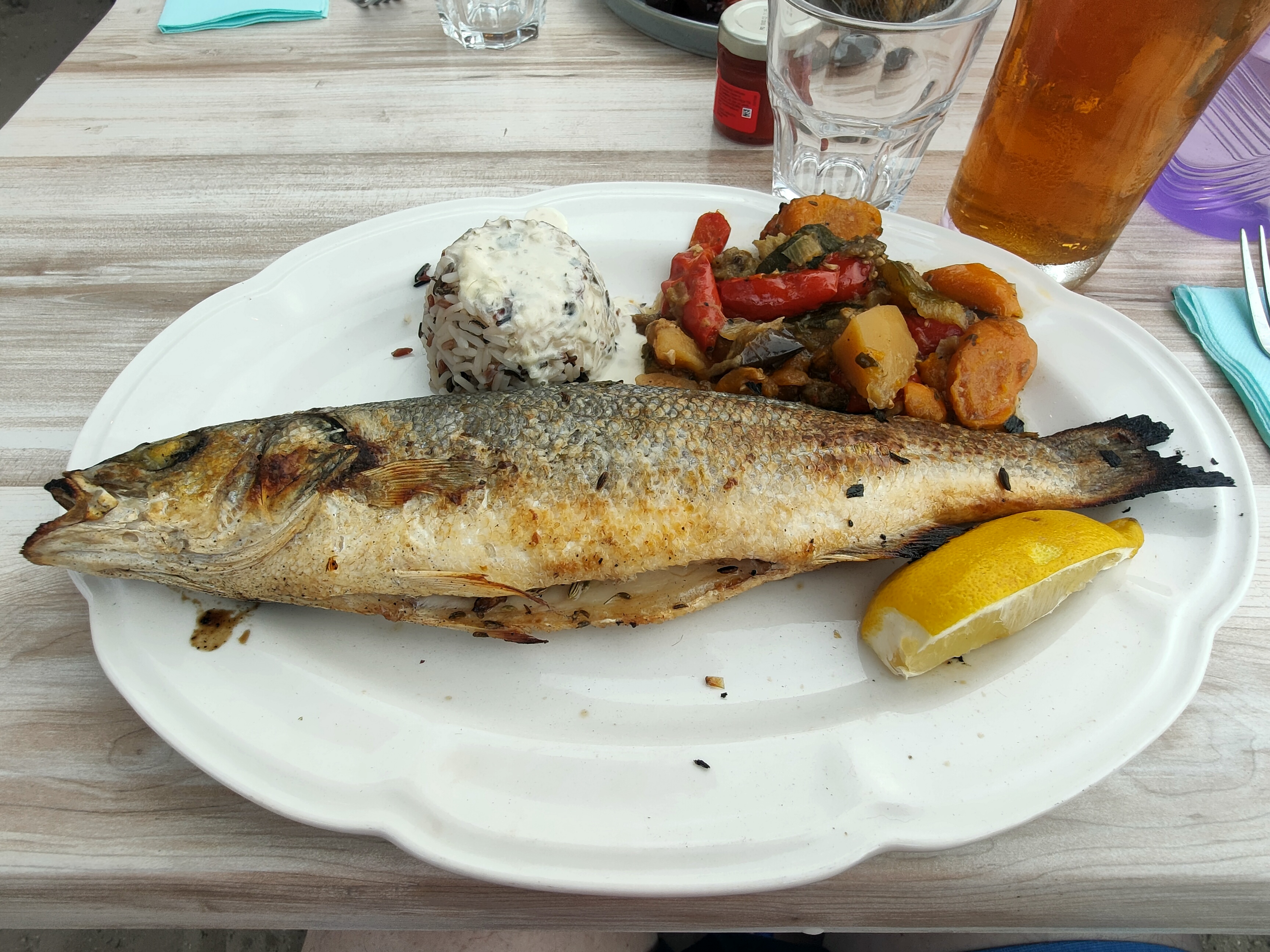 Terrasse sur la plage où notre fille a pu jouer pendant que nous finissions notre dîner. Le loup entier était très bon. Un petit incident sur un plat a été compensé par l'offre du digestif 👍