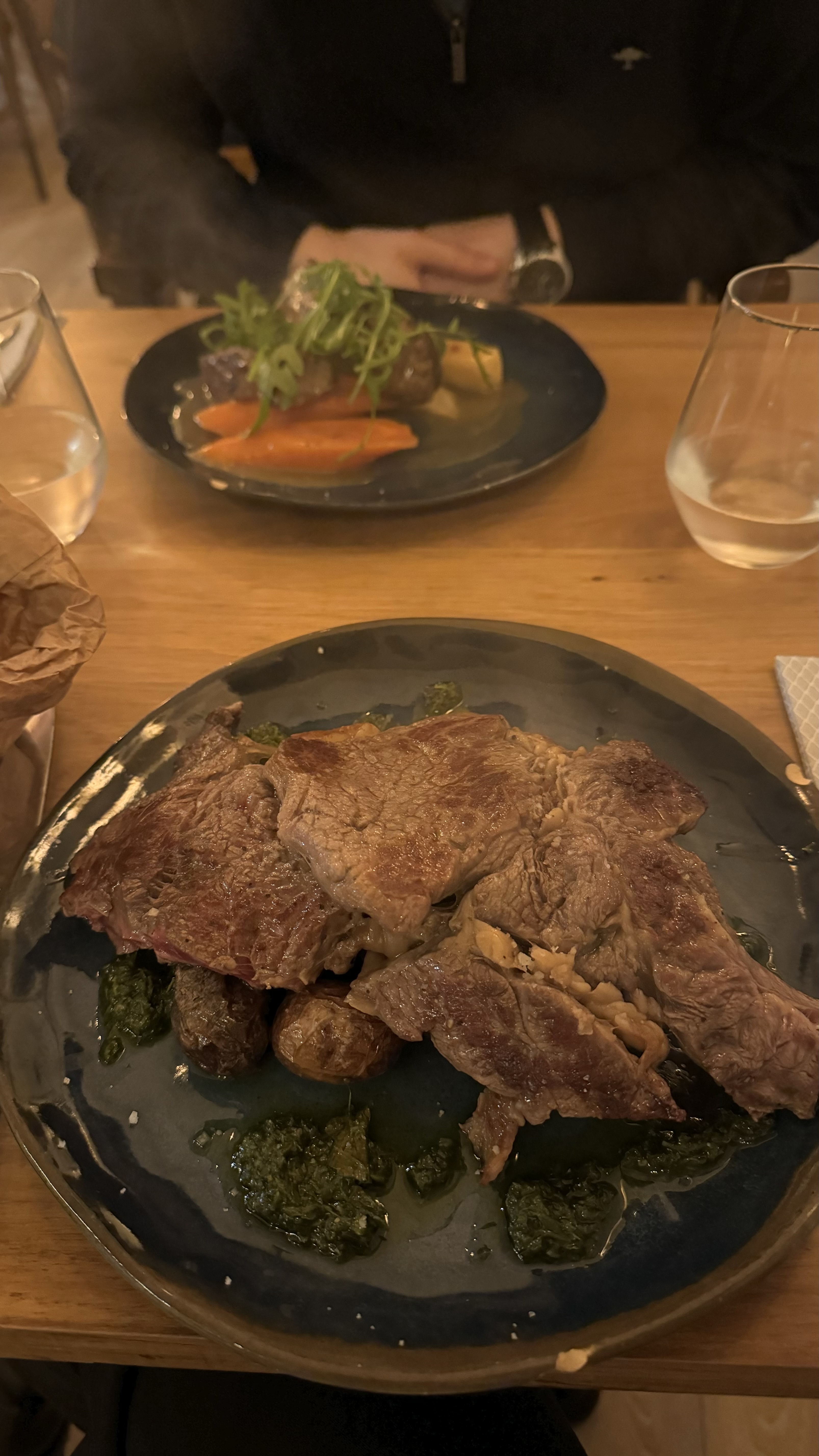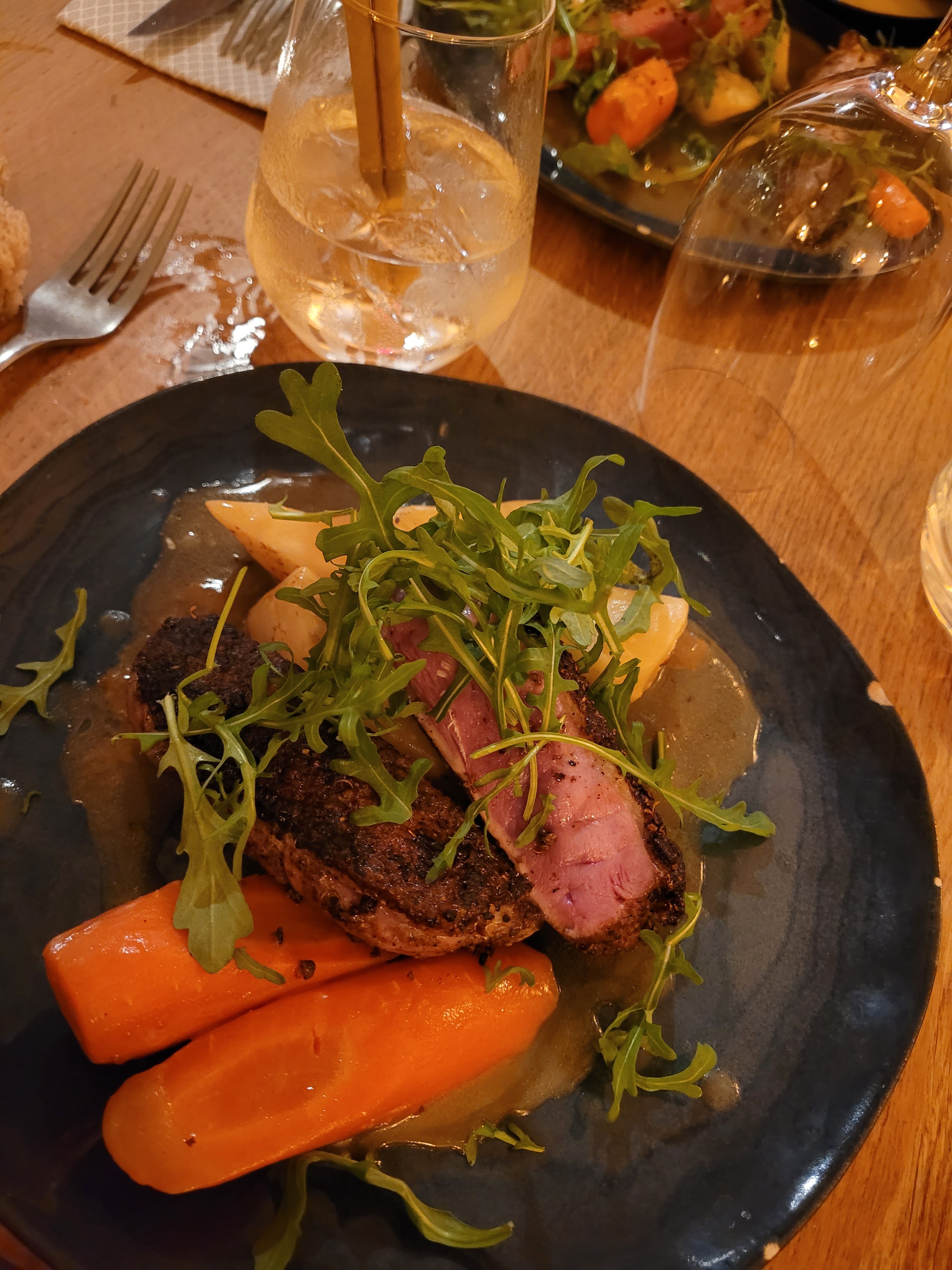 Très déçu. Nourriture sombre sur des assiettes sombres. Aucune signature du Chef. Juste de la viande, des patates au four et une salade bercée. De plus, les autres assiettes des autres invités n'avaient pas l'air très bonnes. Le service était bas, pas de touche personnelle, pas de musique et le bar était en désordre. On aurait dit que ce n'était pas leur nuit. Manger dans un bouillon moins cher, c'est mieux et plus agréable. S'il vous plaît, faites plus attention à l'apparence d'une assiette, changez vos assiettes et mettez-y de la couleur. Une attention plus personnelle envers les invités.