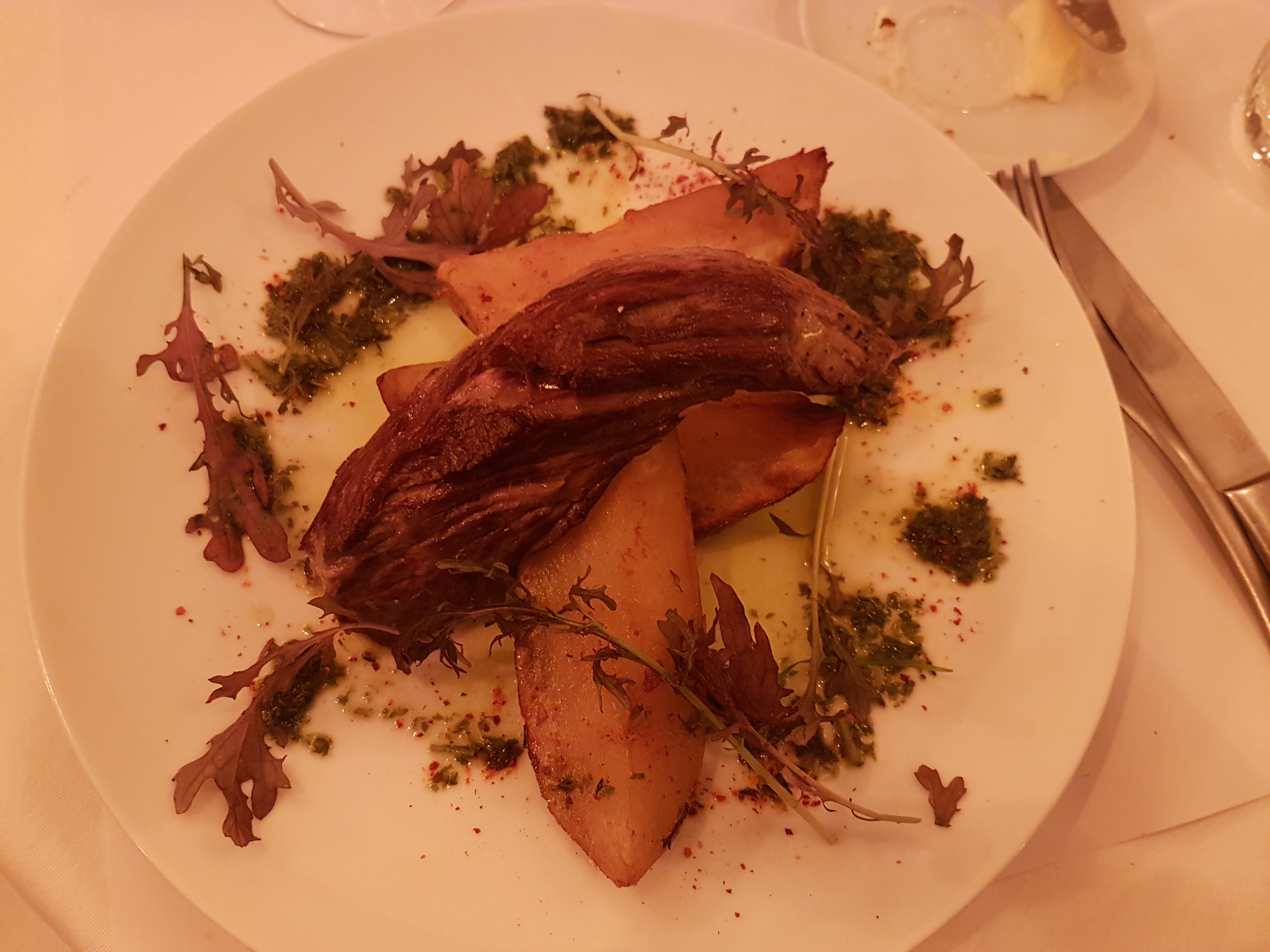 Il y a de l'idée, mais malheureusement les plats choisis n'ont pas eu l'effet escompté. L'entrée avec les croquettes de veau etait délicieuse, en revanche le filet de canette malheureusement un peu trop rosé et surtout avec de l'anis sur la peau qui venait perturbé le goût. Pour le dessert, la garniture de la pavlova était là aussi très bonne, mais la coque de meringue etait quant à elle immangeable car trop cuite, donc molle et collante. Dommage, car on sent qu'il y a de l'idée, mais la maitrise n'est pas au rendez-vous.