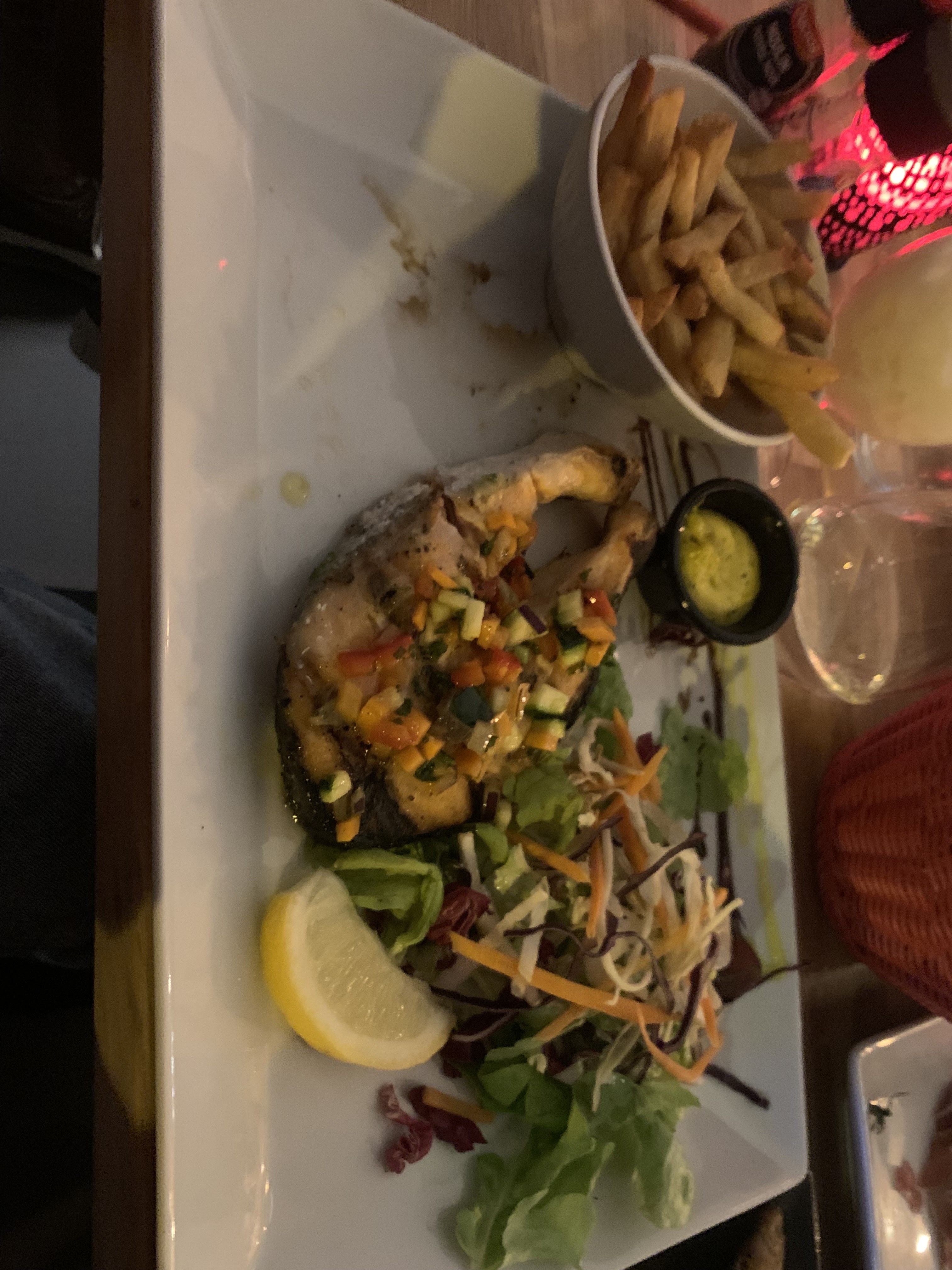 Saumon grillé à la plancha Pas mariné ni salé rien de rien Part contre l accompagnement de purée de légumes plutôt pas mal Beaucoup de saveurs en bouche Mais ma plus grosse déception malheureusement a été le baba au rhum le gâteau était vraiment mais vraiment pas terrible Voir immangeable pour ma part ! Très dommage car le restaurant est bien situé er le cadre est super 👍🏻