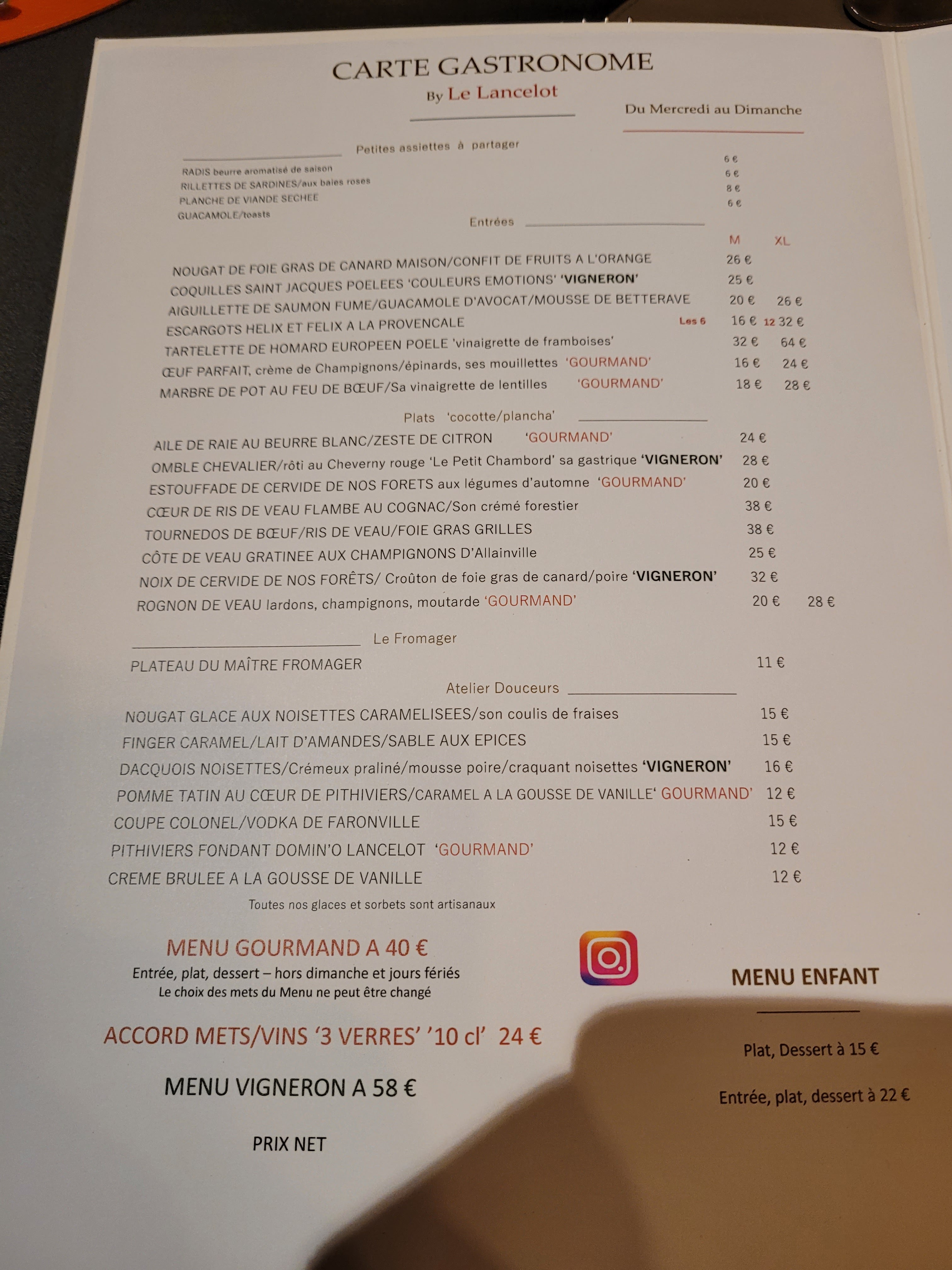 Il est dommage que le week-end on n'ait plus que le choix entre la carte et un menu à 34 euros avec très très peu de choix. Décevant pour qui a connu le Lancelot et ses menus généreux. La qualité est toujours au rendez vous mais le choix dans les plats fait augmenter notablement l'addition. Un menu un peu plus diversifié et donc un peu plus cher que le seul proposé aurait toute sa place.