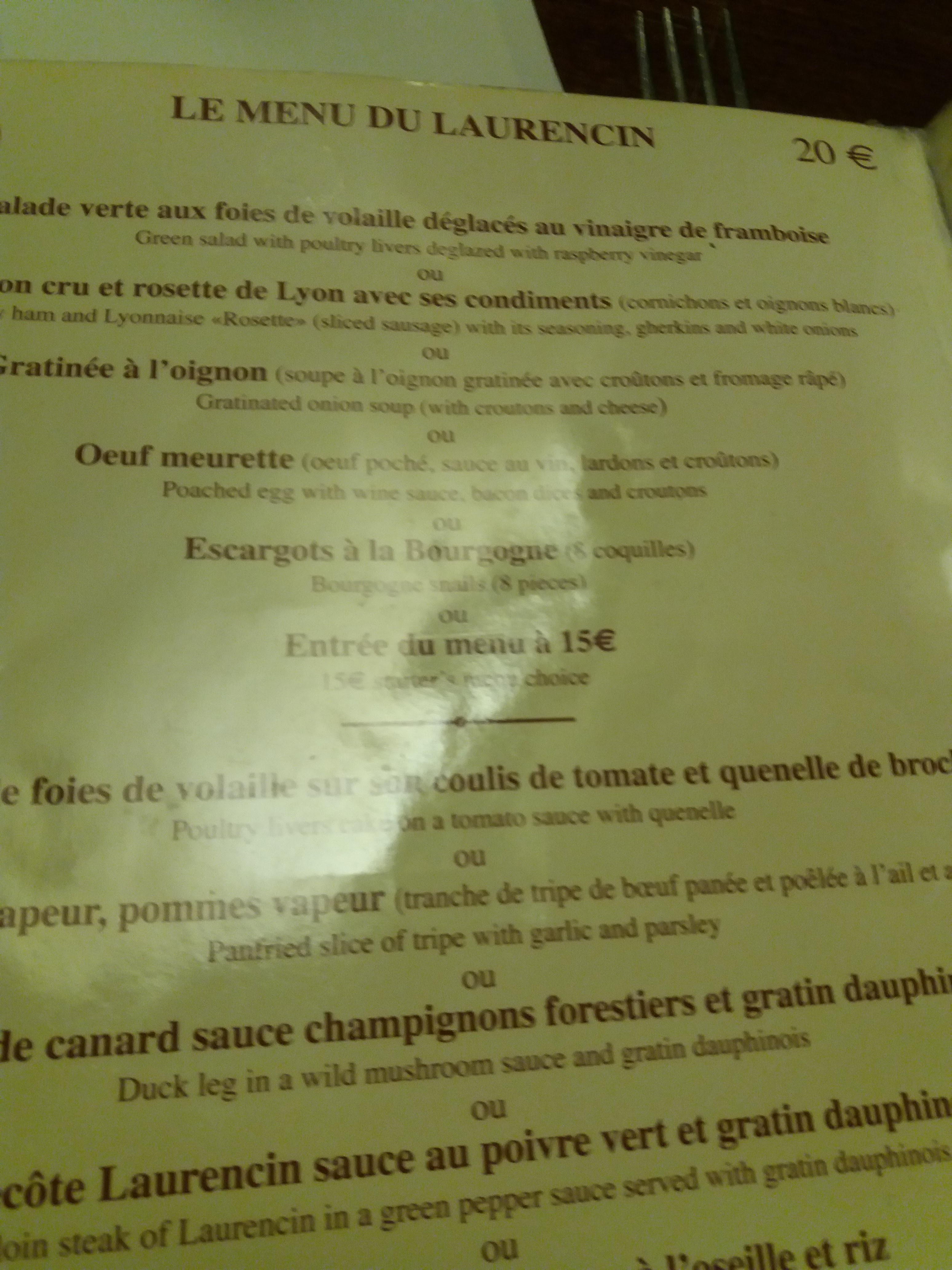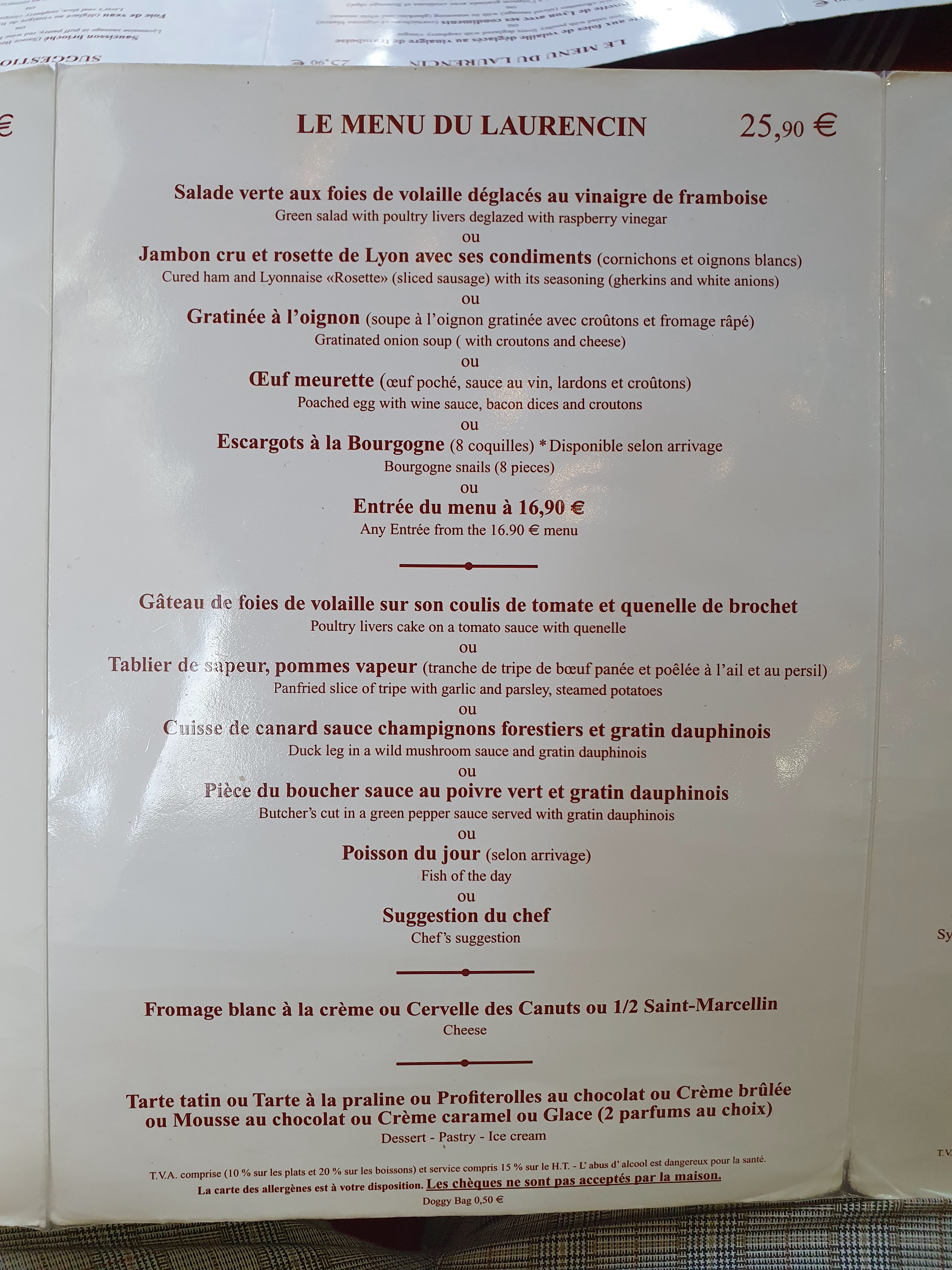 Un vrai bouchon lyonnais avec un très bon rapport qualité prix, menu complet avec entrée, plat, dessert ou formage (midi et soir) est à 15,9 euros. Nous avons pris l’oeuf meurette, gratinée à l’onion, les tripes à la sauce tomate et quenelle, cervelle de canuts… c’était bon et le service est rapide et chaleureux ! En plus, la maison Laurencin est construite en 16eme siècle. Charmante et ancienne ! Je vous recommande.