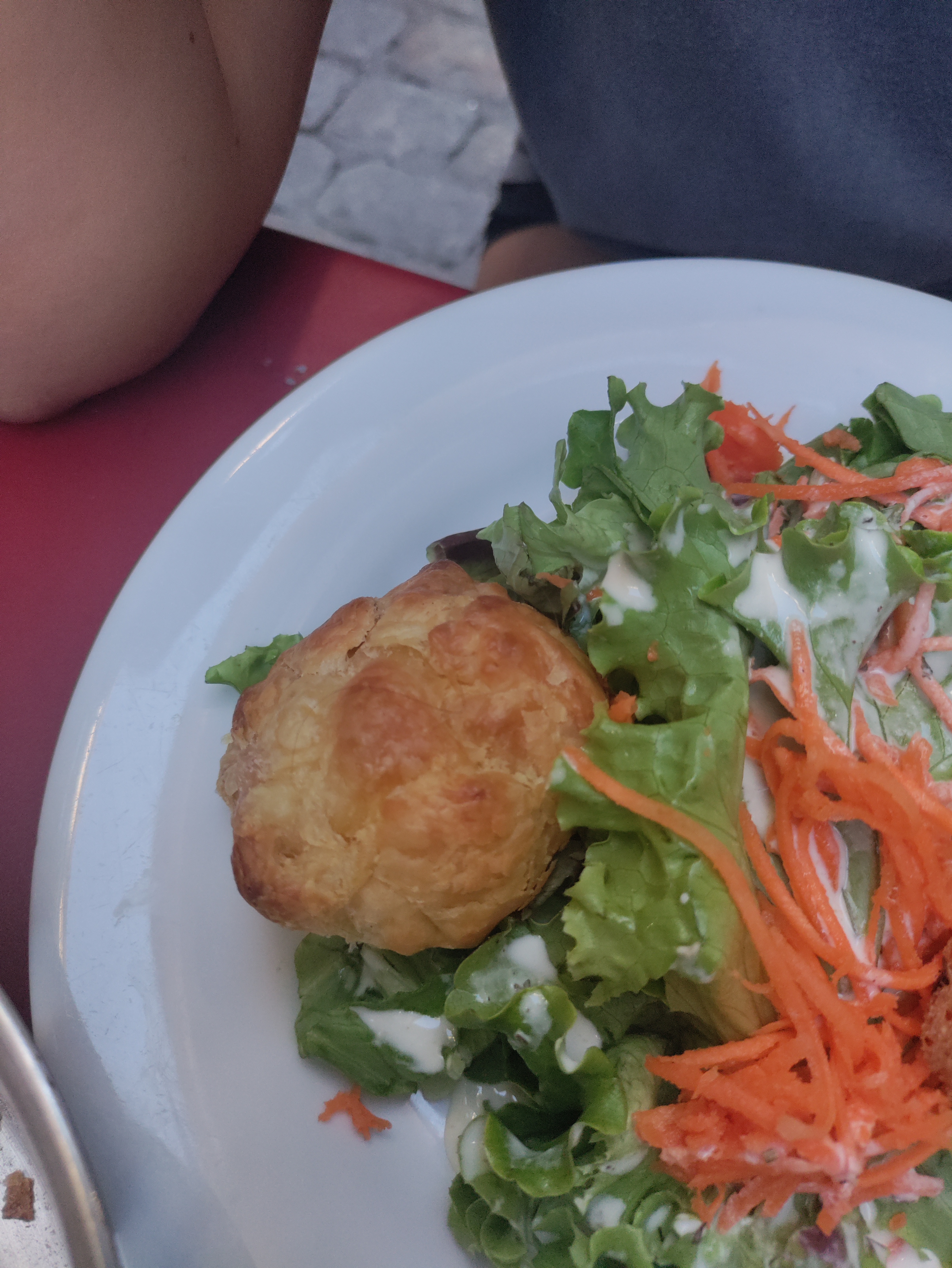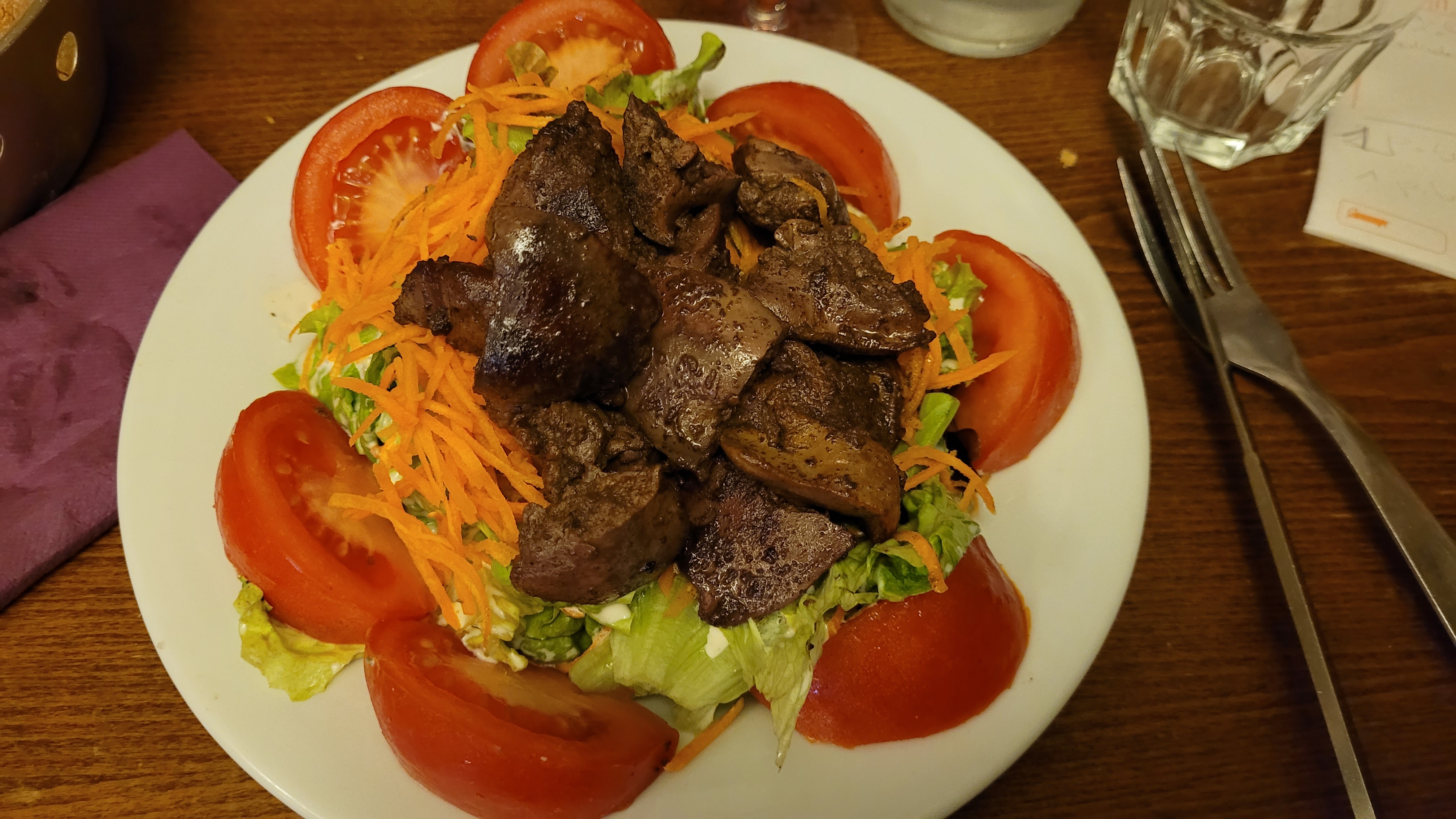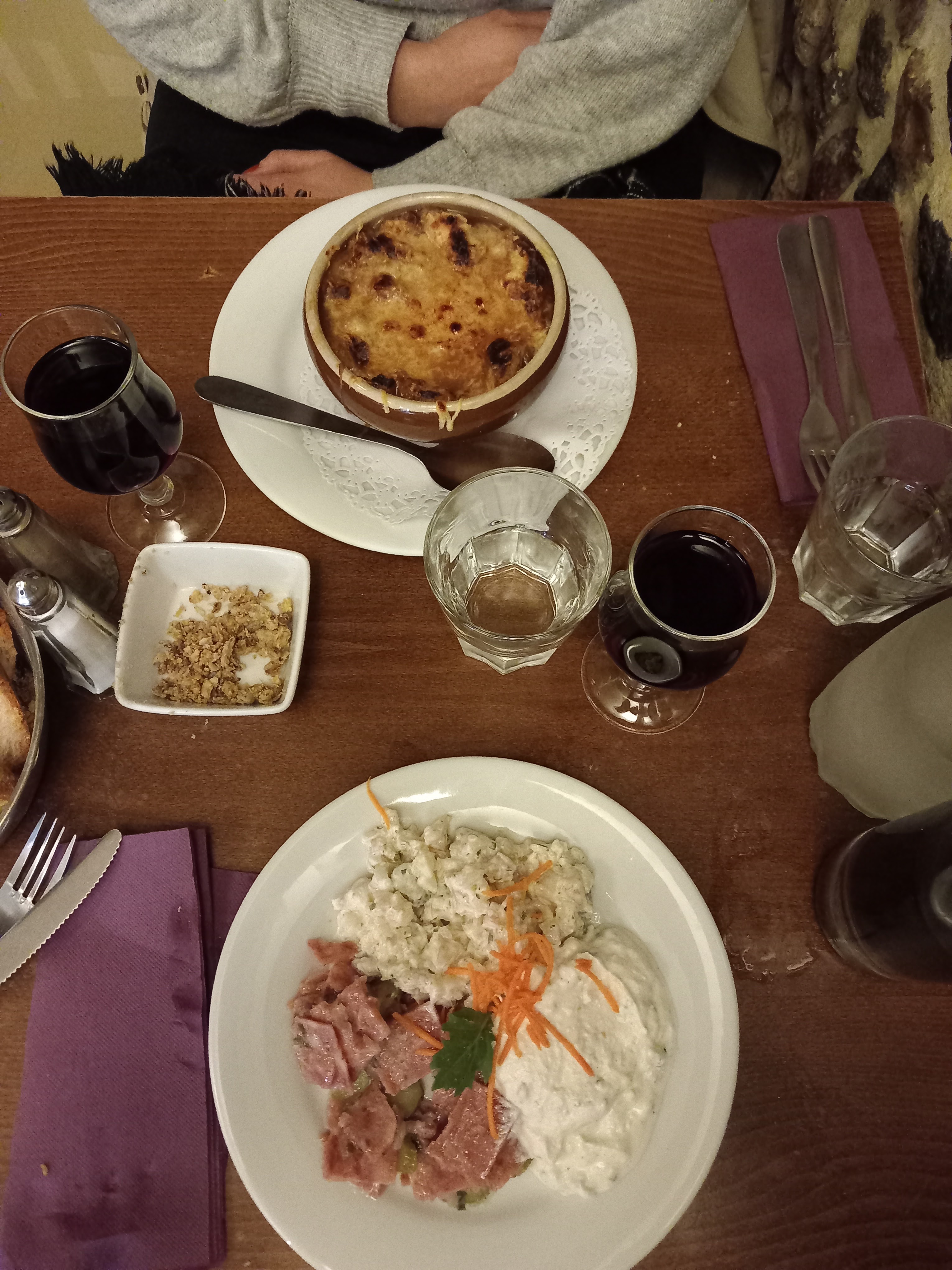 La gratinée aux oignons est délicieuse, mais la salade n'était pas fraîche. La salle est petite, ce qui rend la circulation difficile et il y a peu de place pour les grandes jambes.