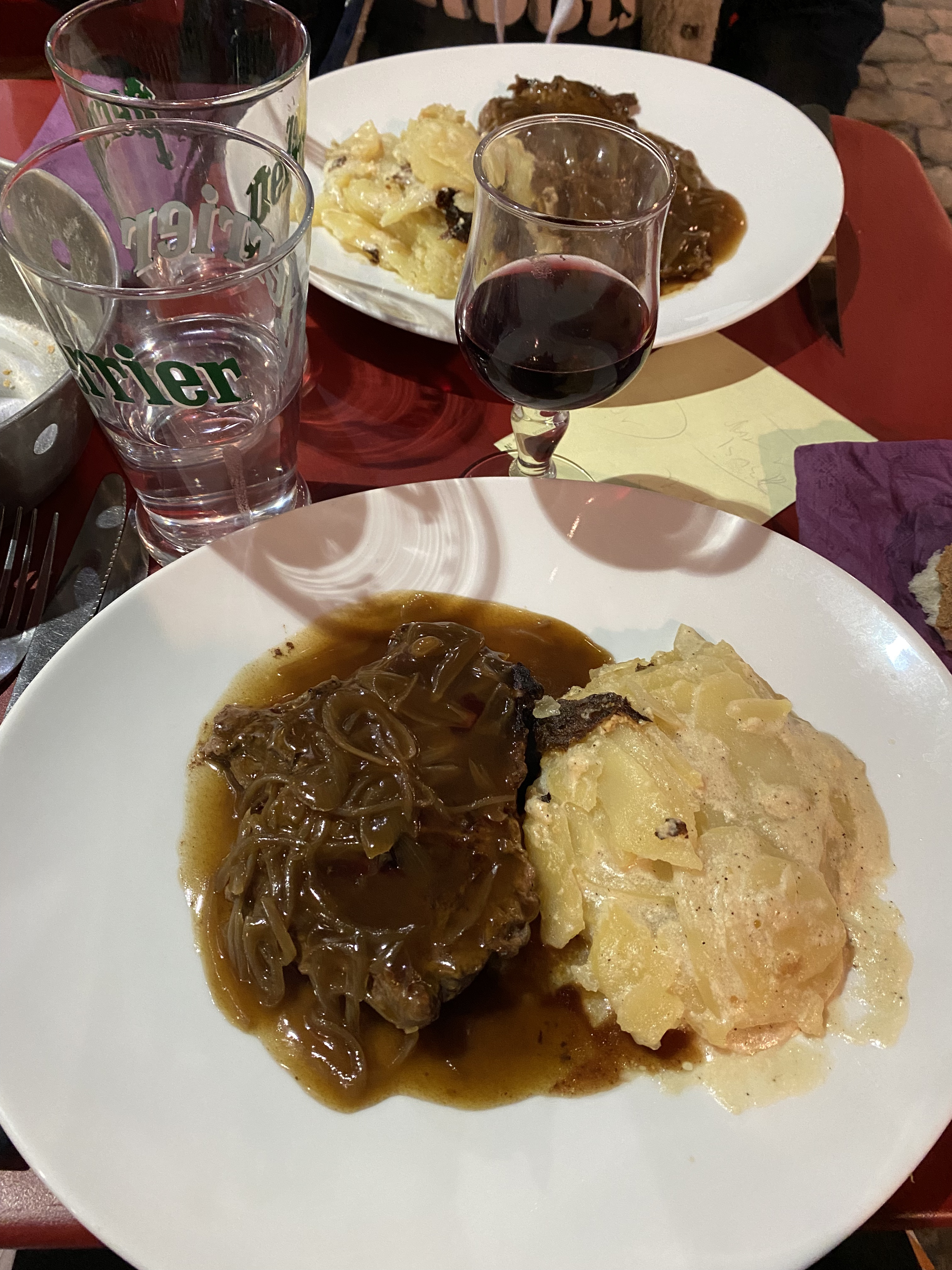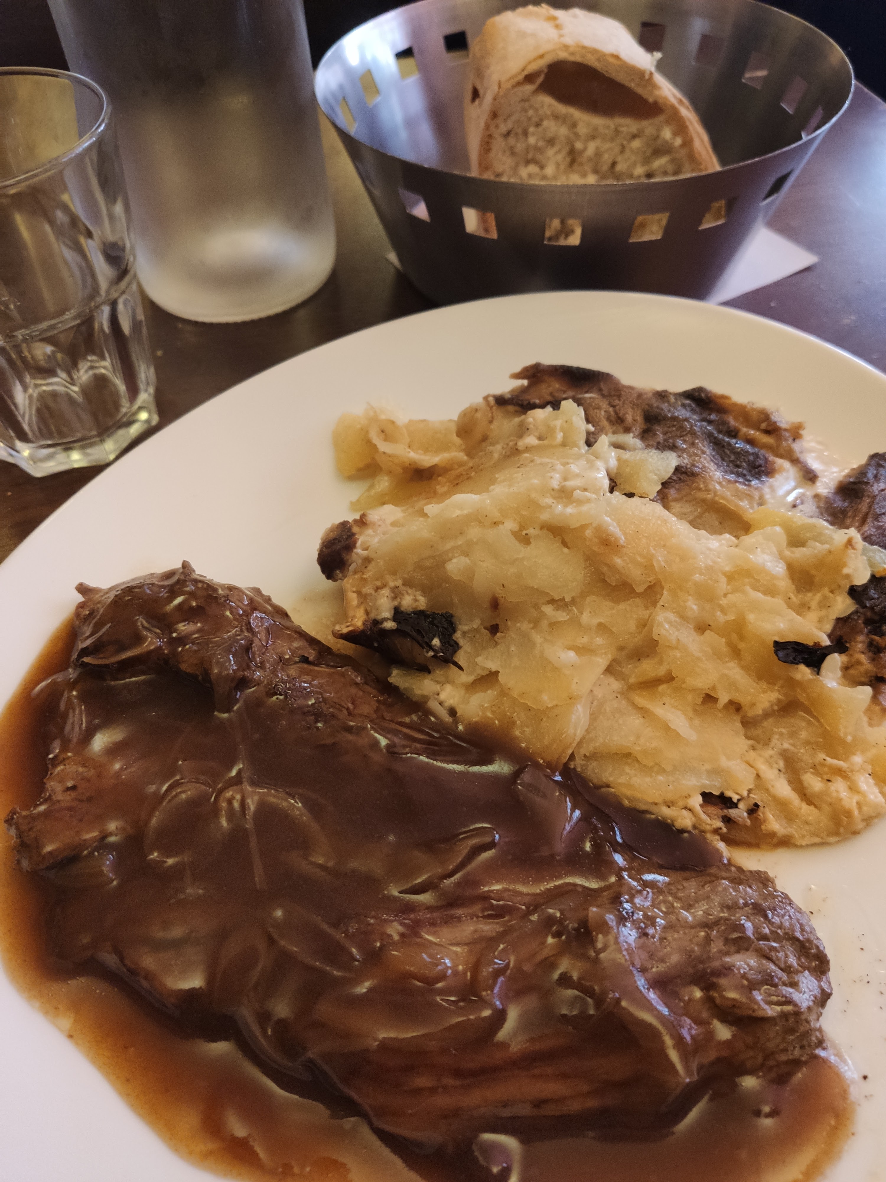J'ai pris la salade lyonnaise, la bavette avec le gratin dauphinois et la tarte tatin. La salade était très bonne, la viande parfaitement cuite, la sauce aux échalottes excellente, le gratin dauphinois était bon aussi, bien qu'un peu trop gras à mon goût, et la tarte tatin avec la boule de glace était parfaite aussi. Le service était rapide, parfois presque trop, j'avais à peine mangé la dernière bouchée de salade qu'on m'a débarassée pour m'amener la suite. Je mettrais cependant un gros bémol sur la présentation, je trouve que visuellement l'assiette ne donnait absolument pas envie (surtout pour le plat principal). Mais globalement j'ai été étonnée en bien parce que pour un prix si bas je ne m'attendais pas à manger autant et autant bien. Donc en résumé : C’est visuellement pas particulièrement joli mais c'est excellent, les assiettes sont bien remplies et ce n'est vraiment pas cher.