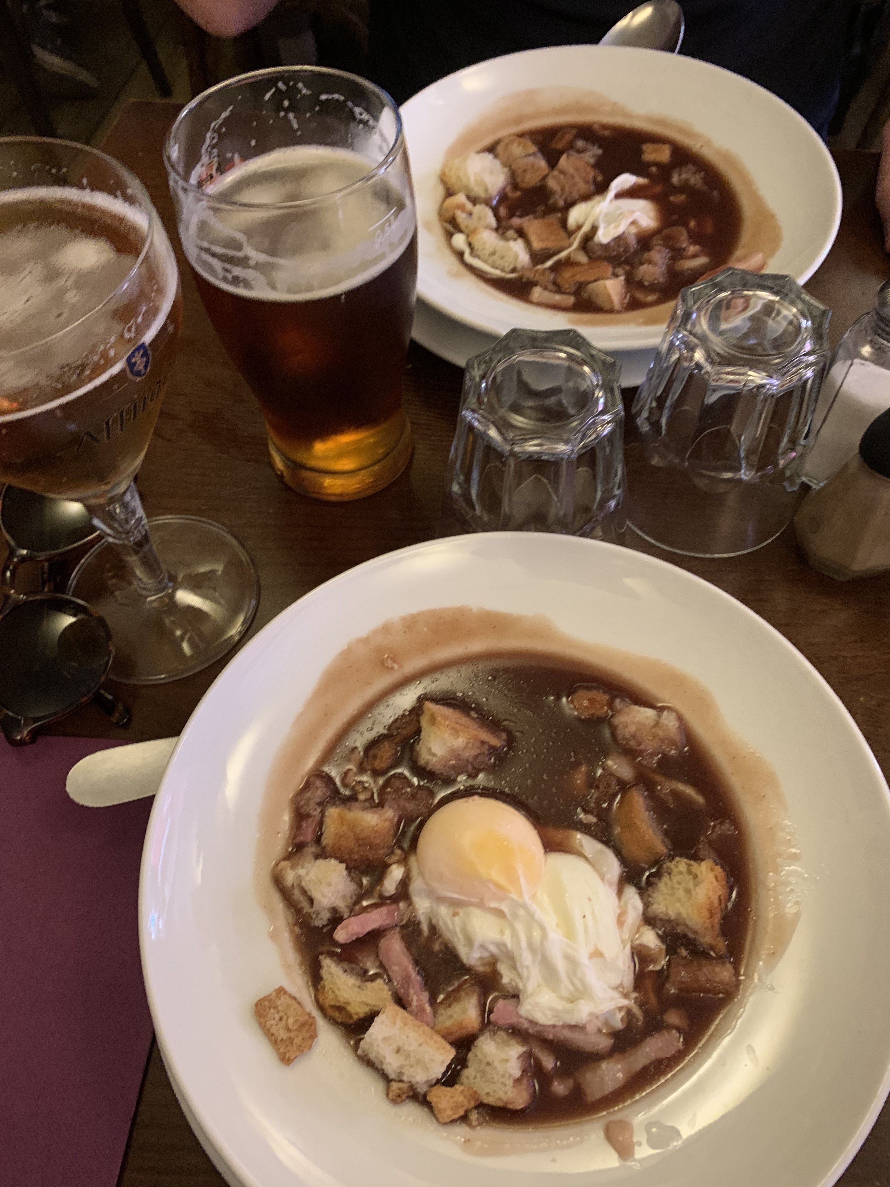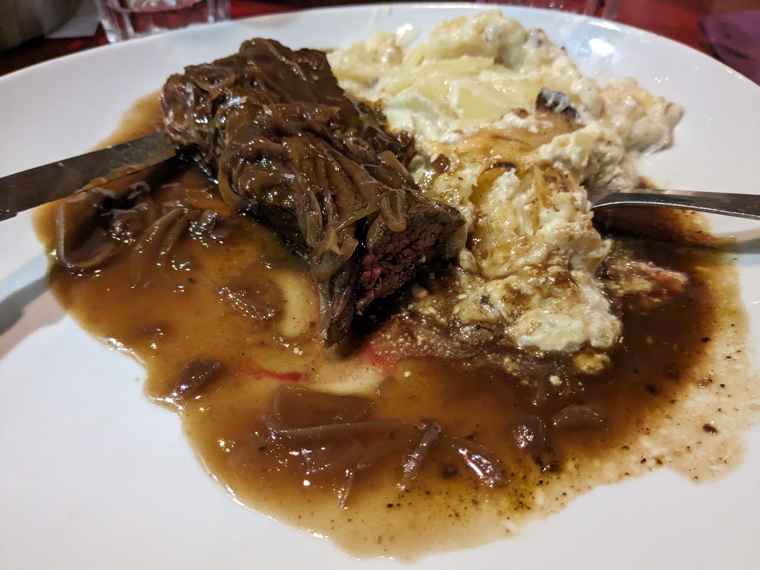 Très bon accueil. Les plats sont toujours aussi copieux. Oeuf meurette avec sa sauce délicieuse. Le gratin de pommes de terre un régal. La viande bien cuite. Il n'y à plus trop de place pour les desserts mais nous nous sommes laissés tenter par la mousse au chocolat et les profiteroles. Les précautions mise en place sont très bien appliquées et l'ambiance est bonne malgré le peu de clients.