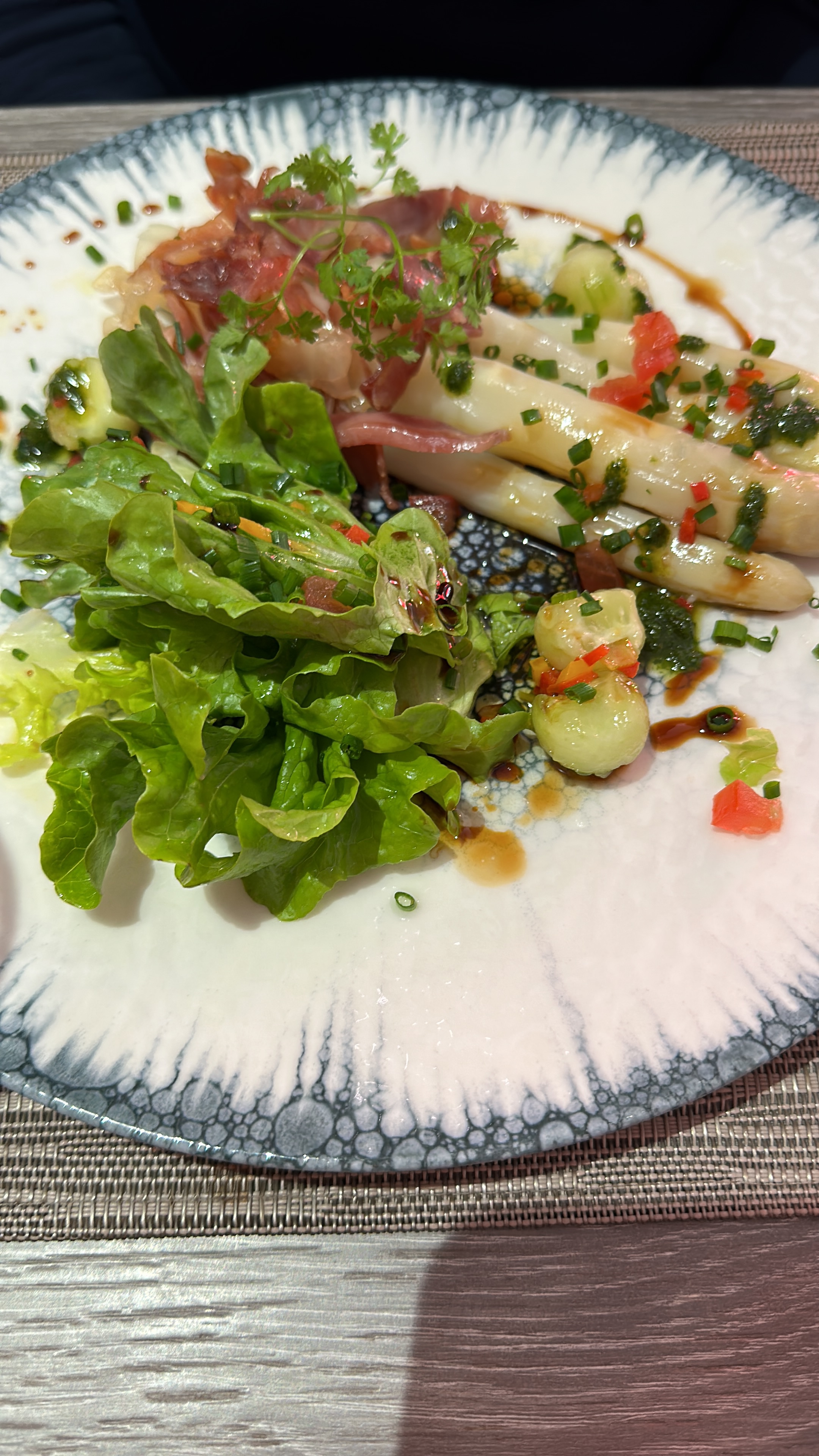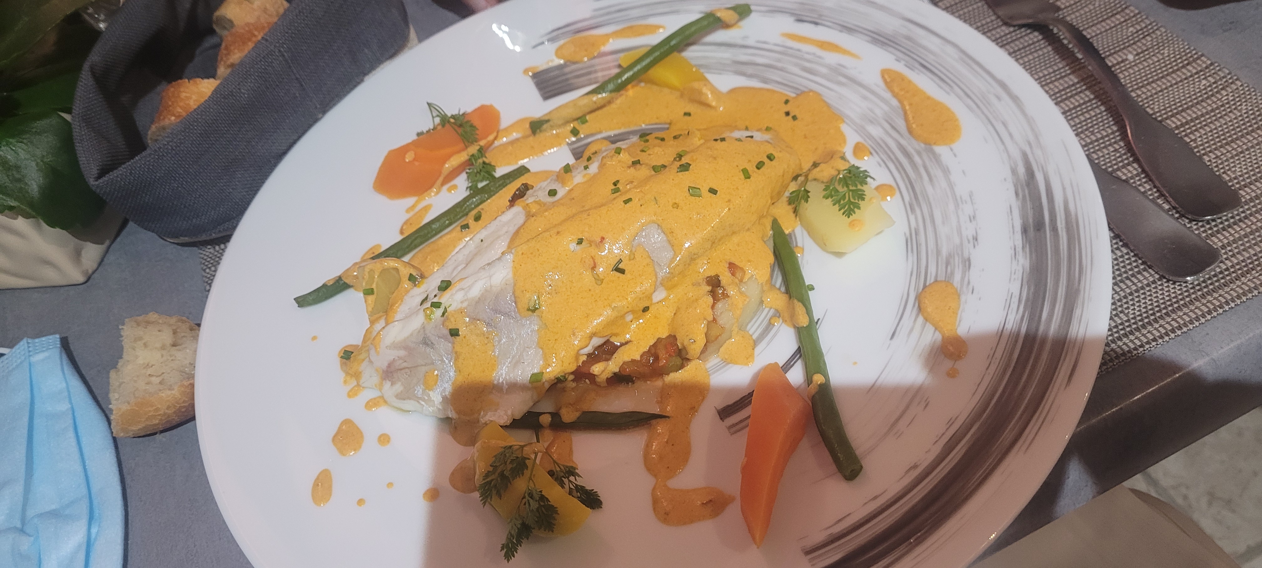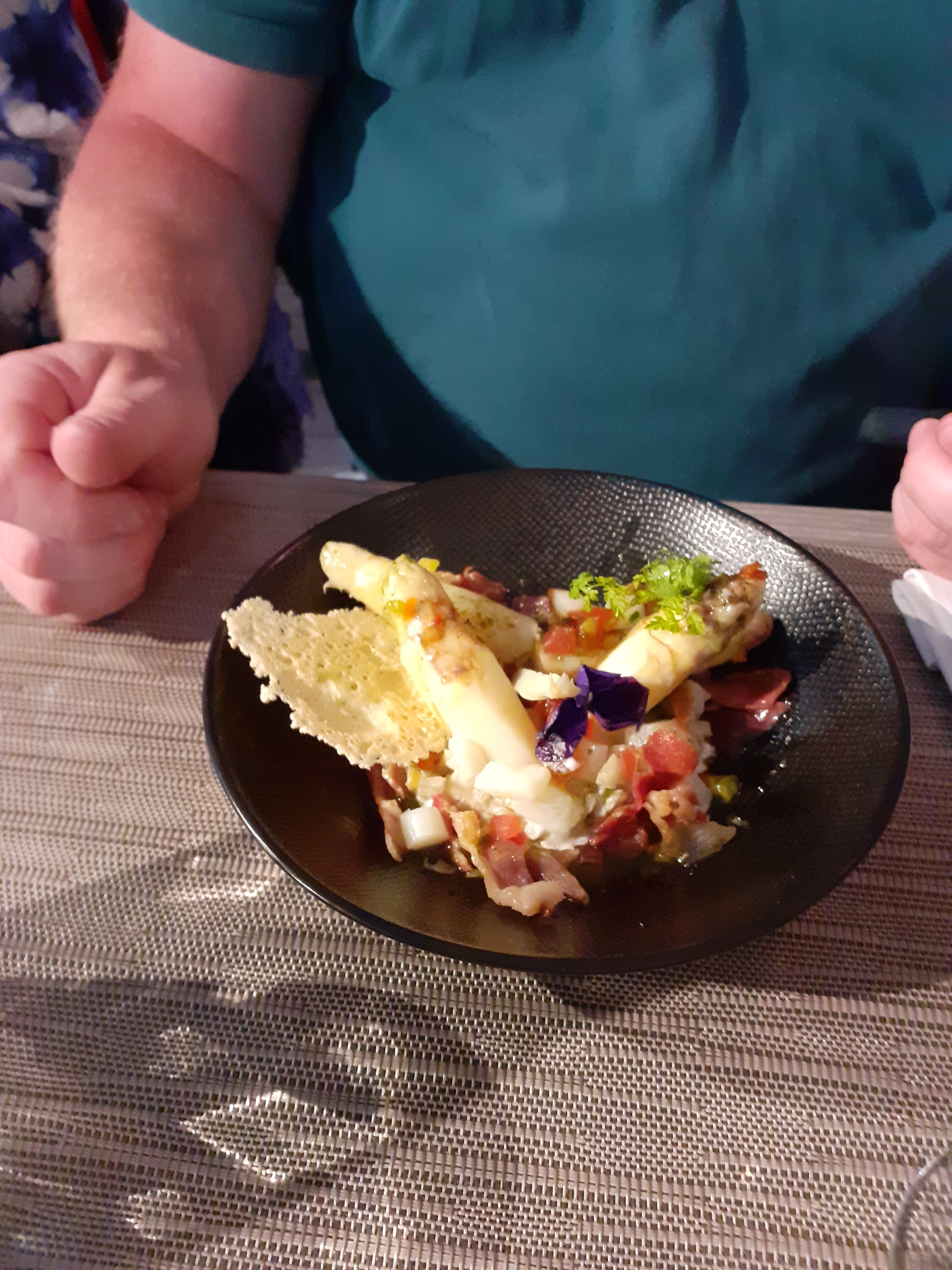 Des Plats qui manquent d'un petit je ne sais quoi. Asperges au jambon cru, avec morceau de plastique de la séparation de jambon sous vide. Dos de cabillaud, avec 3 grosses arêtes, donc plus filet..... .. bref j'ai connu mieux !