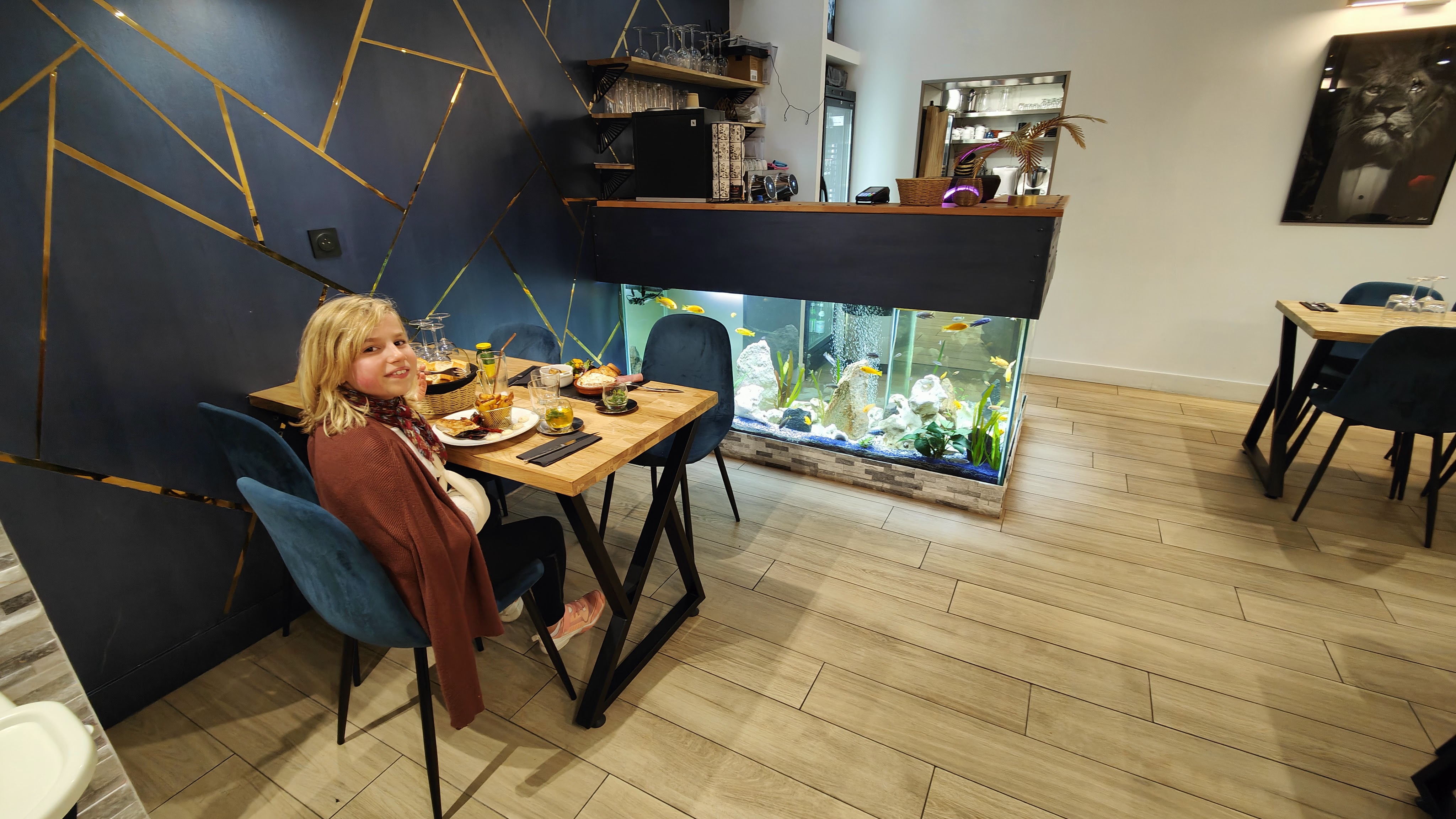 Nous avons été super bien accueilli. Mes enfants ont beaucoup aimé les poissons. Le lieux est magnifiquement décoré. La personne qui nous a servi était vraiment au top , elle a pris le temps de nous conseiller et de nous expliquer les plats et aussi de discuter avec les enfants. Le cocktail etait tres rafraîchissant. La tapenade offerte etait particulièrement bonne.Les plats étaient délicieux, coup de cœur pour la crème qui accompagnait les crevettes. Concernant le dessert j'ai suivi les conseils et je n'ai pas été déçue. Très belle découverte