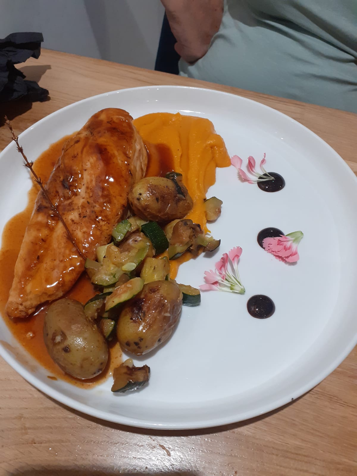 Serveuse adorable et aux petits soins. Cuisine de qualité et belle présentation. Déco chaleureuse et chaises/lumière très jolies Coup de coeur 😍 pour les fleurs, les paillettes ✨ dans la sauce vinaigrée et la petite gelée basilic. Merci 🌷 Estelle 🧙🏻♀️
