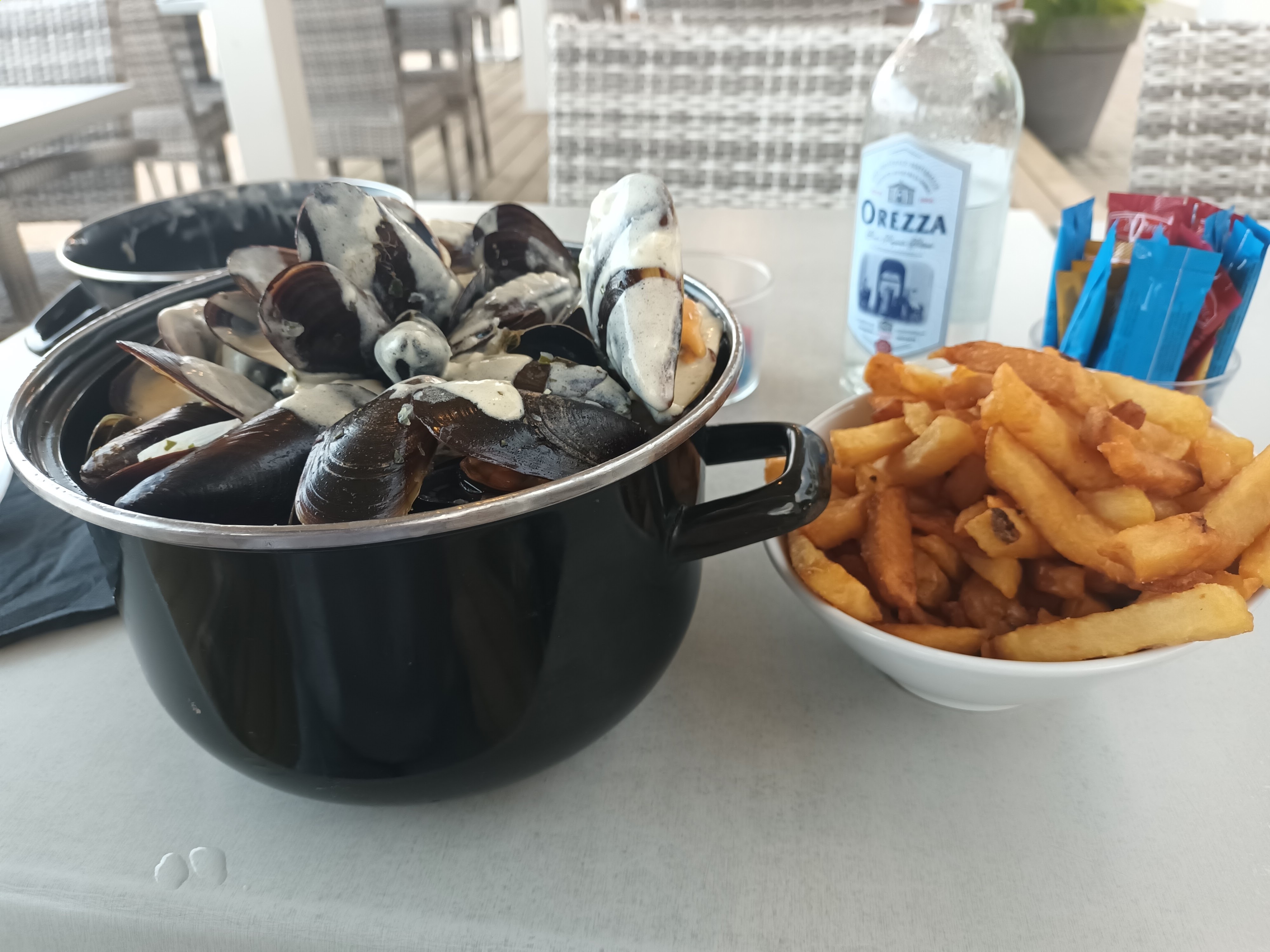 Très bonnes moules de la région. Lieux en bord de mer. Bon menu du jour L'ambiance pourrait être un peu plus élégante. Pizza noire sur le bord. La performance des prix est correcte